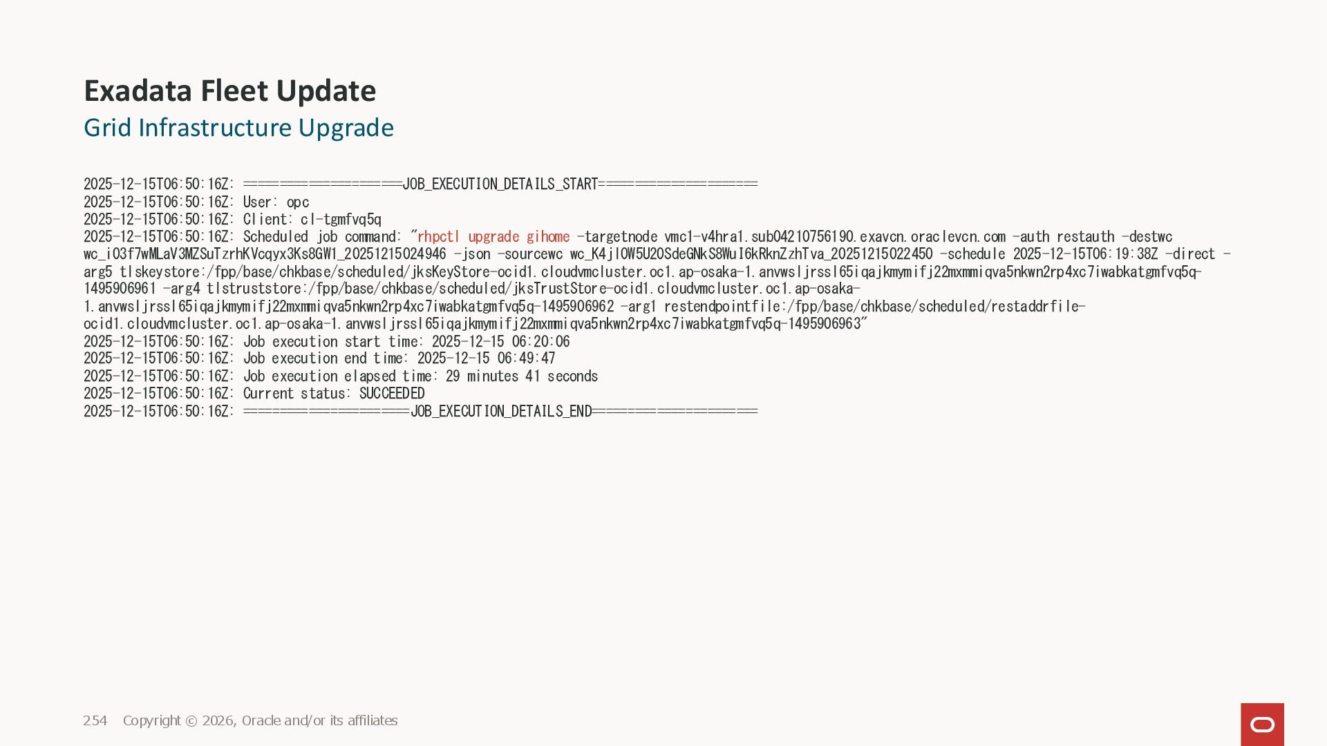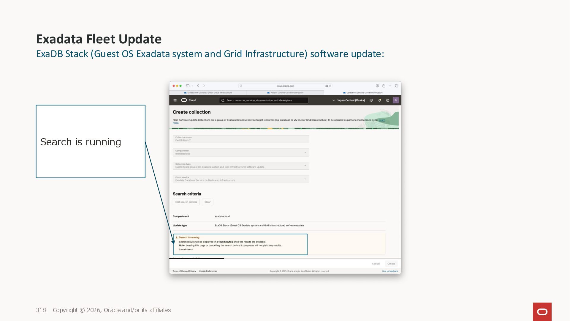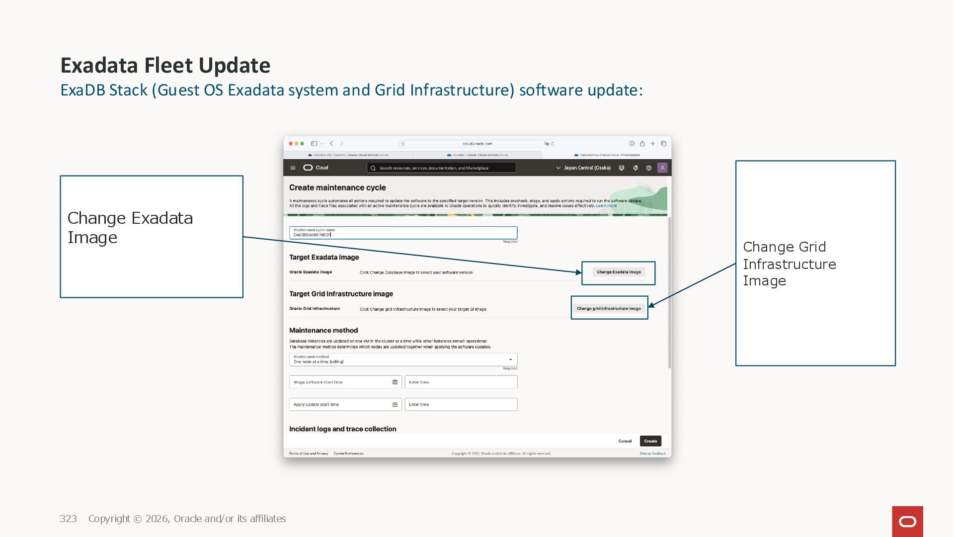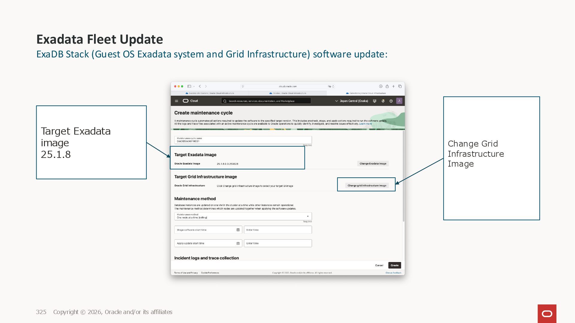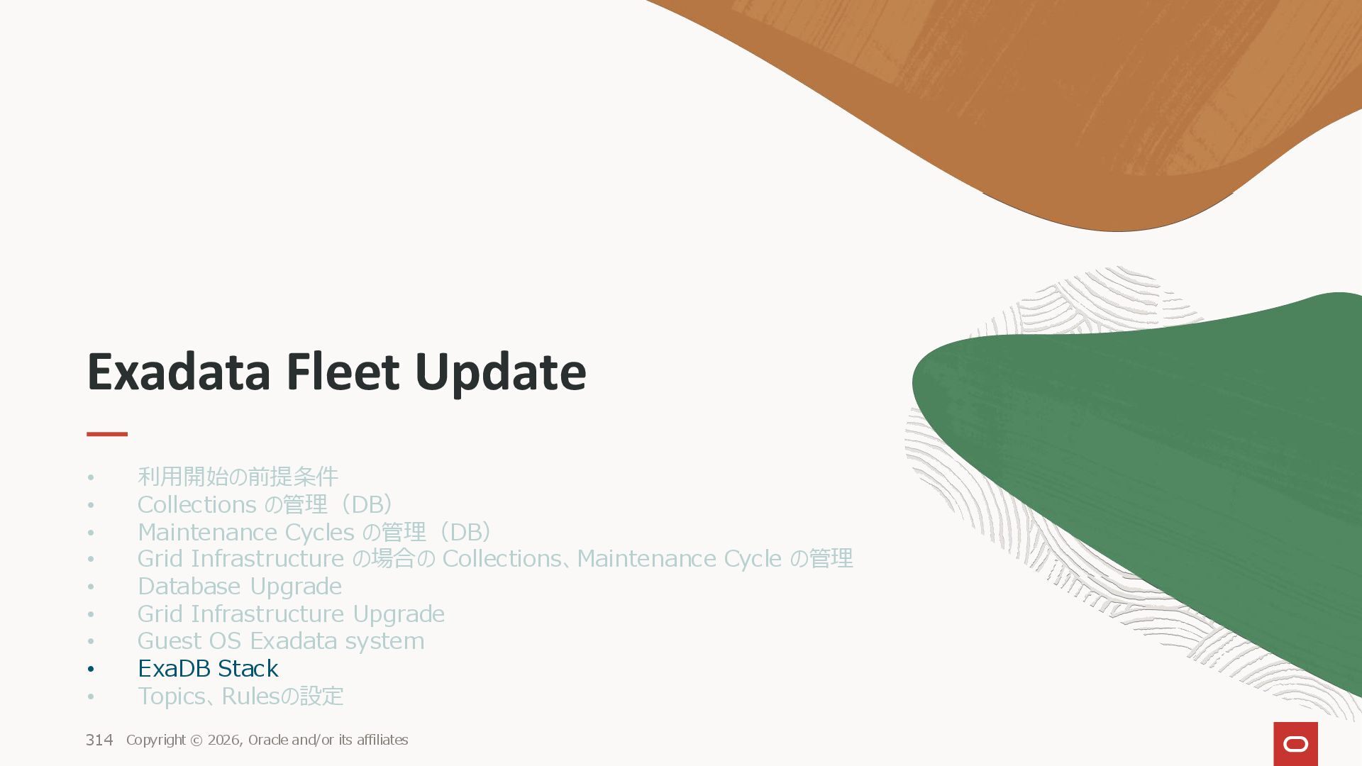 Exadata Fleet Updateは、Oracle DatabaseおよびGrid Infrastructureのパッチ適用エクスペリエンスを簡素化、標準化および強化します。 Exadataフリート更新は、顧客のビジネス・ニーズに基づいてコンポーネントを、特定のメンテナンス・サイクル内の1つのエンティティとしてパッチを適用できるコレクションにグループ化することで、これを実現します。