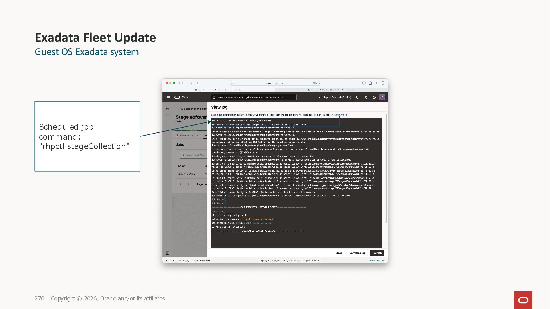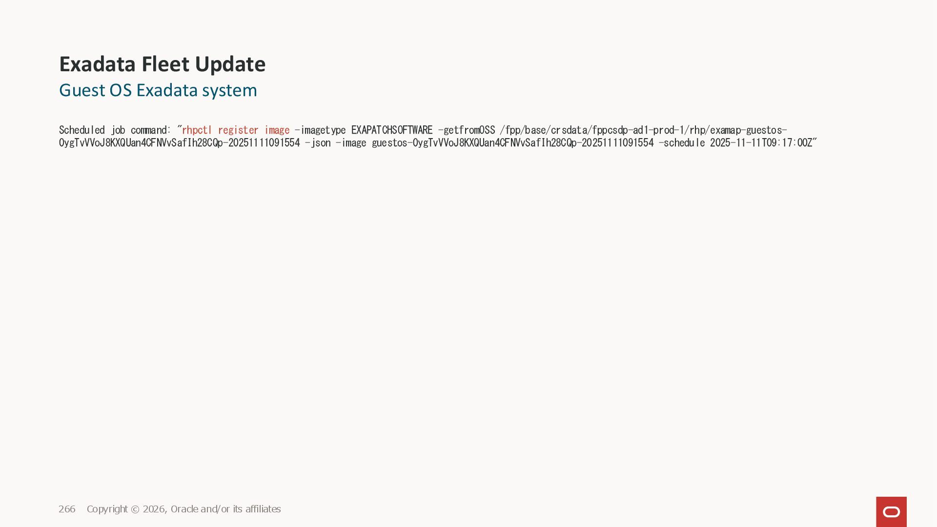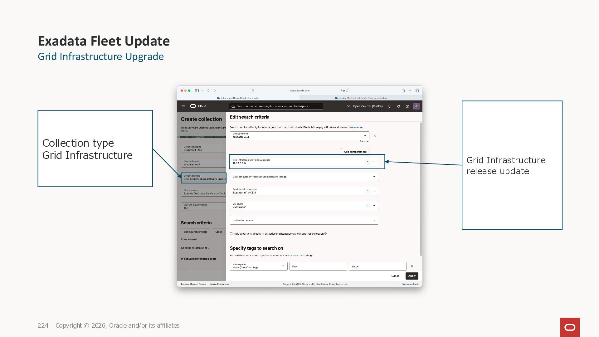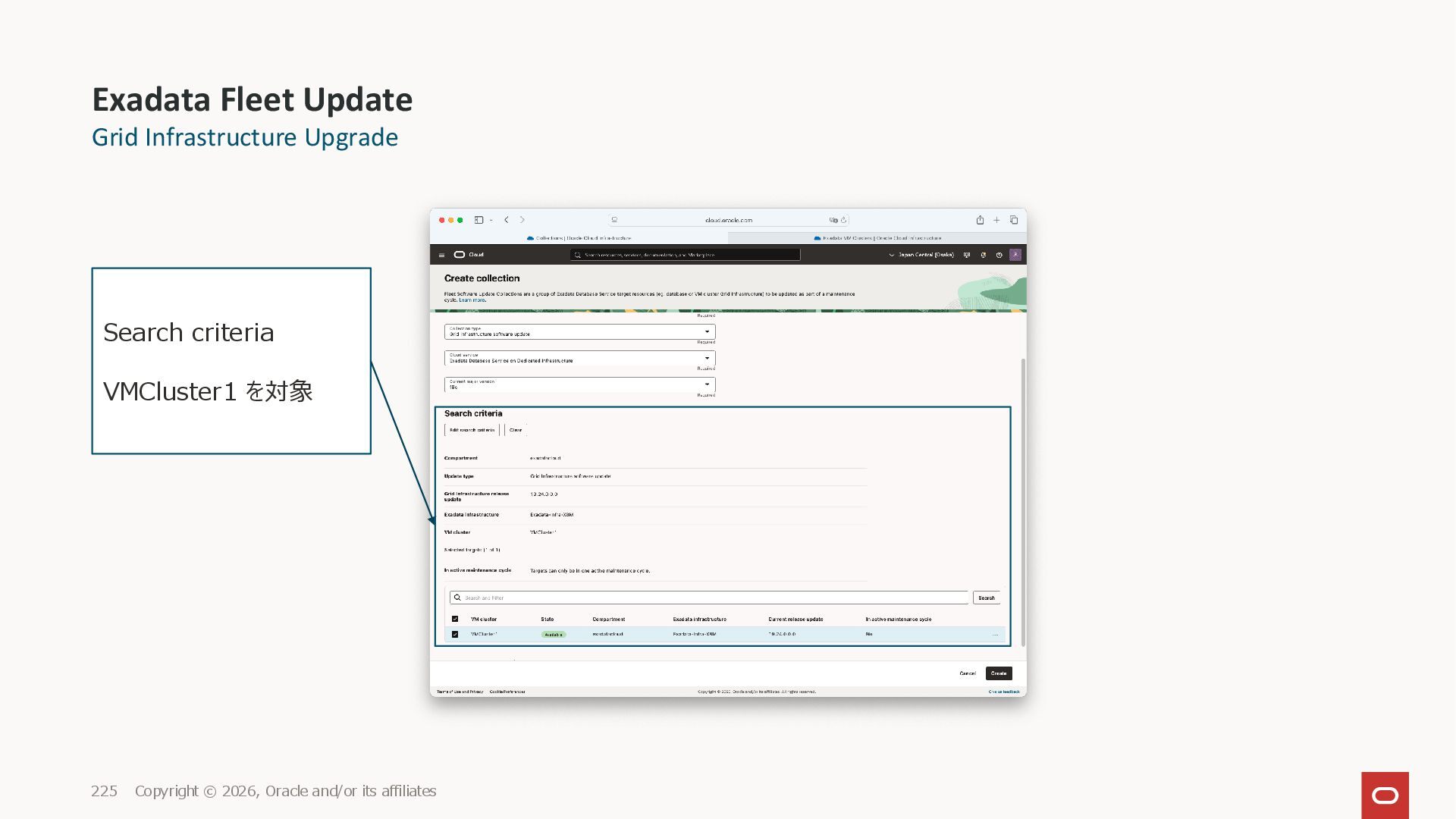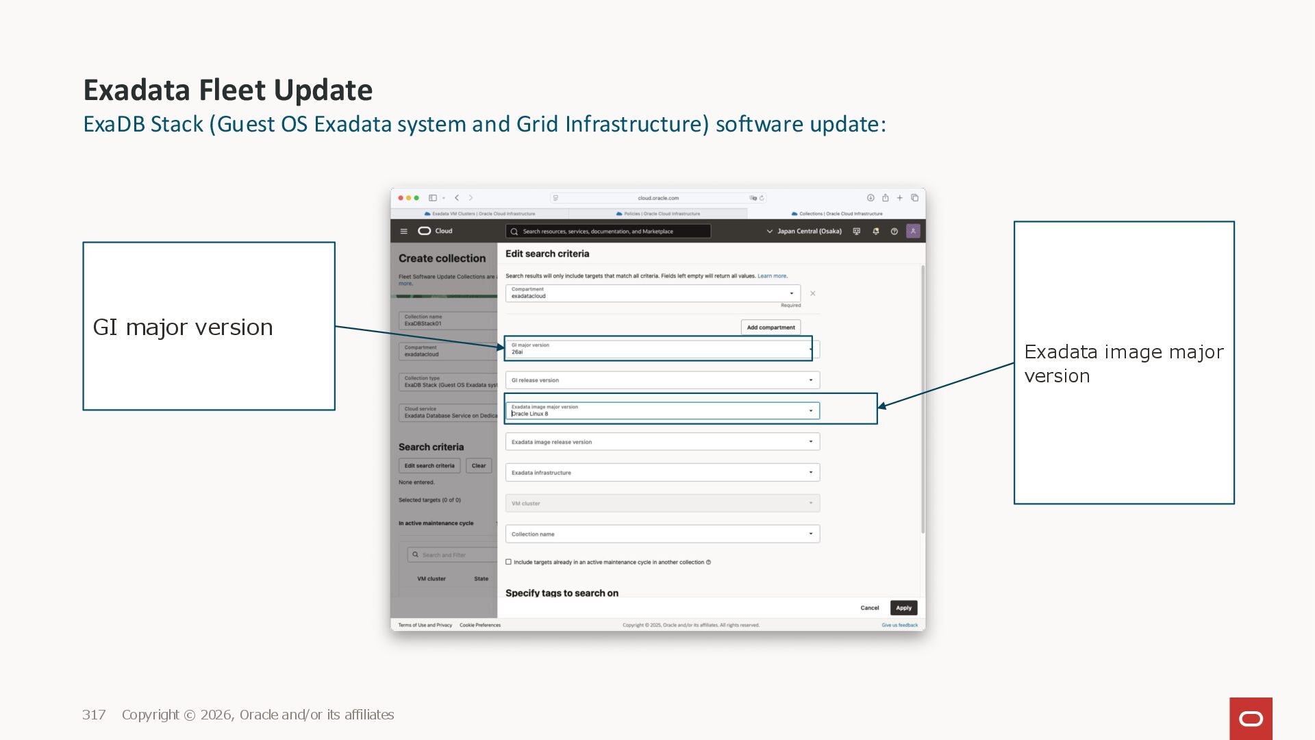 Exadata Fleet Updateは、Oracle DatabaseおよびGrid Infrastructureのパッチ適用エクスペリエンスを簡素化、標準化および強化します。 Exadataフリート更新は、顧客のビジネス・ニーズに基づいてコンポーネントを、特定のメンテナンス・サイクル内の1つのエンティティとしてパッチを適用できるコレクションにグループ化することで、これを実現します。