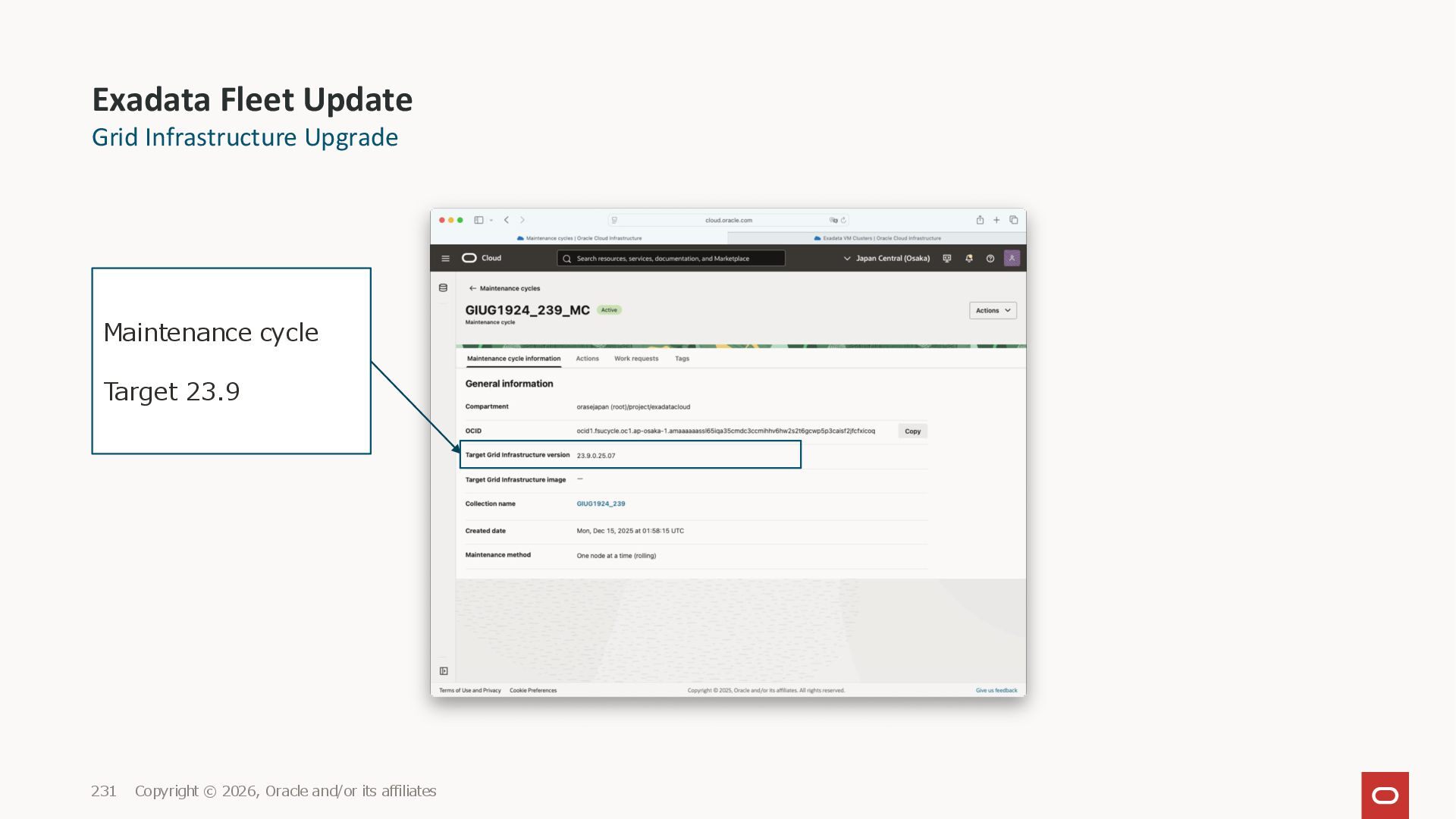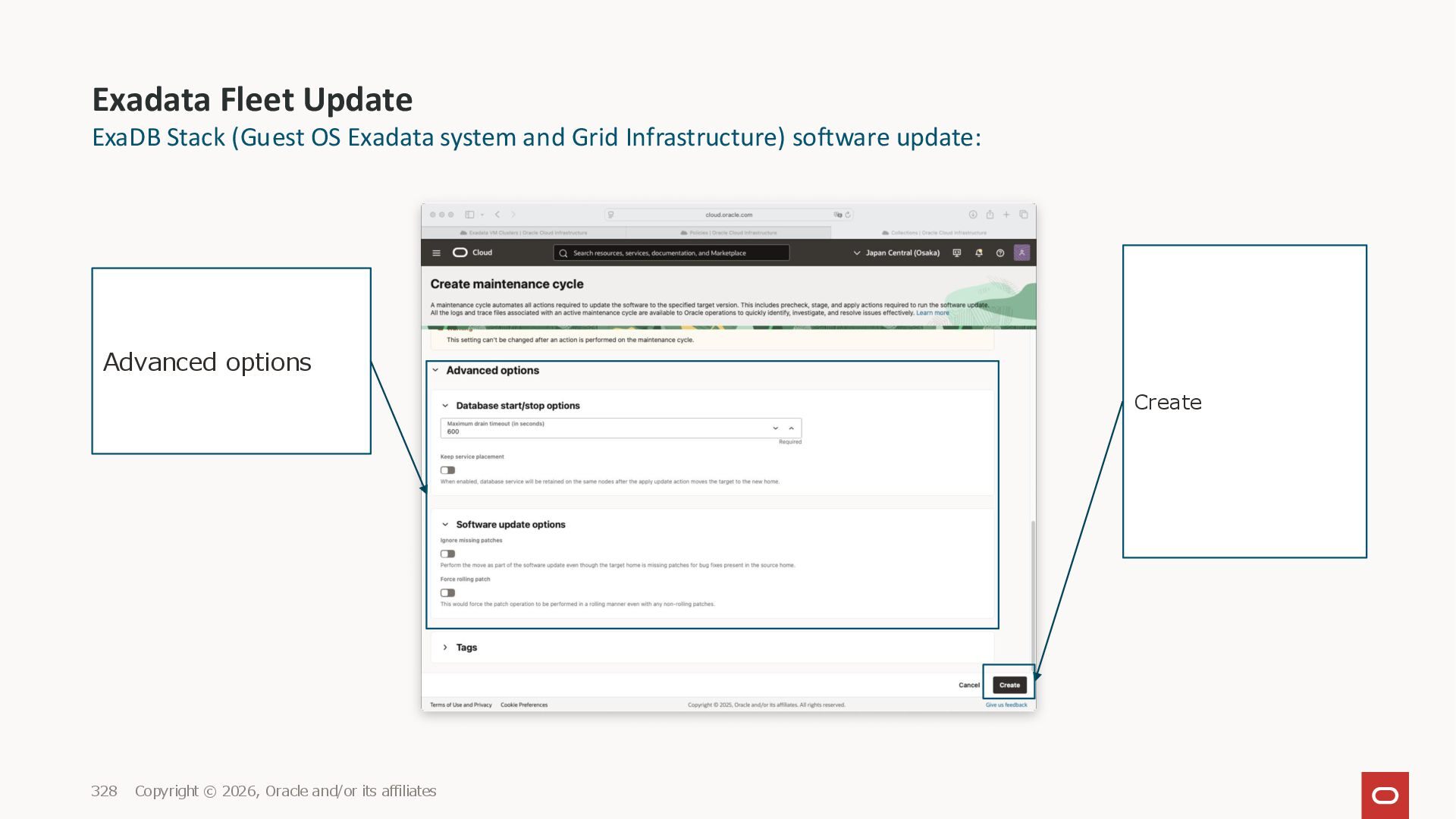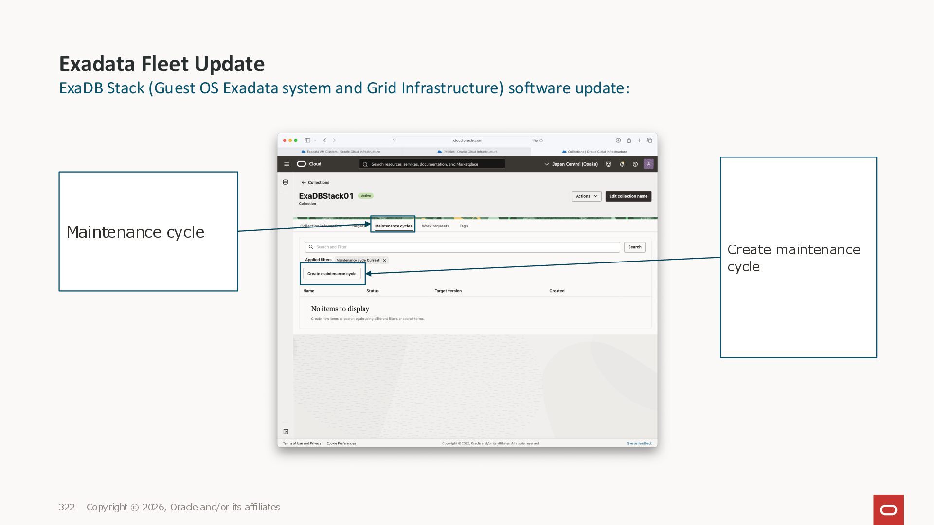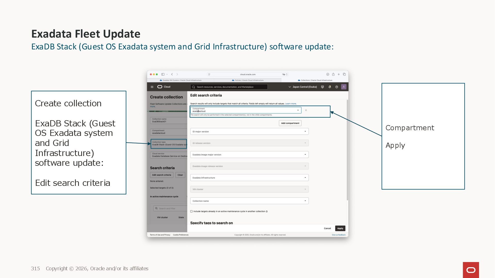 Exadata Fleet Updateは、Oracle DatabaseおよびGrid Infrastructureのパッチ適用エクスペリエンスを簡素化、標準化および強化します。 Exadataフリート更新は、顧客のビジネス・ニーズに基づいてコンポーネントを、特定のメンテナンス・サイクル内の1つのエンティティとしてパッチを適用できるコレクションにグループ化することで、これを実現します。