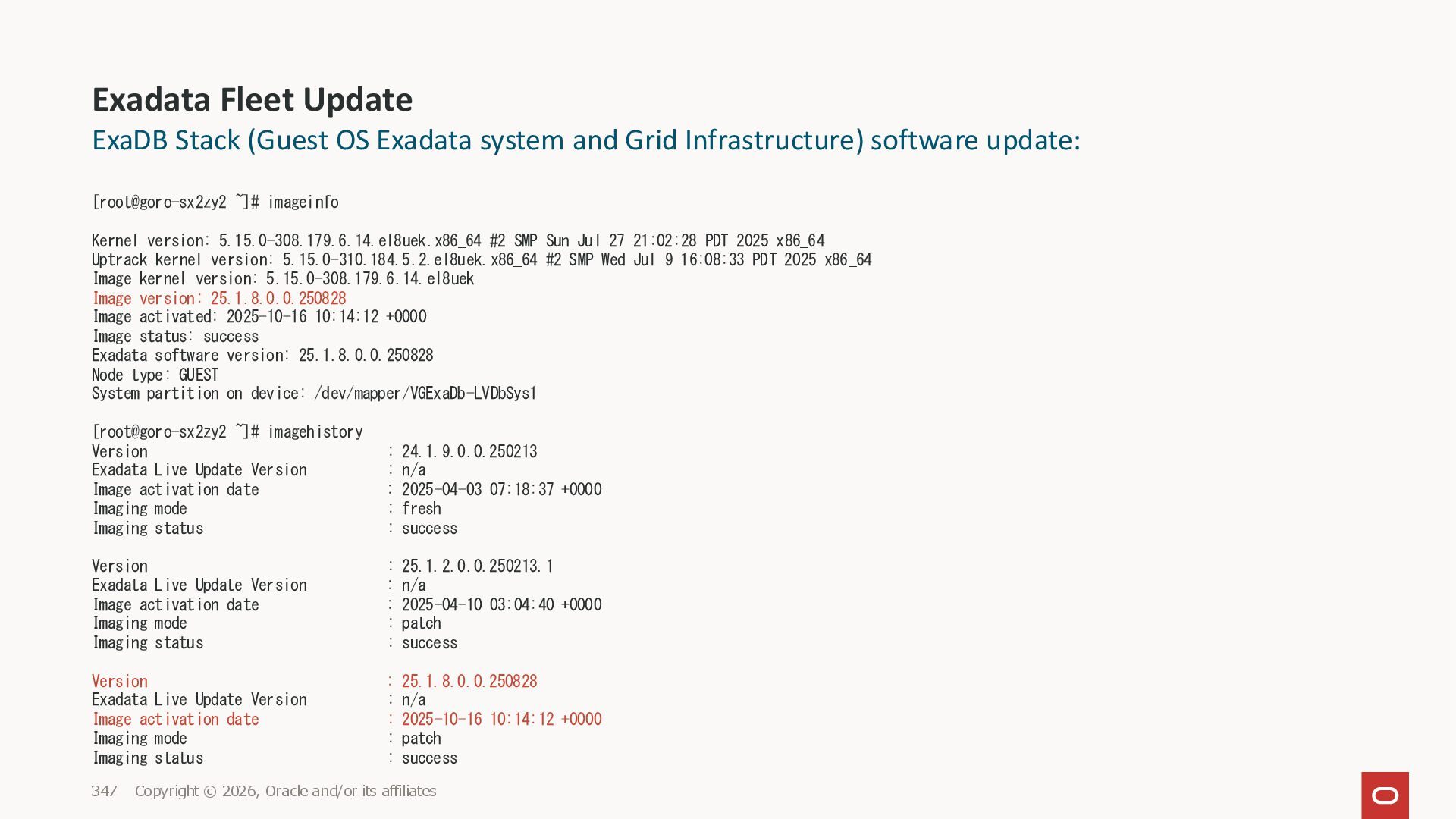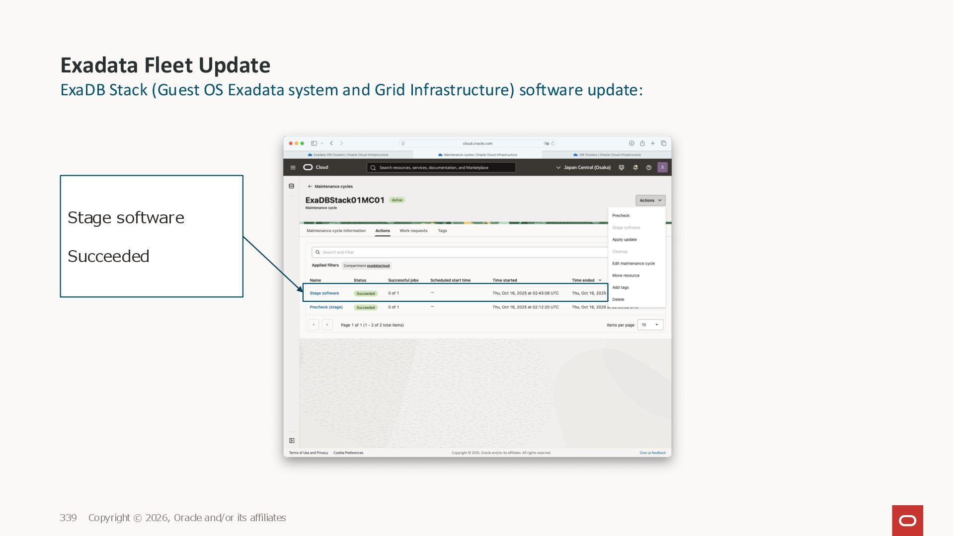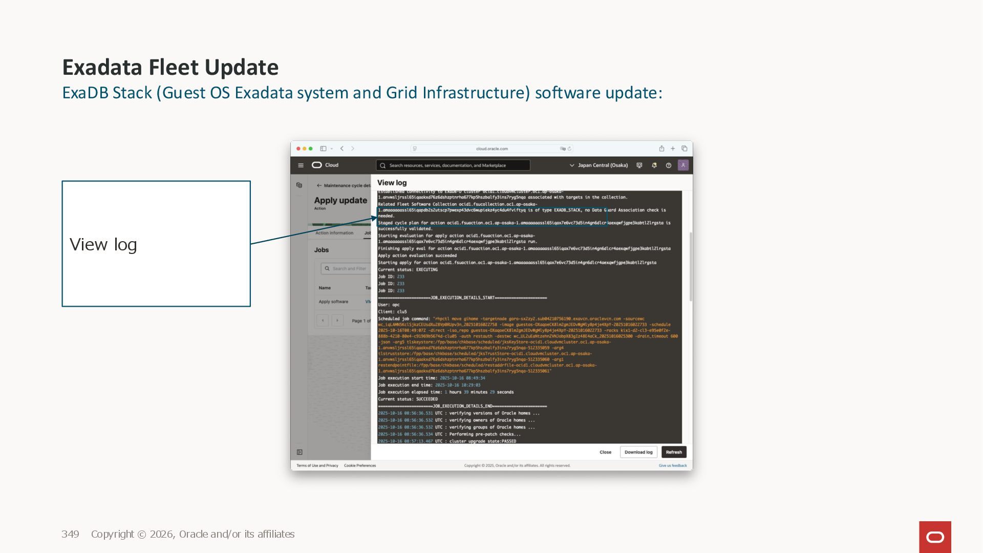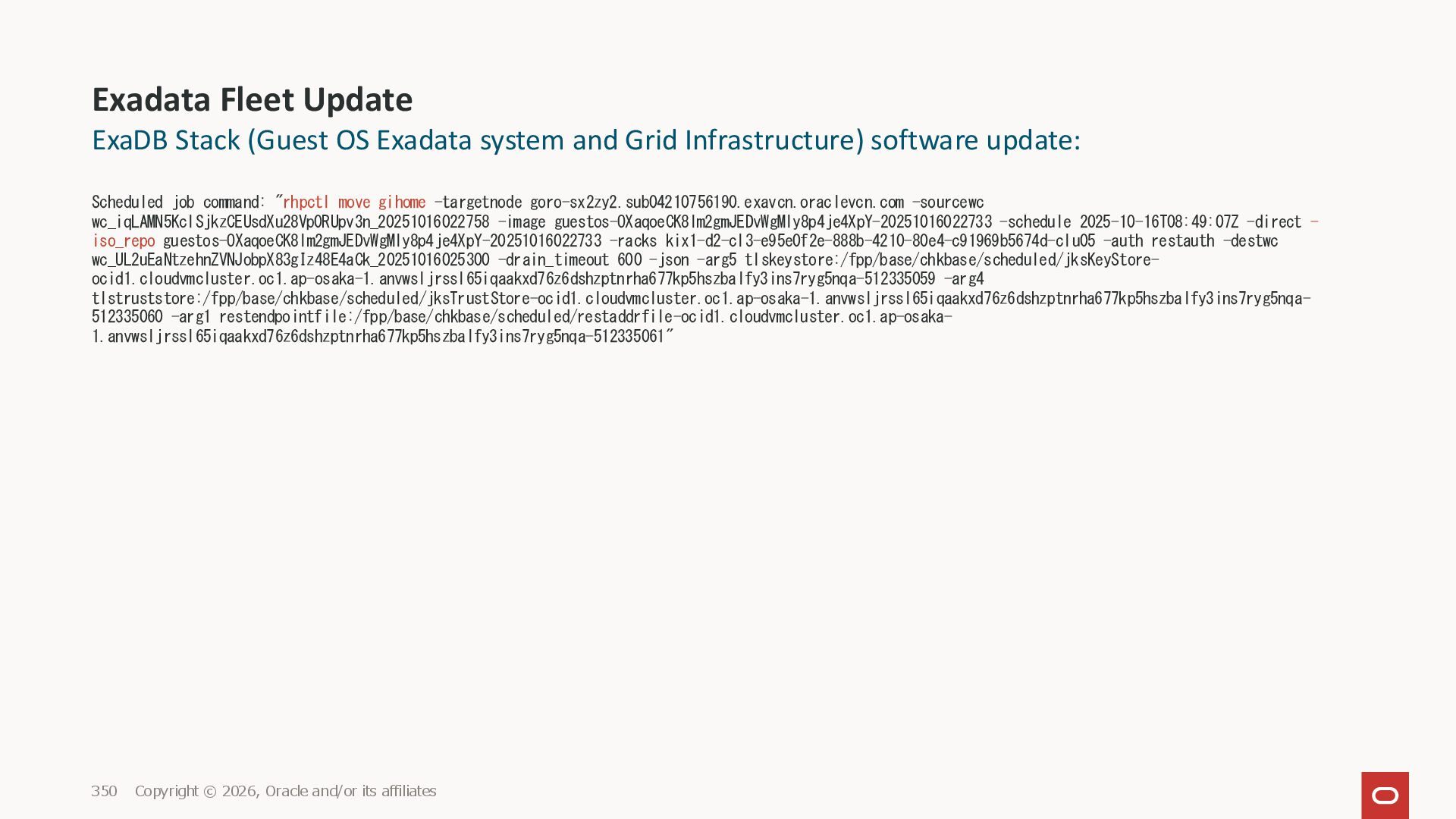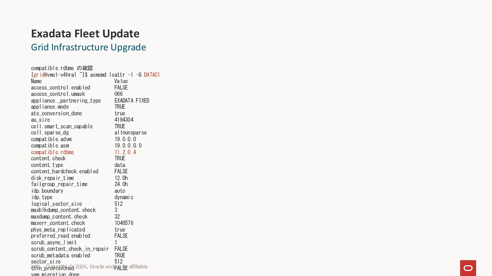 Exadata Fleet Updateは、Oracle DatabaseおよびGrid Infrastructureのパッチ適用エクスペリエンスを簡素化、標準化および強化します。 Exadataフリート更新は、顧客のビジネス・ニーズに基づいてコンポーネントを、特定のメンテナンス・サイクル内の1つのエンティティとしてパッチを適用できるコレクションにグループ化することで、これを実現します。