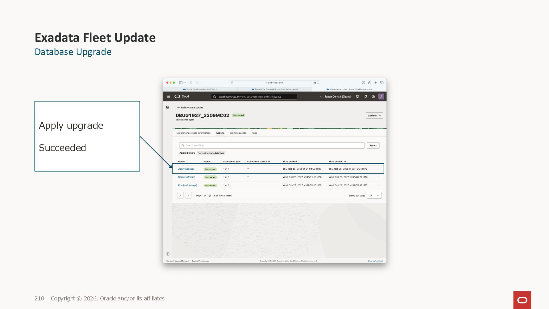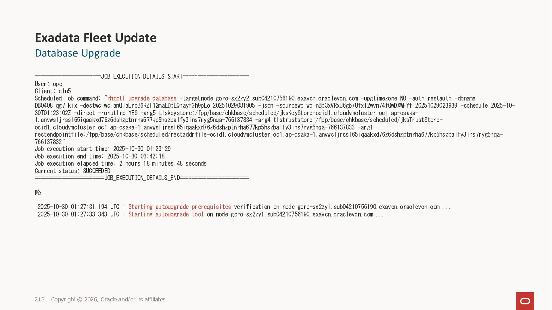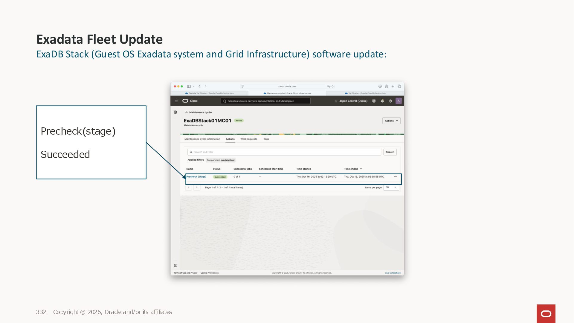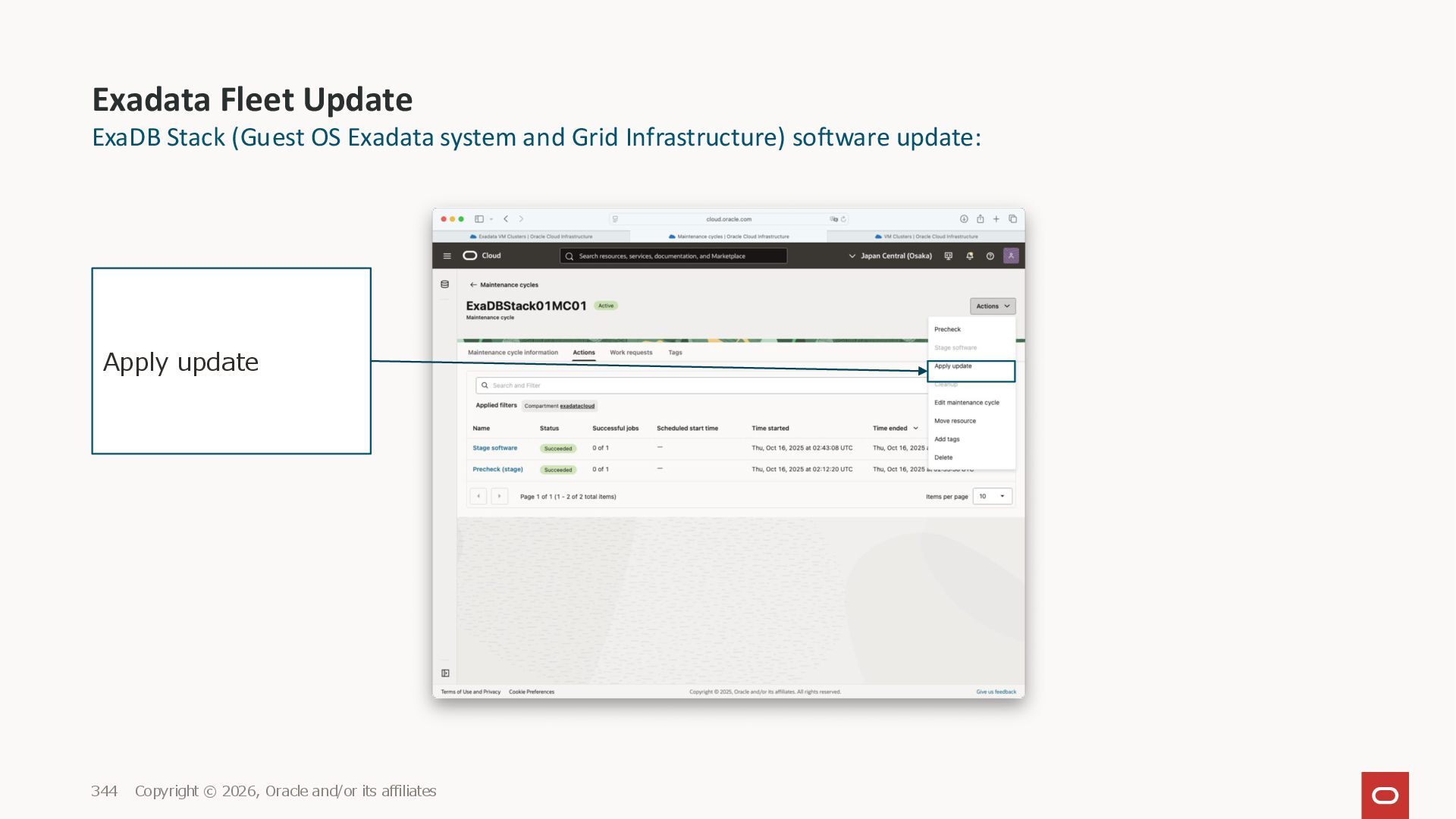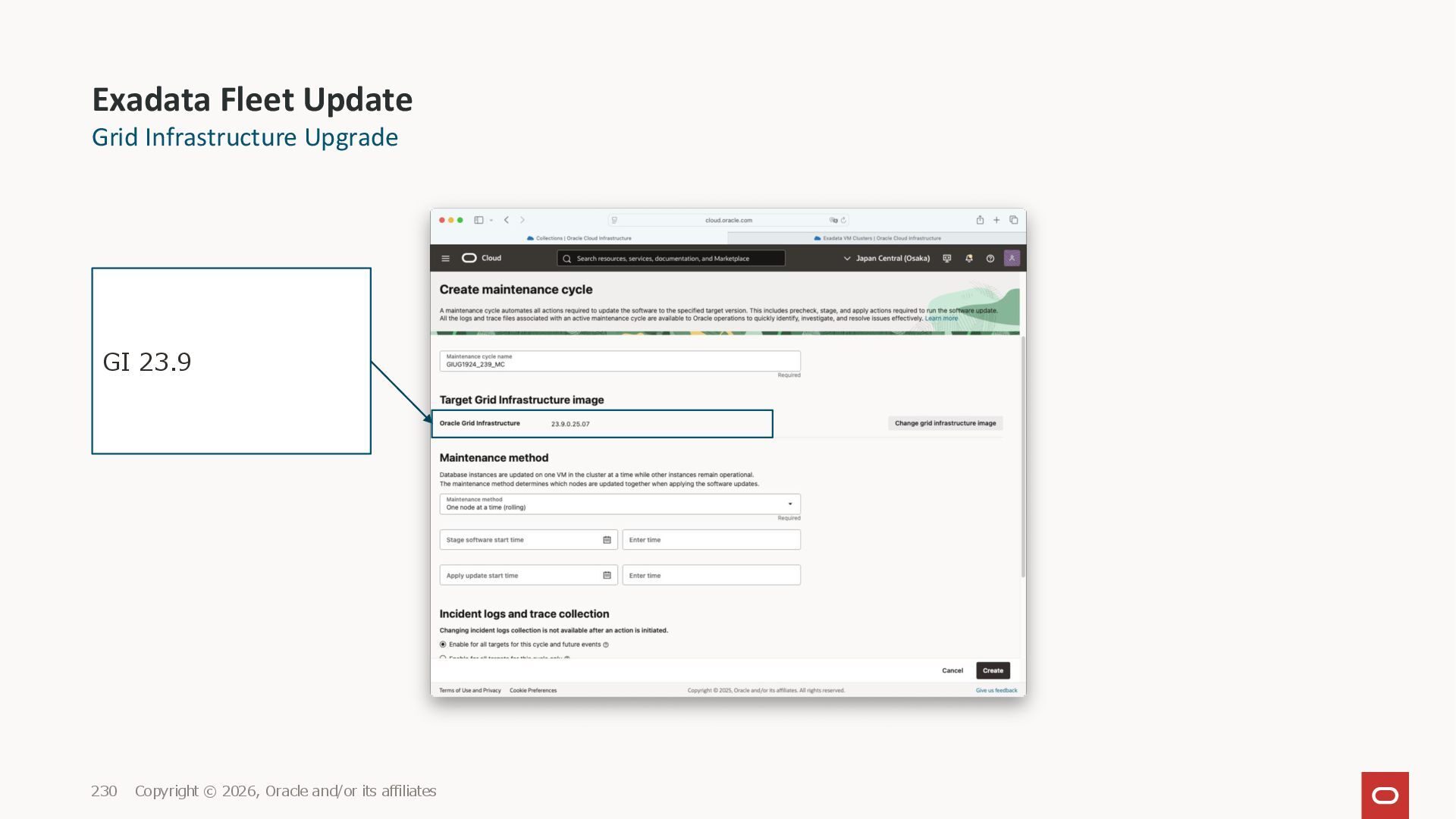 Exadata Fleet Updateは、Oracle DatabaseおよびGrid Infrastructureのパッチ適用エクスペリエンスを簡素化、標準化および強化します。 Exadataフリート更新は、顧客のビジネス・ニーズに基づいてコンポーネントを、特定のメンテナンス・サイクル内の1つのエンティティとしてパッチを適用できるコレクションにグループ化することで、これを実現します。