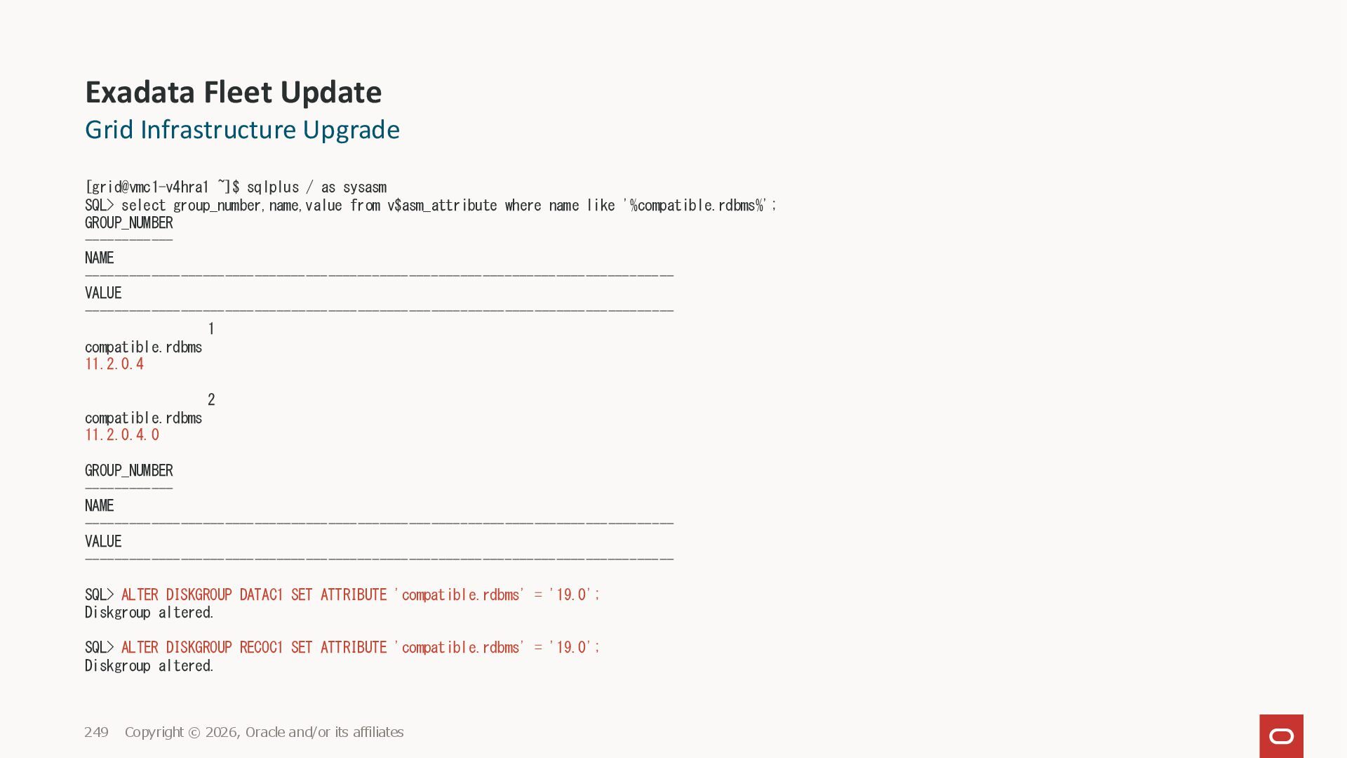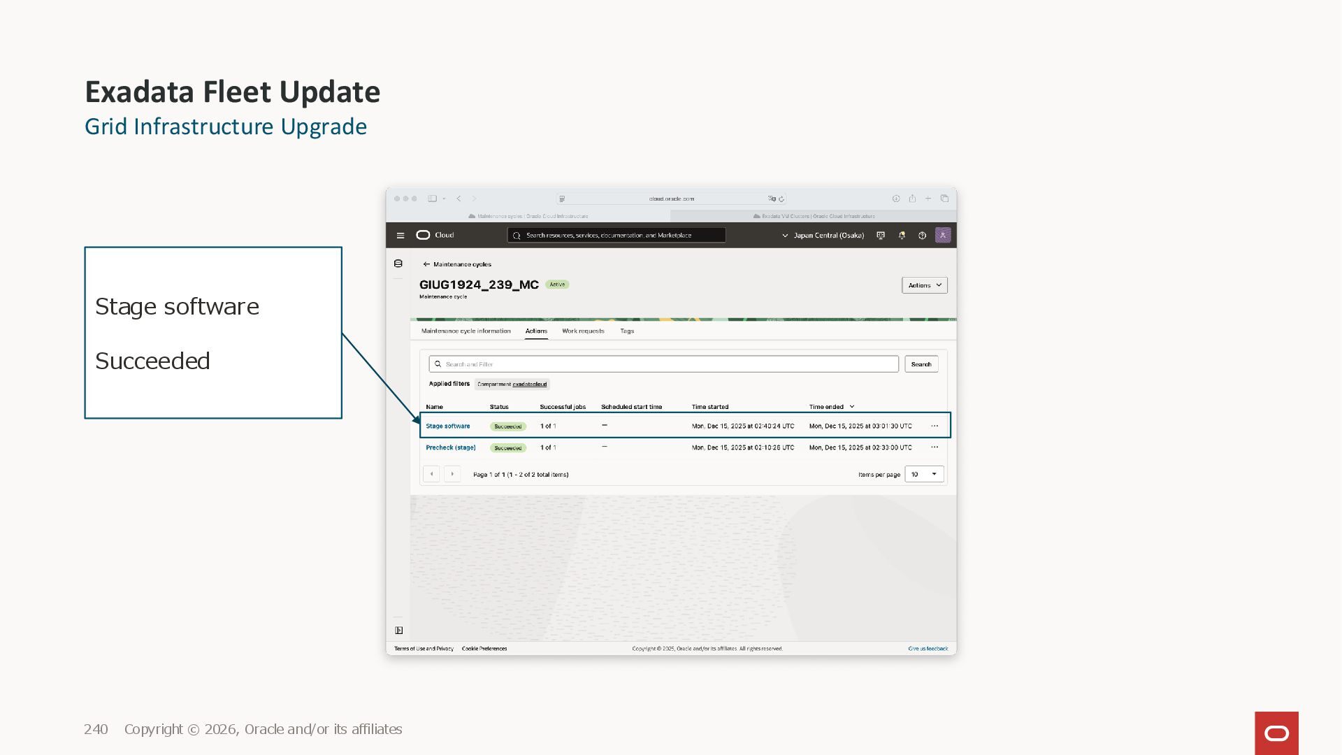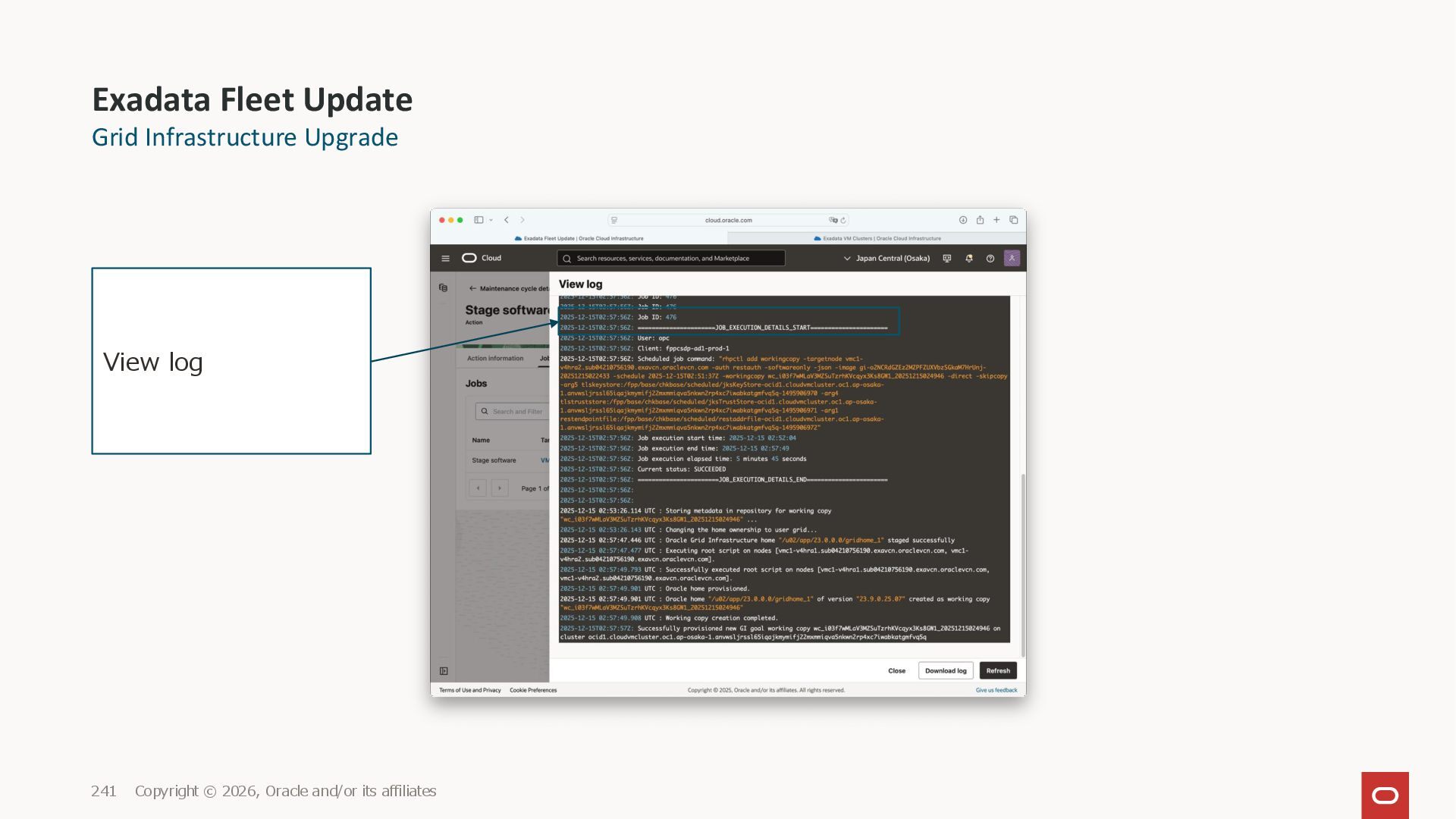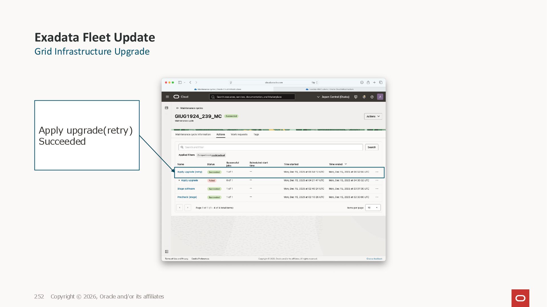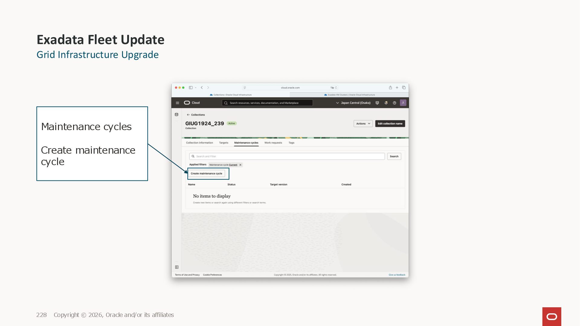 Exadata Fleet Updateは、Oracle DatabaseおよびGrid Infrastructureのパッチ適用エクスペリエンスを簡素化、標準化および強化します。 Exadataフリート更新は、顧客のビジネス・ニーズに基づいてコンポーネントを、特定のメンテナンス・サイクル内の1つのエンティティとしてパッチを適用できるコレクションにグループ化することで、これを実現します。