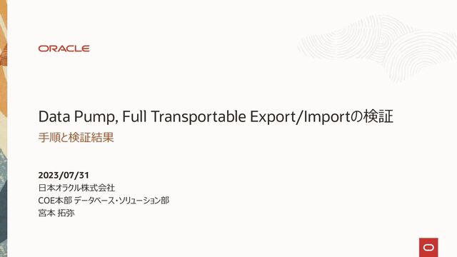 and/or its affiliates 71 インポートを実行します $ impdp dpuser/password@pdb parfile=ftimpdp.par Import: Release 19.0.0.0.0 - Production on Mon May 1 18:30:42 2023 Version 19.16.0.0.0 Copyright (c) 1982, 2019, Oracle and/or its affiliates. All rights reserved. ;;; Connected to: Oracle Database 19c EE Extreme Perf Release 19.0.0.0.0 – Production ***省略*** 01-MAY-23 18:32:10.556: Job "DPUSER"."SYS_IMPORT_TRANSPORTABLE_01" successfully completed at Mon May 1 18:32:10 2023 elapsed 0 00:01:26 実行コマンド: 実行結果: