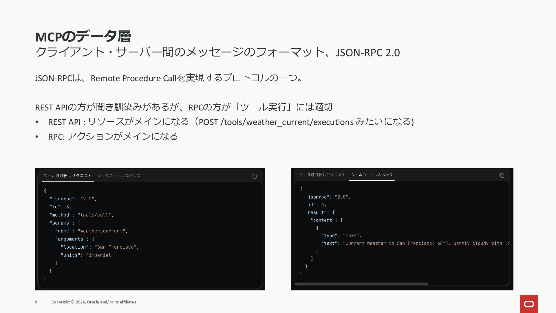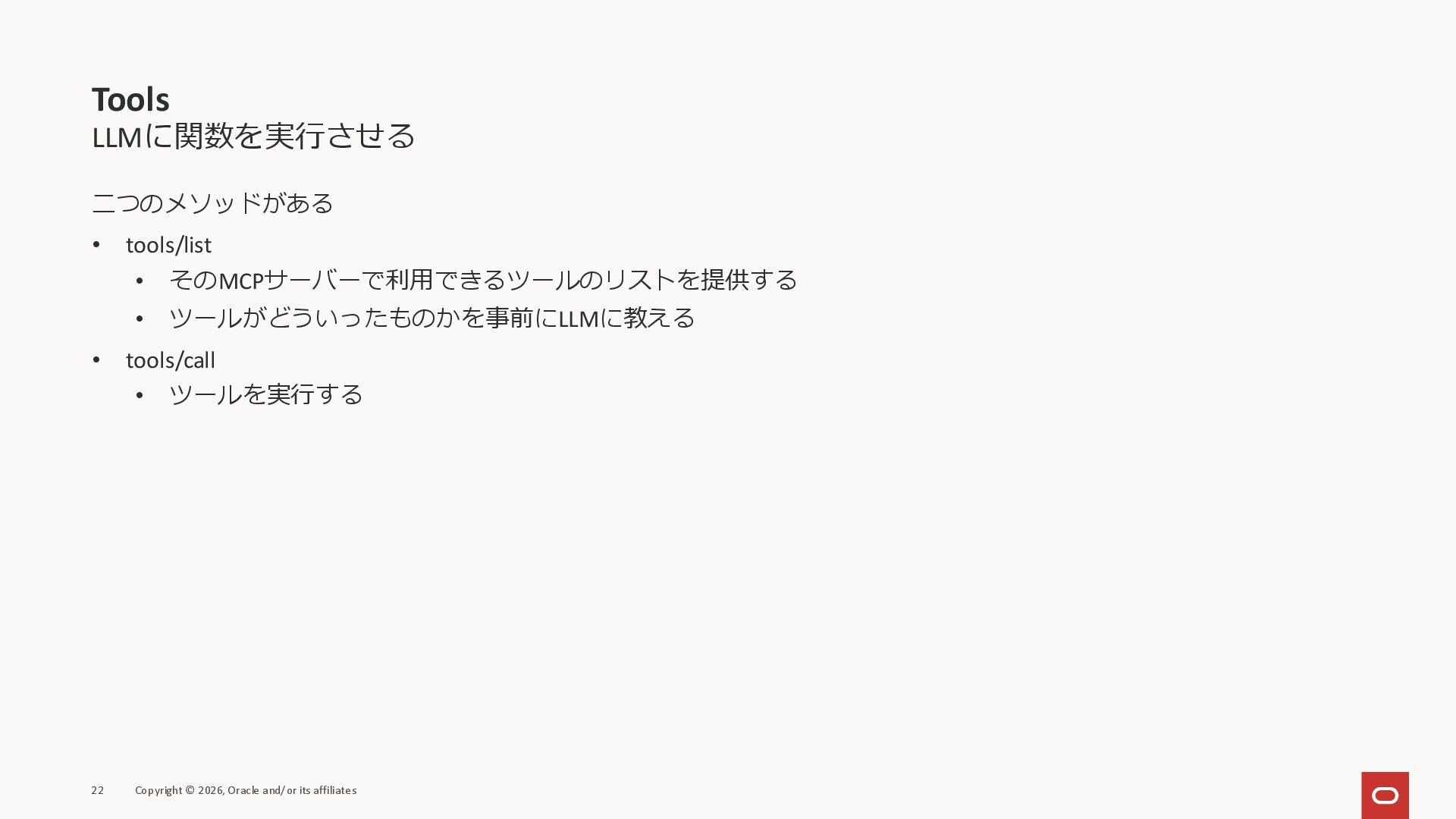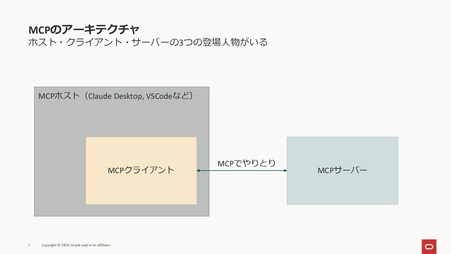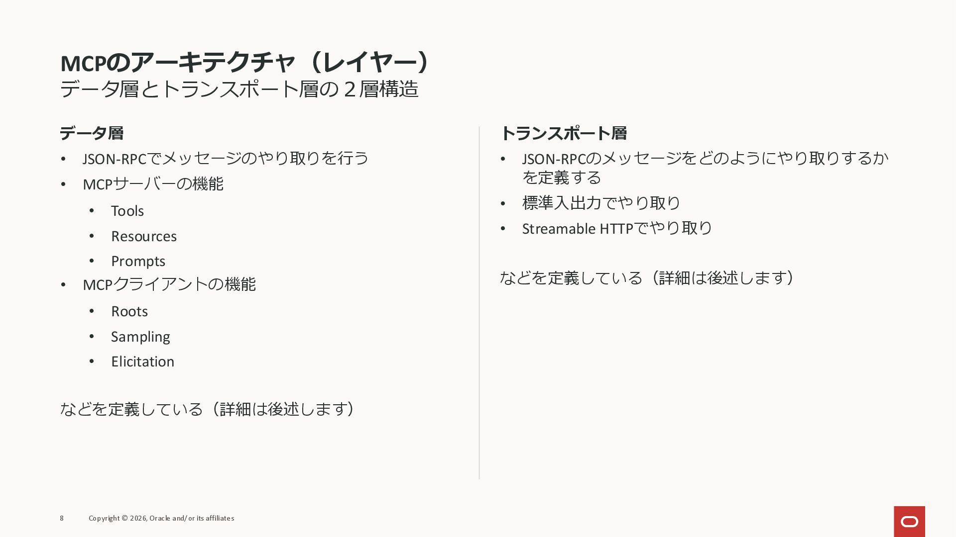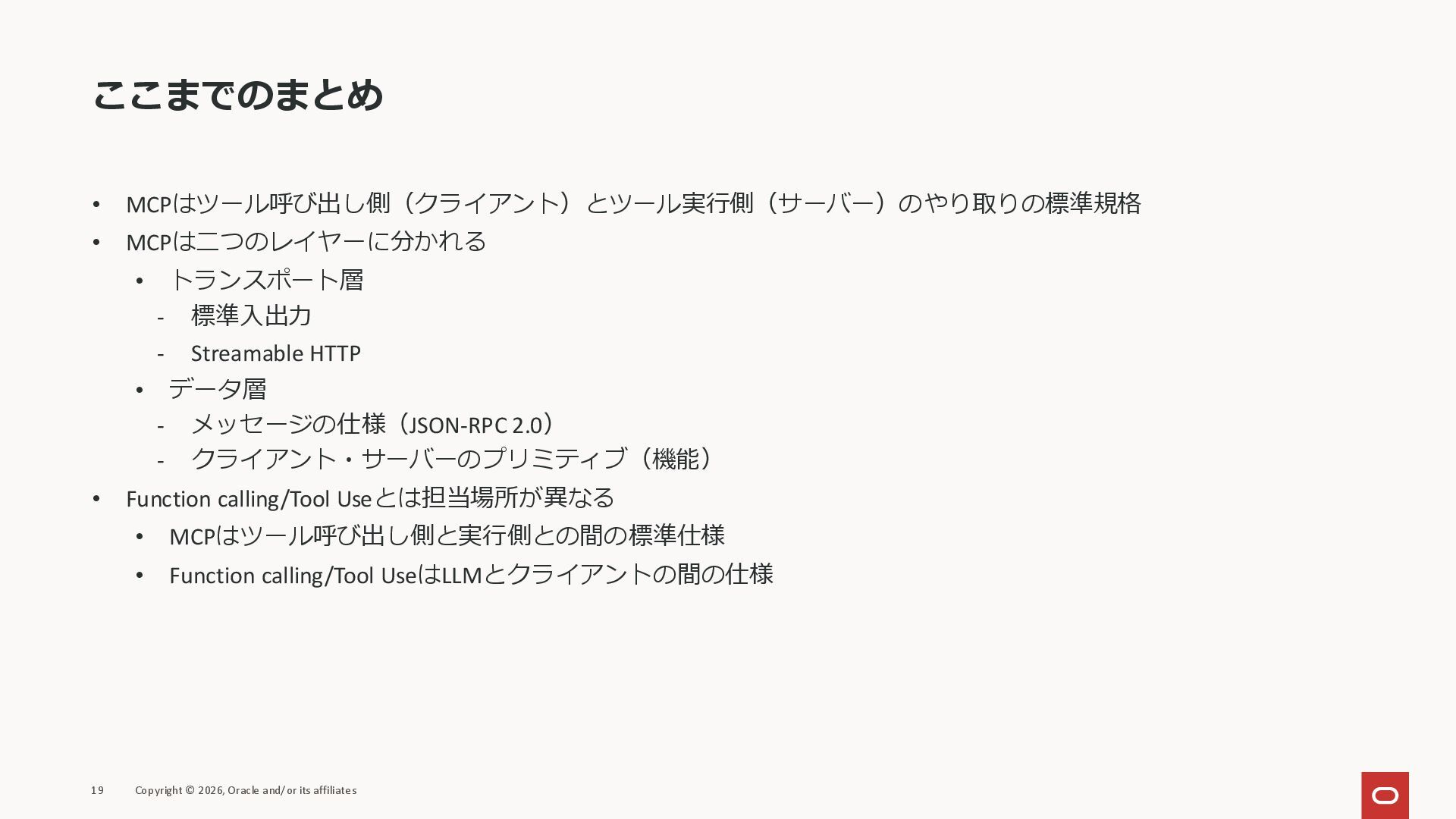 affiliates MCPクライアント MCPサーバー JSON-RPC 2.0 MCPの仕様 (メソッドなど) JSON-RPC 2.0 MCPの仕様 (メソッドなど) *JSON-RPC 2.0では、jsonrpc, id, method, paramsなどのフィールドが定義されているが、その中に何がくるのかまでは定 義されていない MCPは、その中(例えばmethodの中)にどういう名前が入るかなどを定義している *https://www.jsonrpc.org/specification