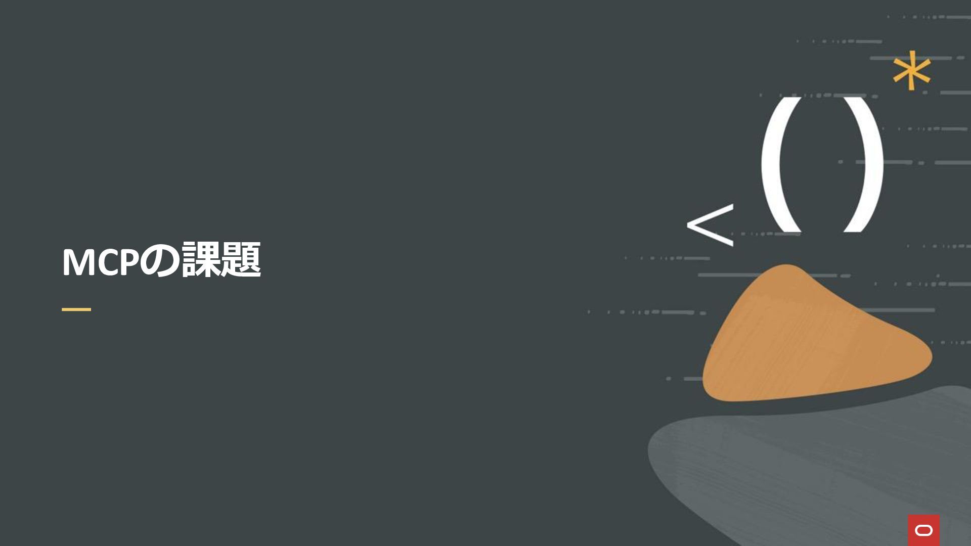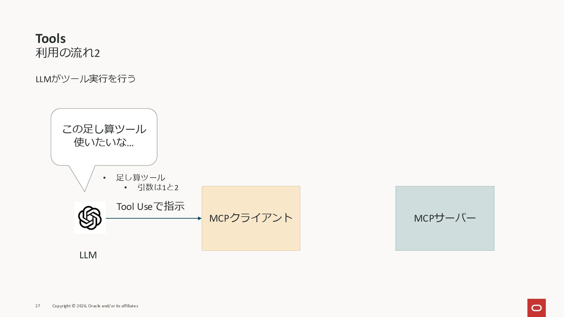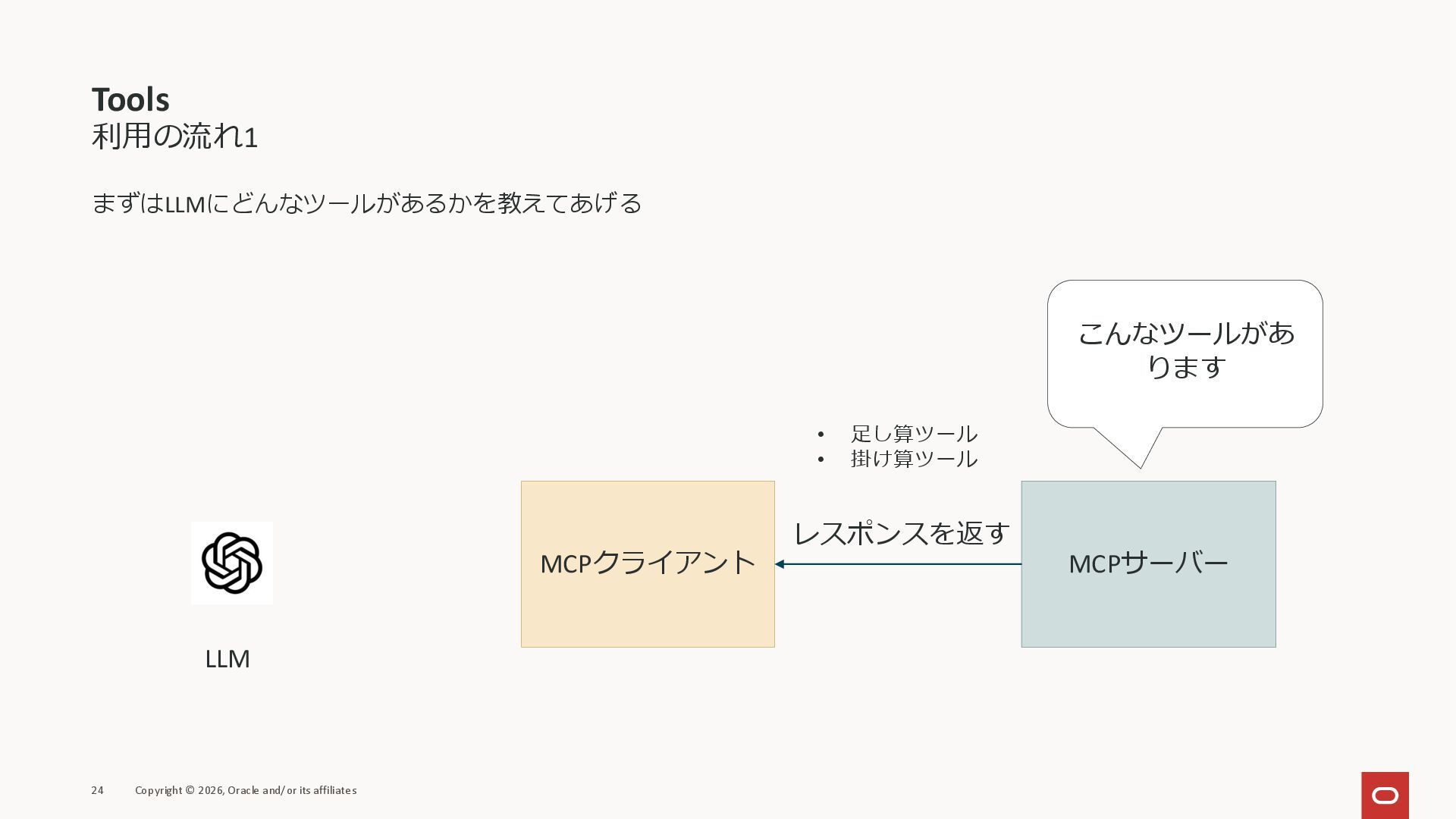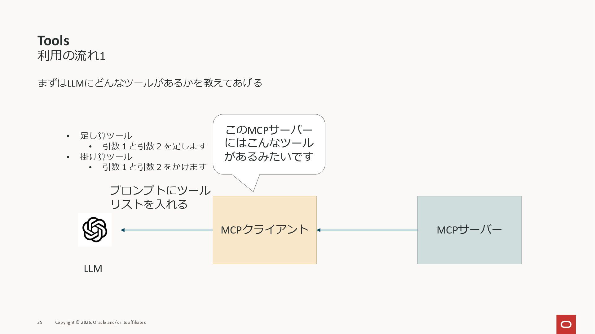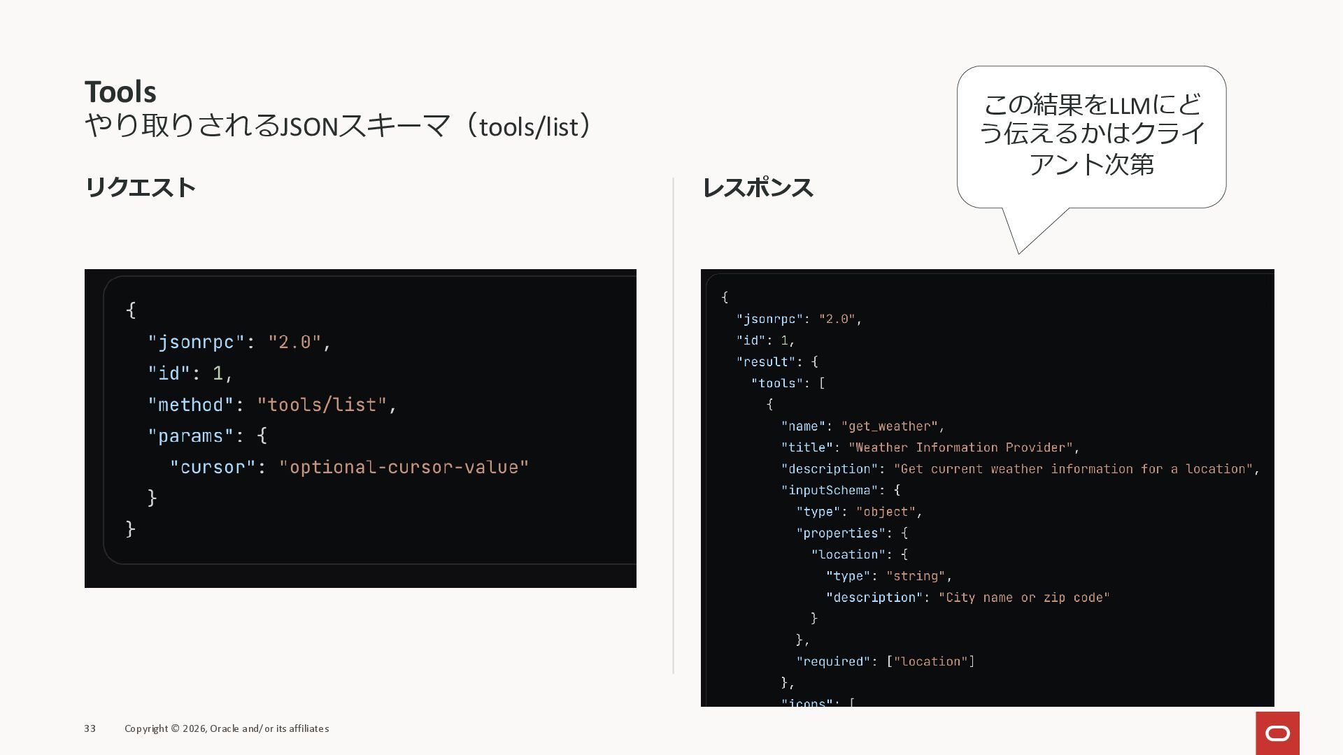 affiliates MCPクライアント MCPサーバー JSON-RPC 2.0 MCPの仕様 (メソッドなど) JSON-RPC 2.0 MCPの仕様 (メソッドなど) *JSON-RPC 2.0では、jsonrpc, id, method, paramsなどのフィールドが定義されているが、その中に何がくるのかまでは定 義されていない MCPは、その中(例えばmethodの中)にどういう名前が入るかなどを定義している *https://www.jsonrpc.org/specification