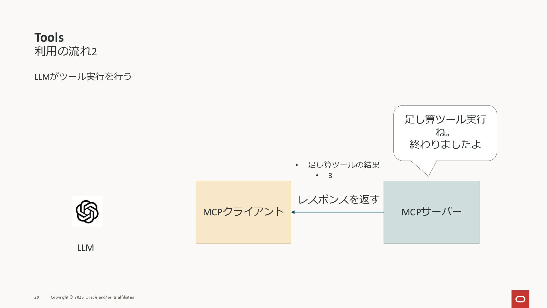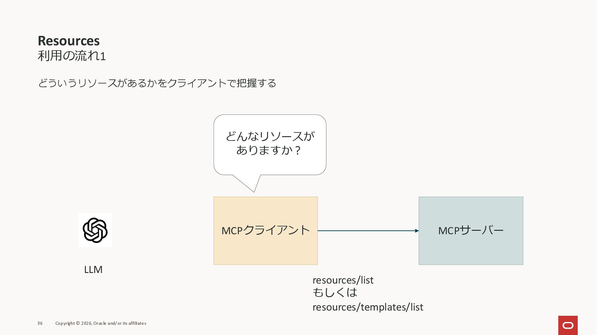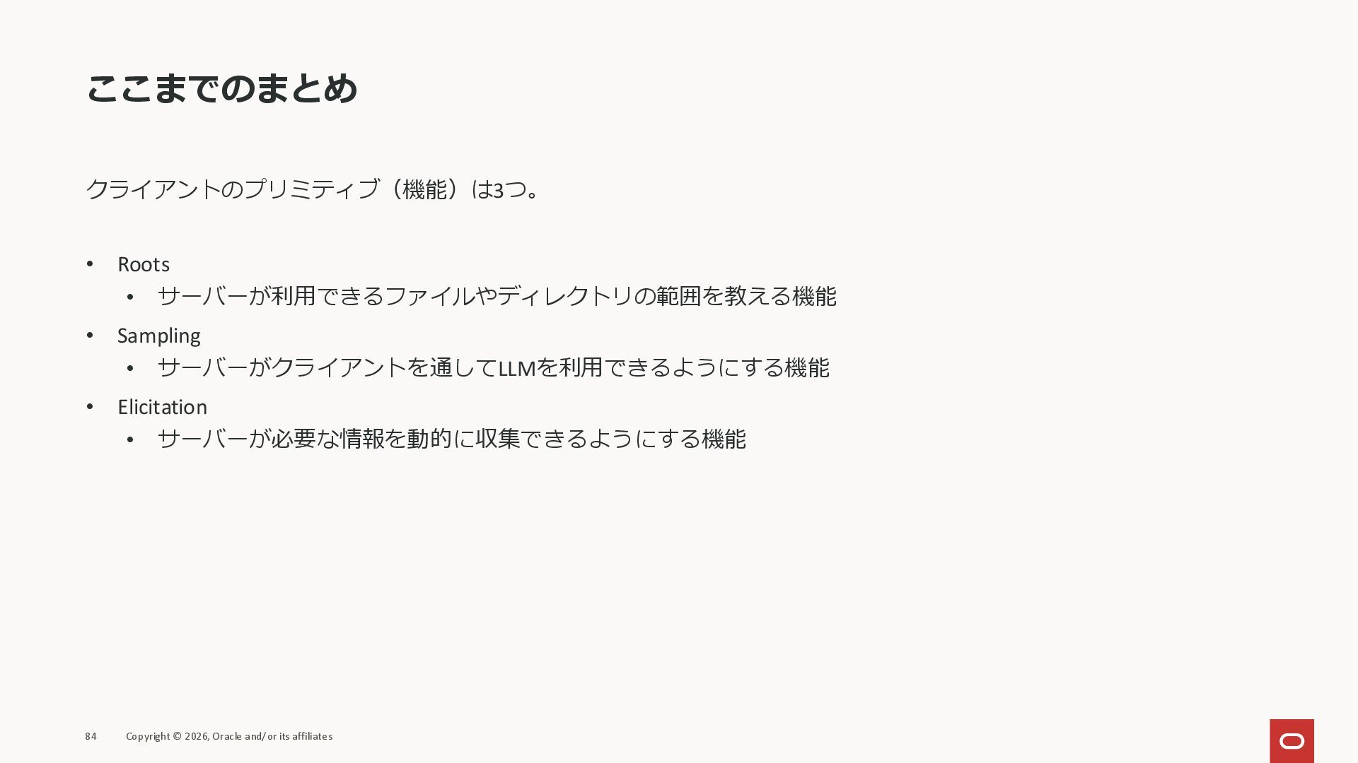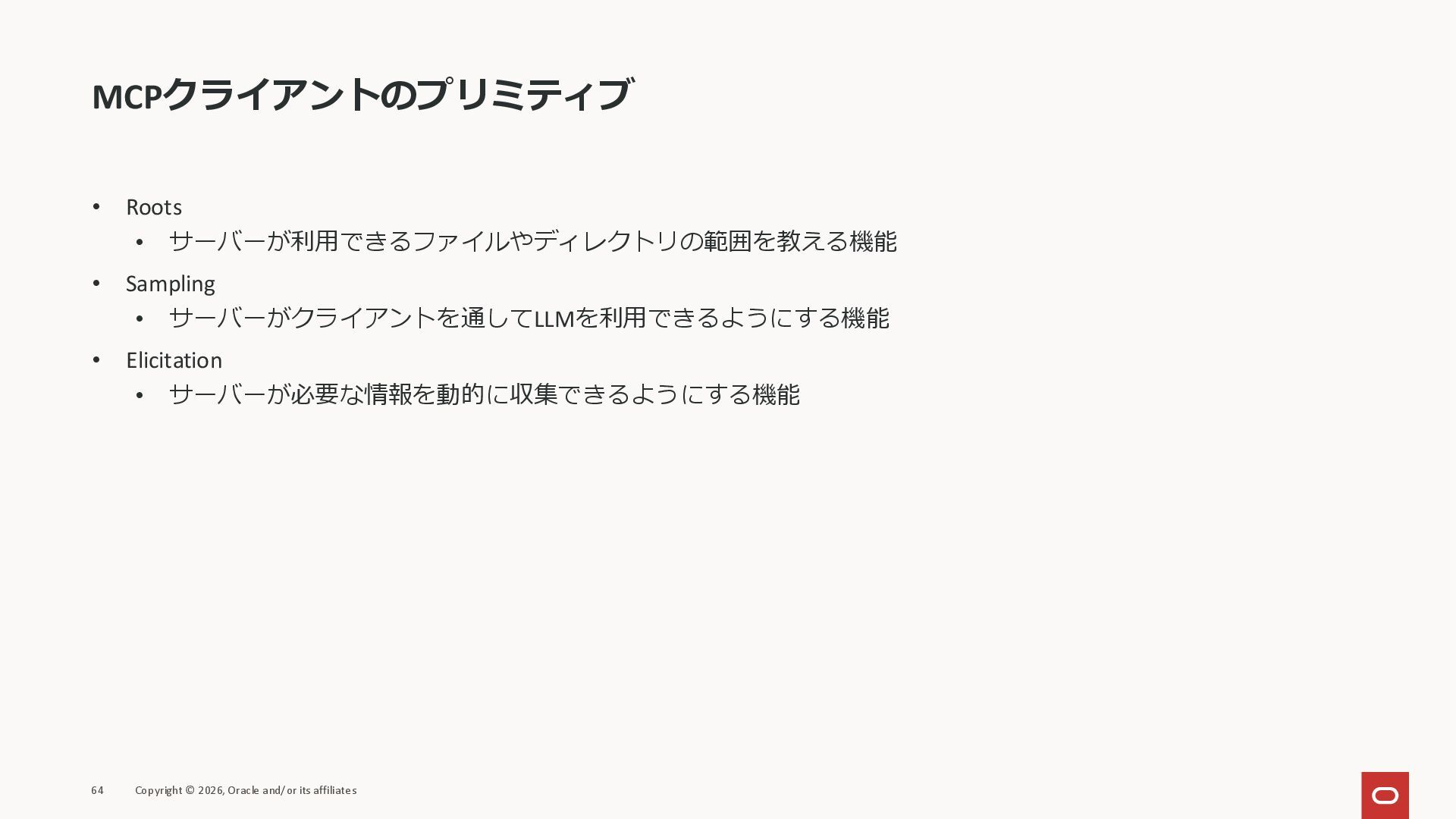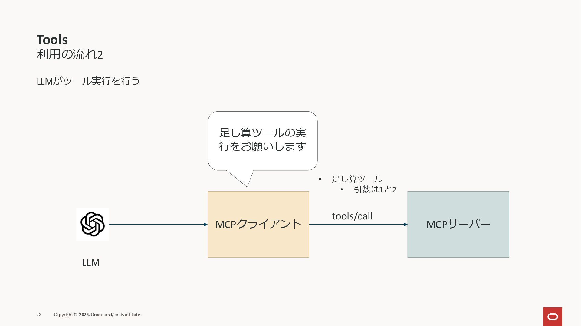 affiliates MCPクライアント MCPサーバー JSON-RPC 2.0 MCPの仕様 (メソッドなど) JSON-RPC 2.0 MCPの仕様 (メソッドなど) *JSON-RPC 2.0では、jsonrpc, id, method, paramsなどのフィールドが定義されているが、その中に何がくるのかまでは定 義されていない MCPは、その中(例えばmethodの中)にどういう名前が入るかなどを定義している *https://www.jsonrpc.org/specification