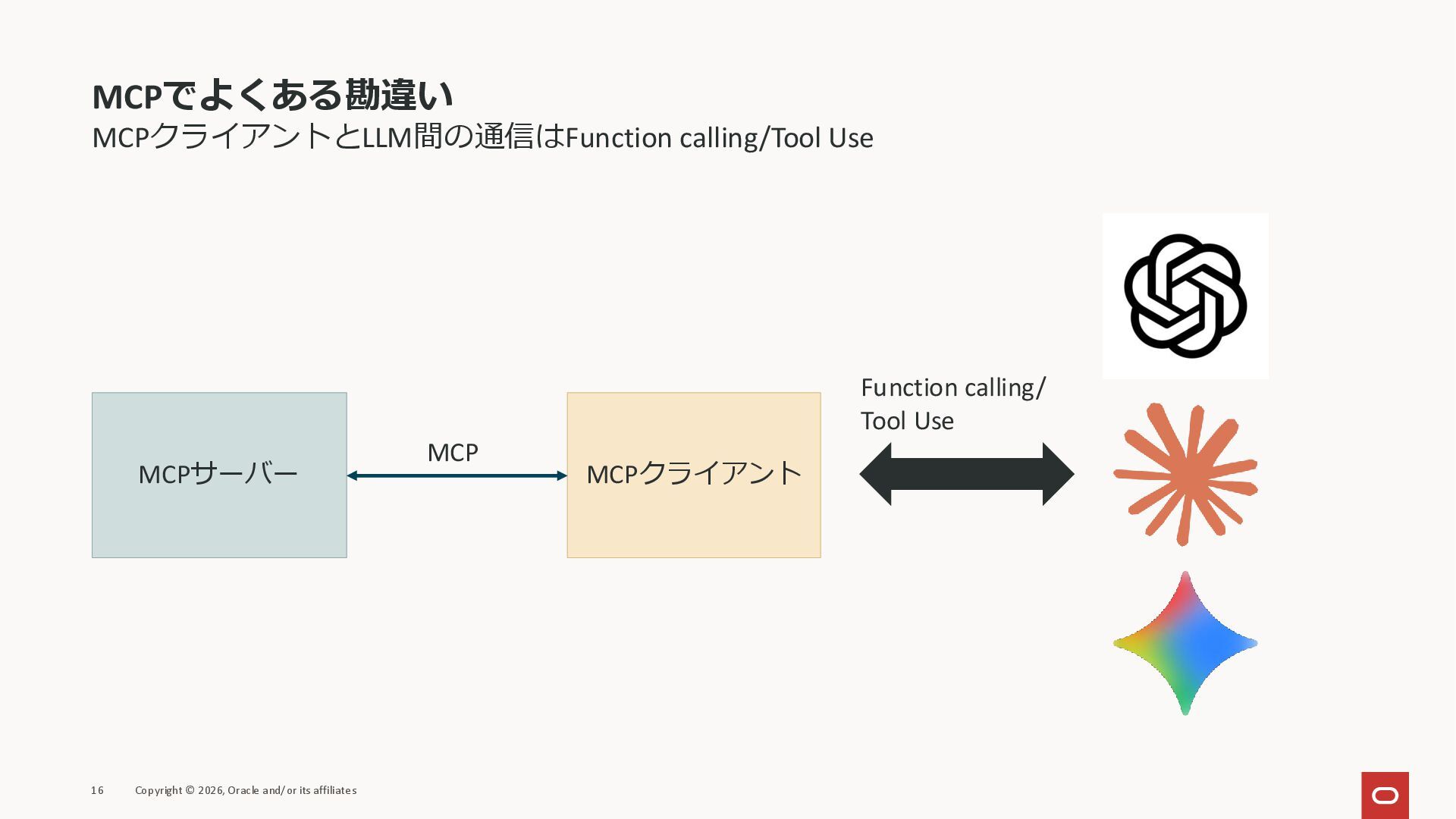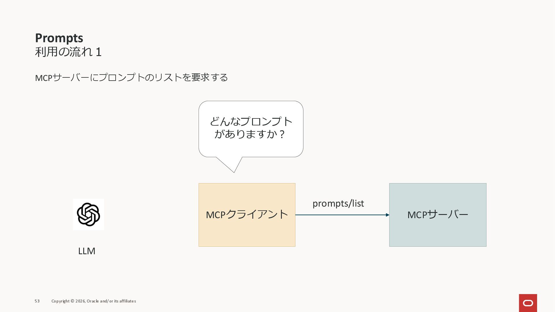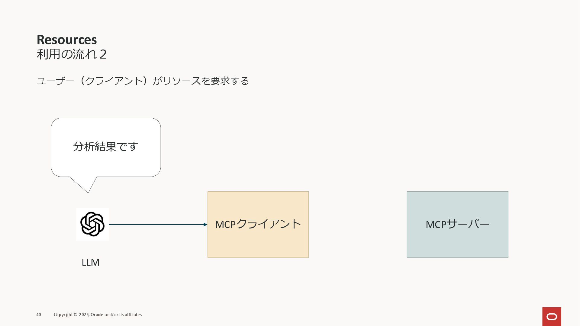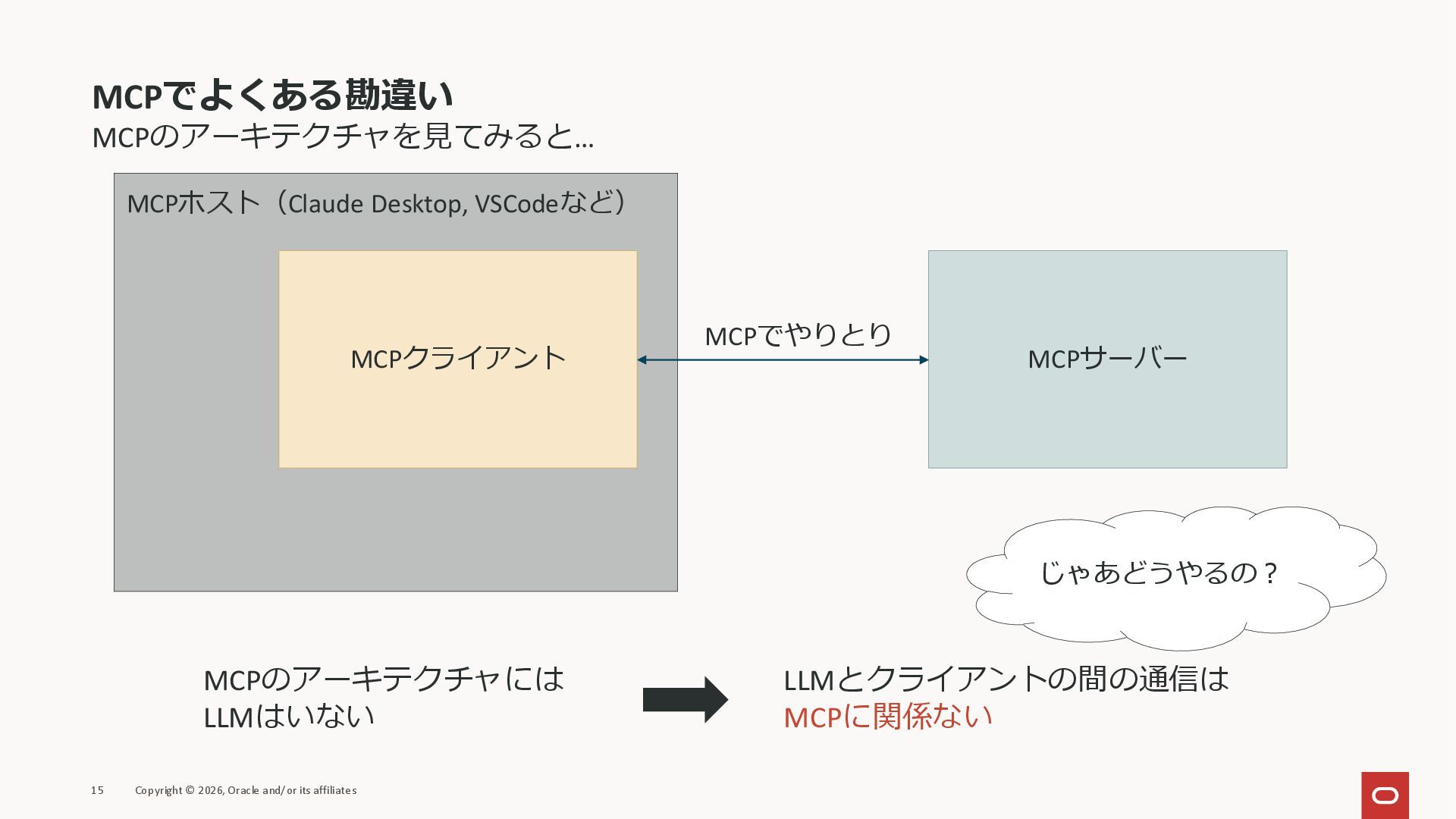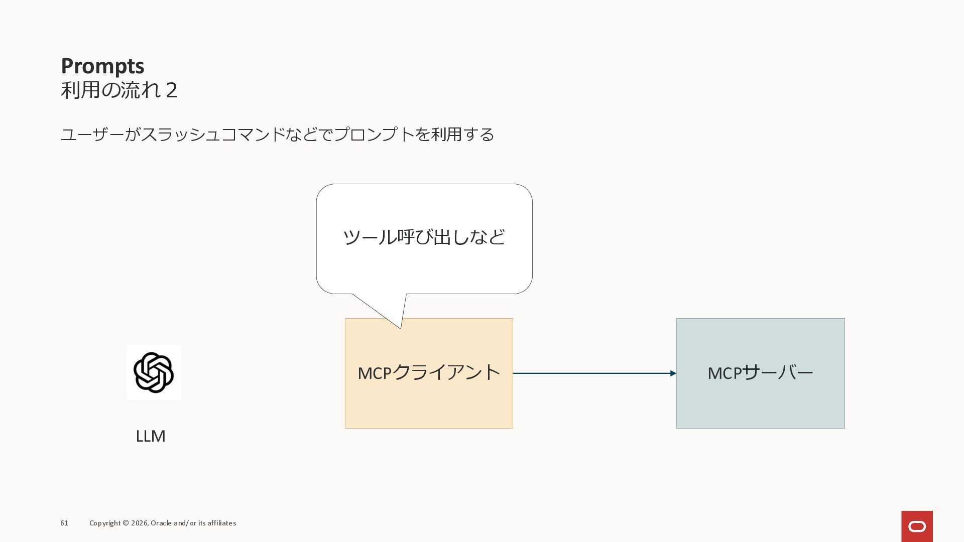 affiliates MCPクライアント MCPサーバー JSON-RPC 2.0 MCPの仕様 (メソッドなど) JSON-RPC 2.0 MCPの仕様 (メソッドなど) *JSON-RPC 2.0では、jsonrpc, id, method, paramsなどのフィールドが定義されているが、その中に何がくるのかまでは定 義されていない MCPは、その中(例えばmethodの中)にどういう名前が入るかなどを定義している *https://www.jsonrpc.org/specification