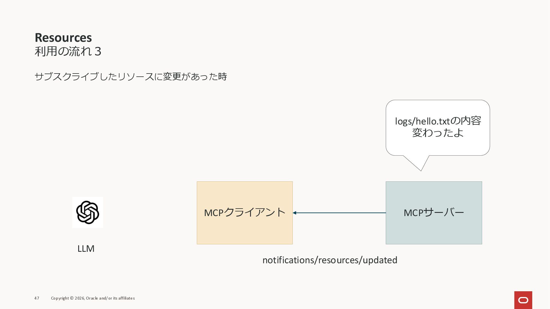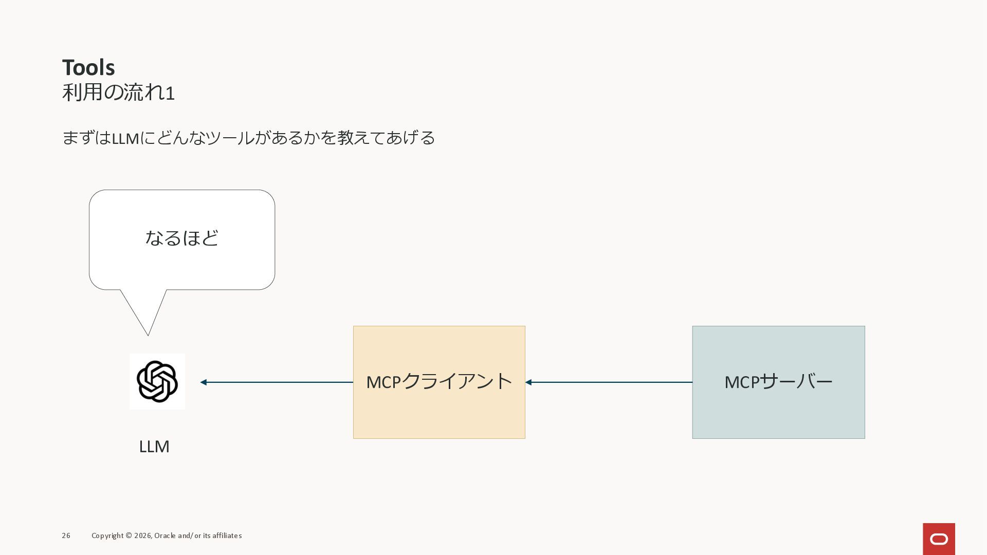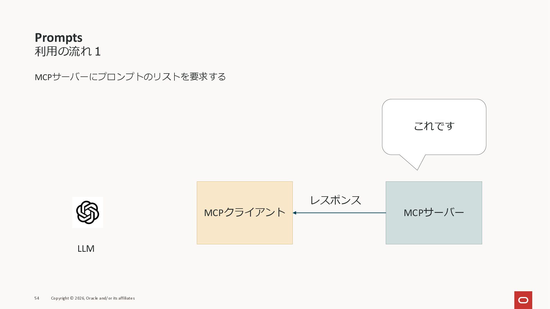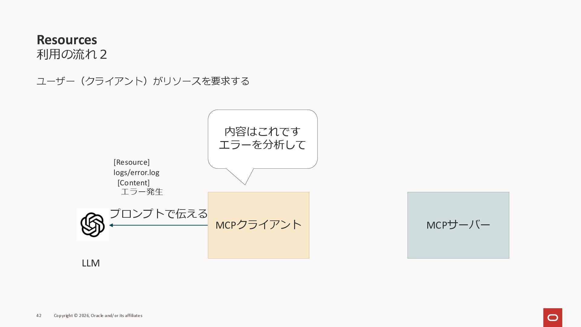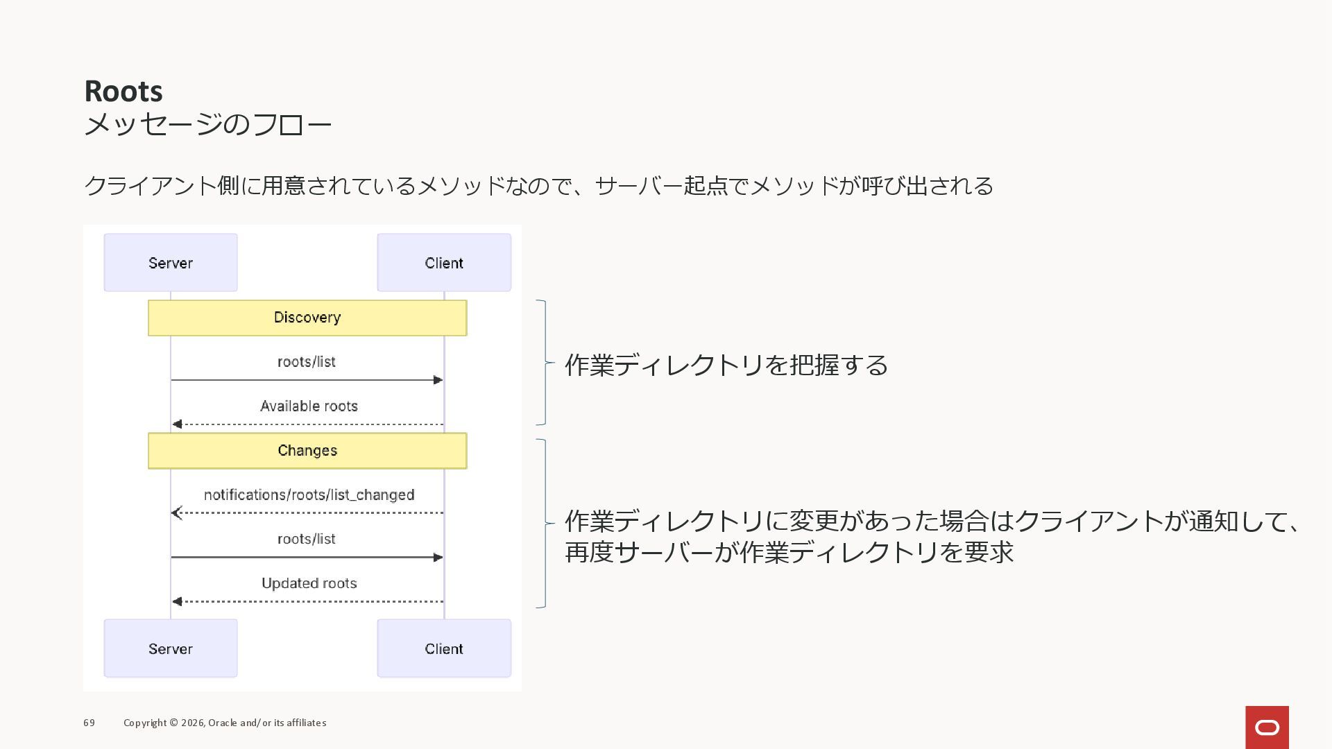 affiliates MCPクライアント MCPサーバー JSON-RPC 2.0 MCPの仕様 (メソッドなど) JSON-RPC 2.0 MCPの仕様 (メソッドなど) *JSON-RPC 2.0では、jsonrpc, id, method, paramsなどのフィールドが定義されているが、その中に何がくるのかまでは定 義されていない MCPは、その中(例えばmethodの中)にどういう名前が入るかなどを定義している *https://www.jsonrpc.org/specification
