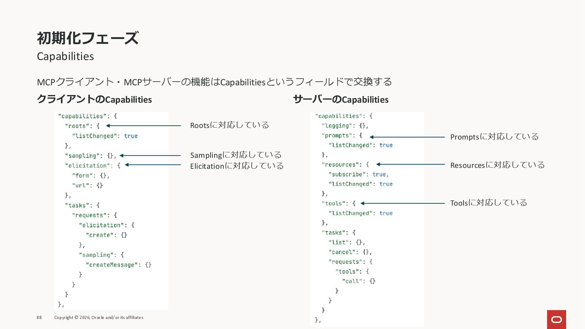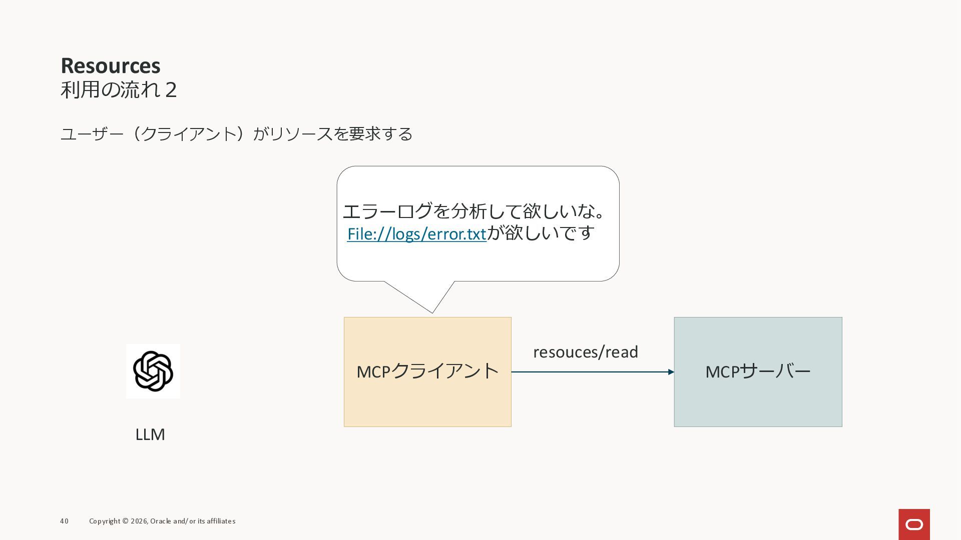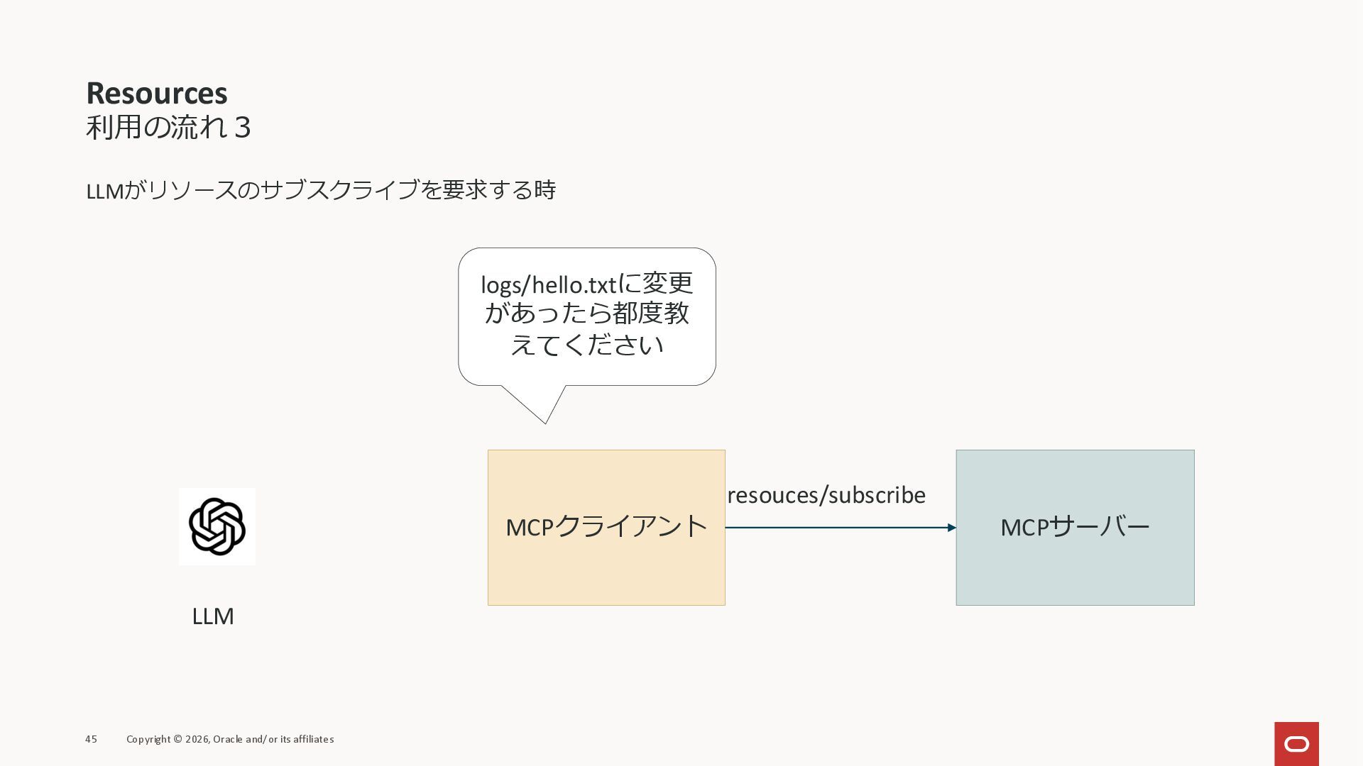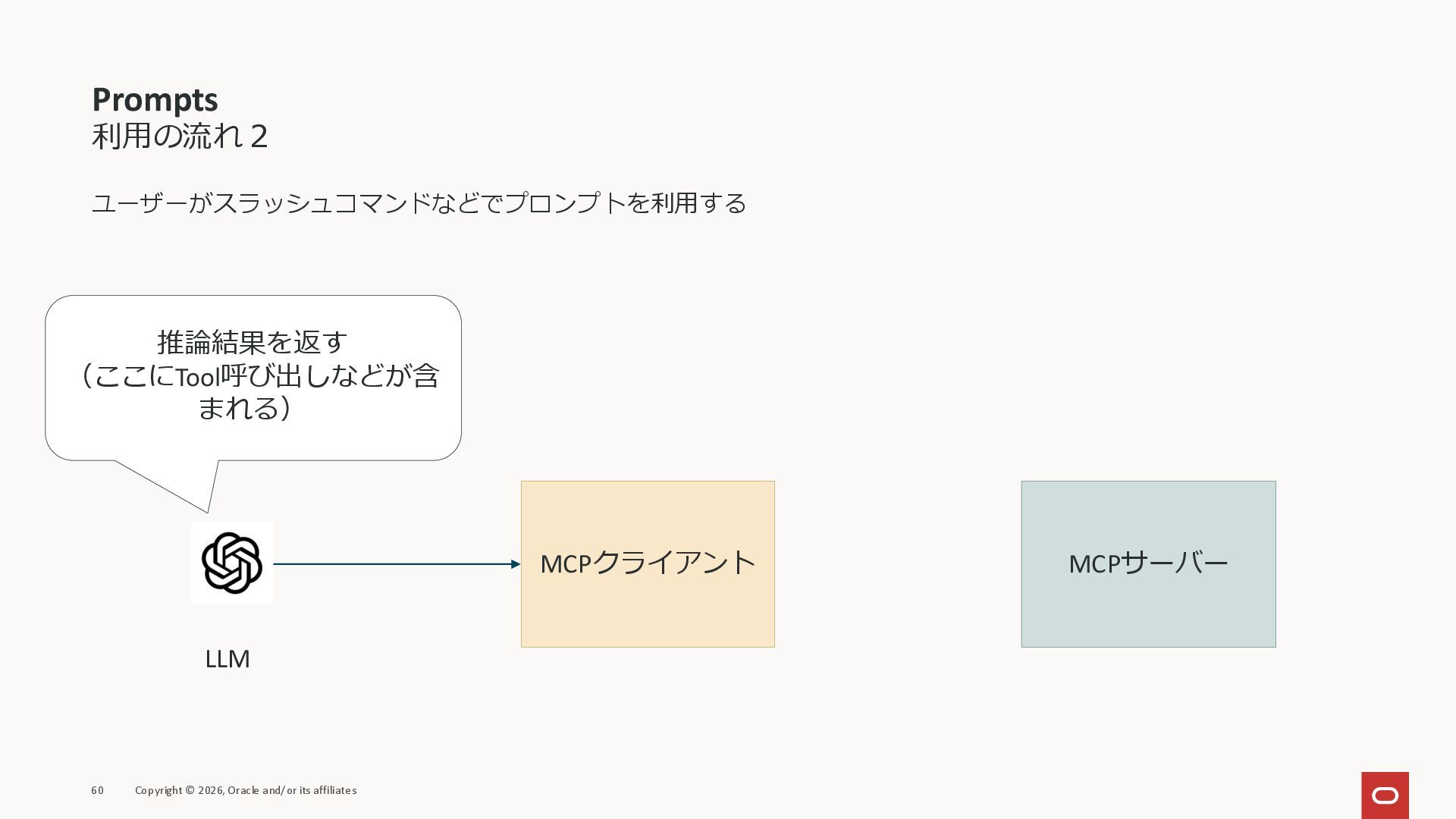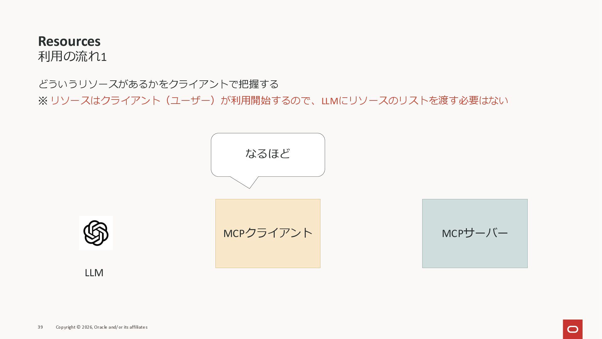 affiliates MCPクライアント MCPサーバー JSON-RPC 2.0 MCPの仕様 (メソッドなど) JSON-RPC 2.0 MCPの仕様 (メソッドなど) *JSON-RPC 2.0では、jsonrpc, id, method, paramsなどのフィールドが定義されているが、その中に何がくるのかまでは定 義されていない MCPは、その中(例えばmethodの中)にどういう名前が入るかなどを定義している *https://www.jsonrpc.org/specification