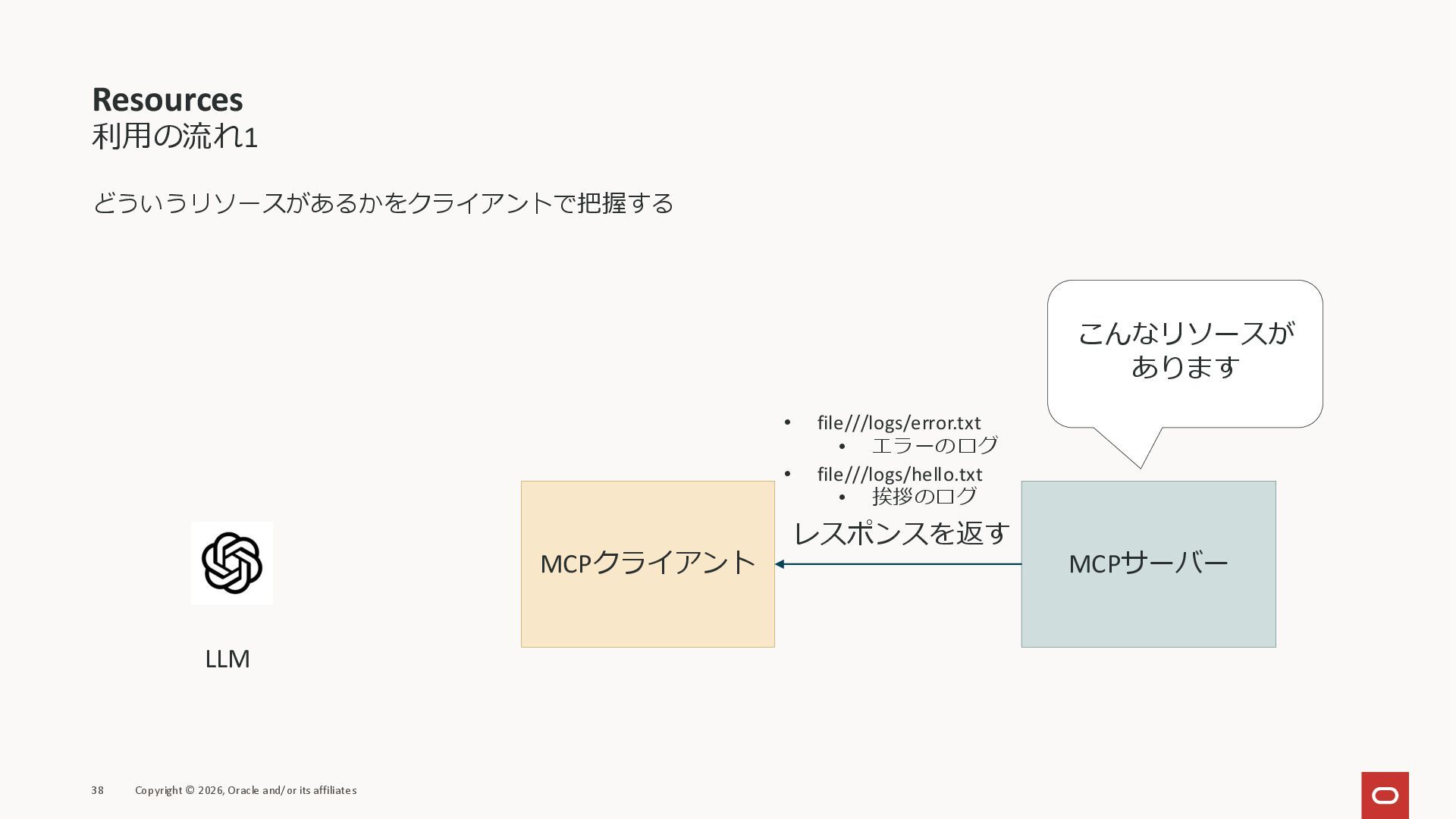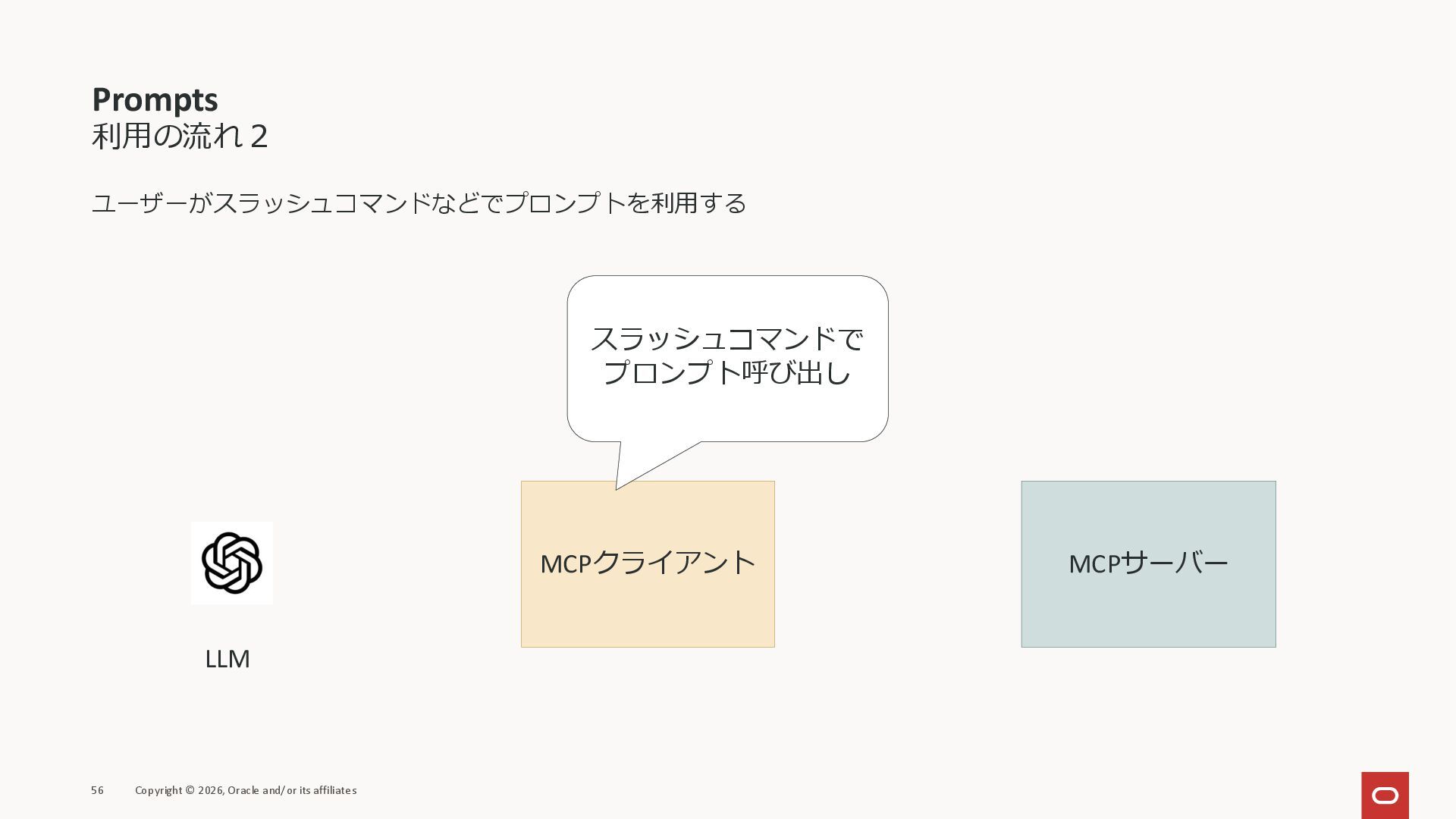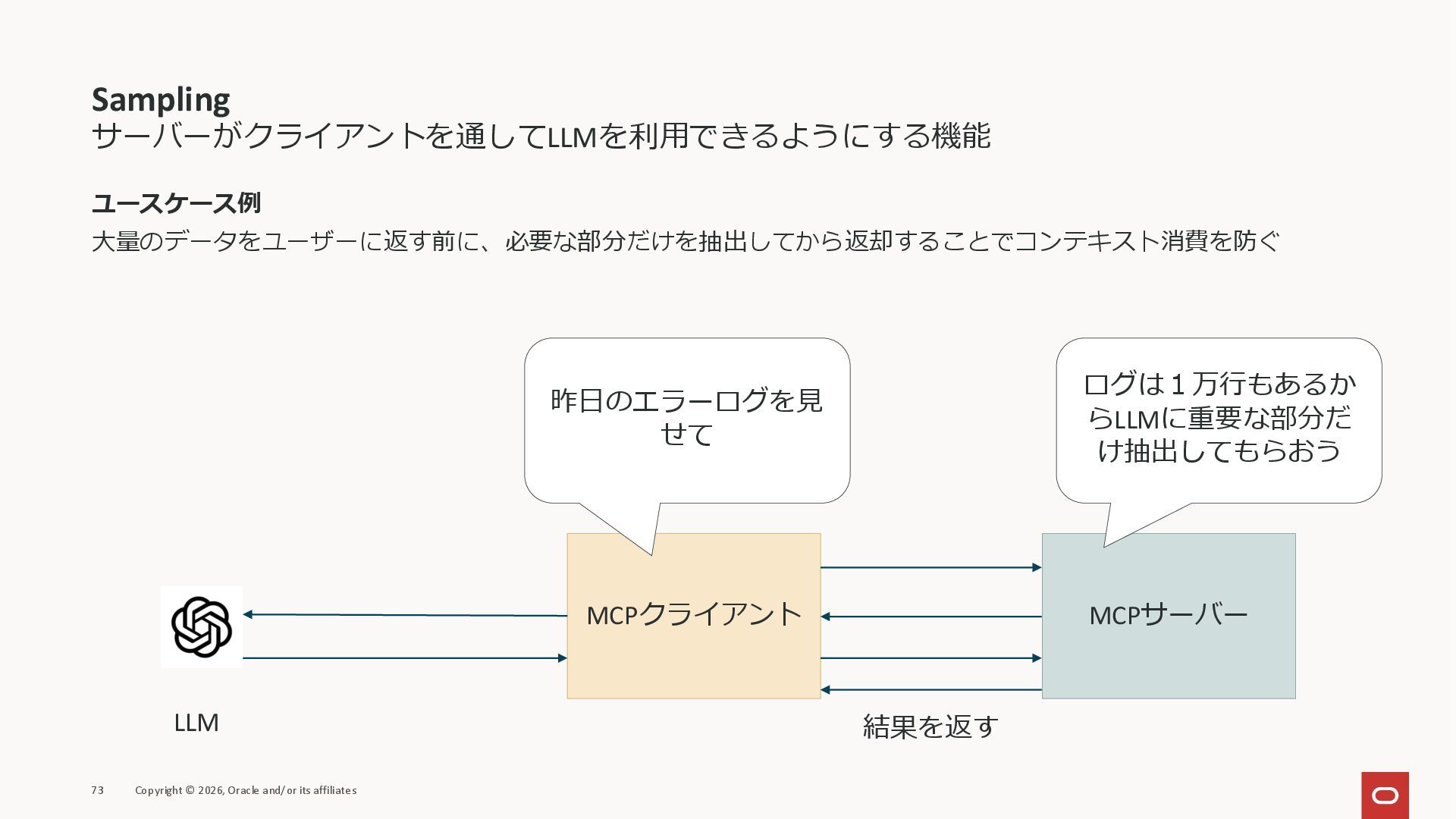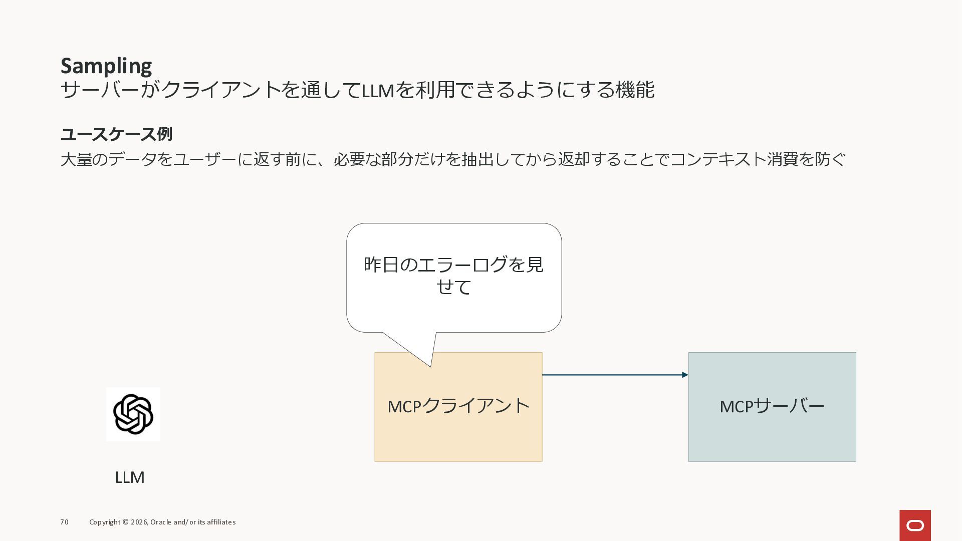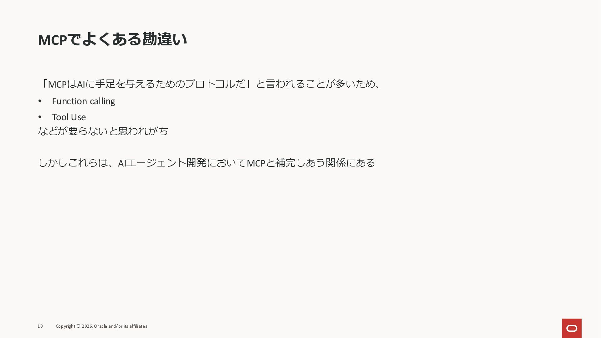 affiliates MCPクライアント MCPサーバー JSON-RPC 2.0 MCPの仕様 (メソッドなど) JSON-RPC 2.0 MCPの仕様 (メソッドなど) *JSON-RPC 2.0では、jsonrpc, id, method, paramsなどのフィールドが定義されているが、その中に何がくるのかまでは定 義されていない MCPは、その中(例えばmethodの中)にどういう名前が入るかなどを定義している *https://www.jsonrpc.org/specification
