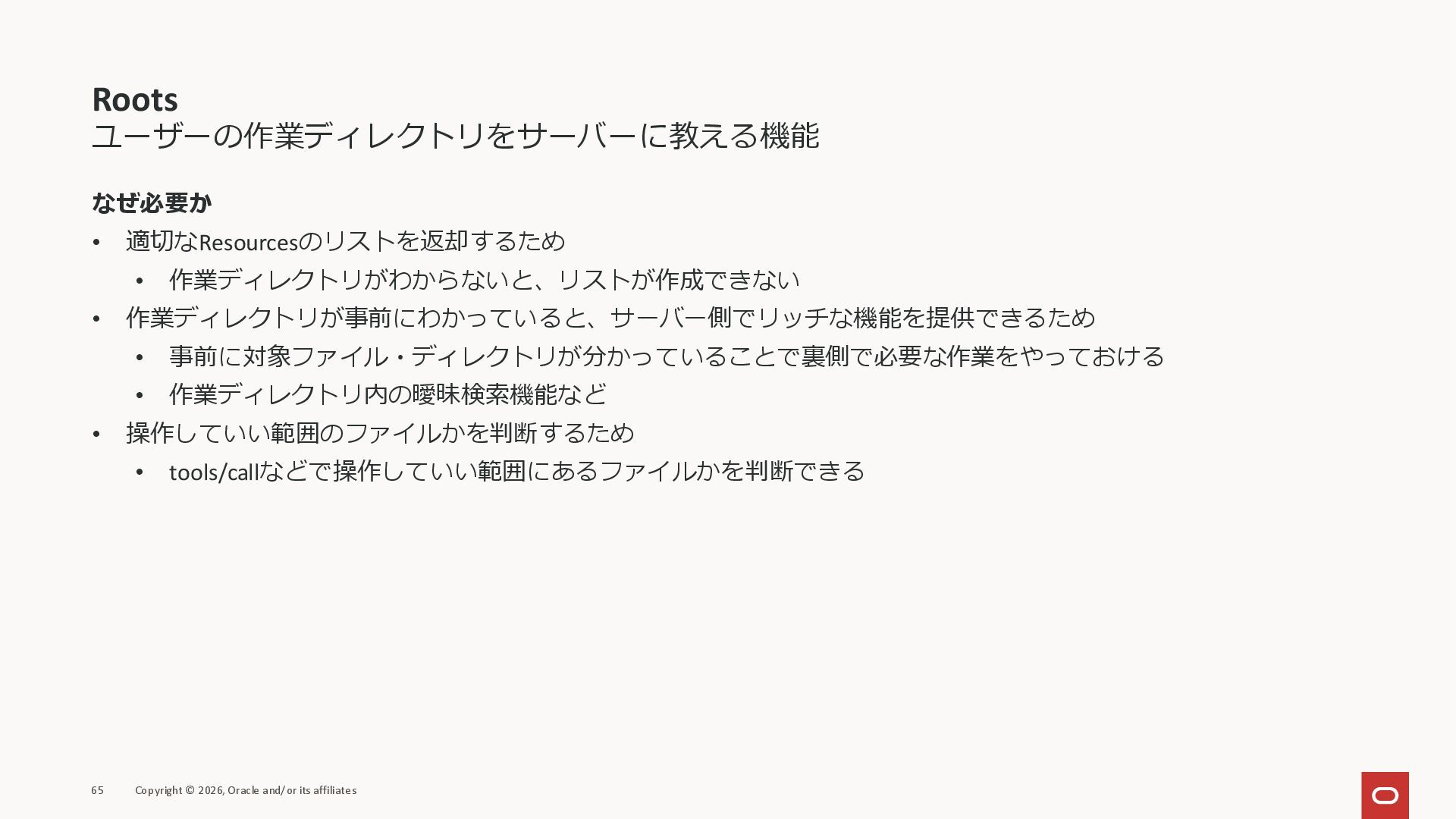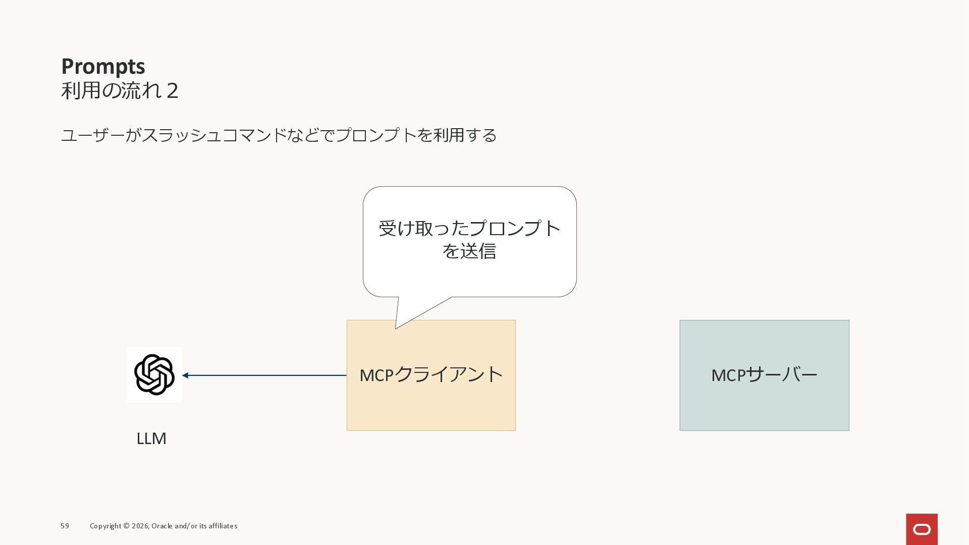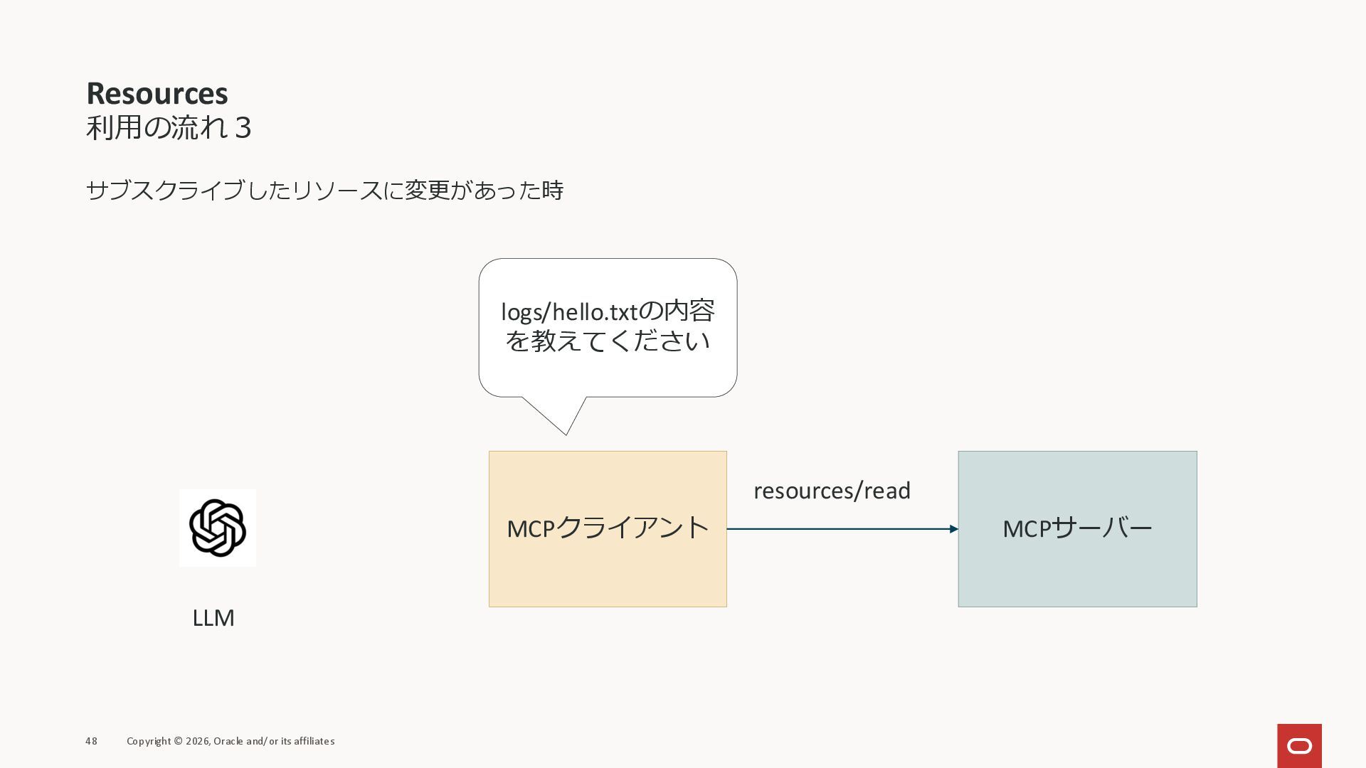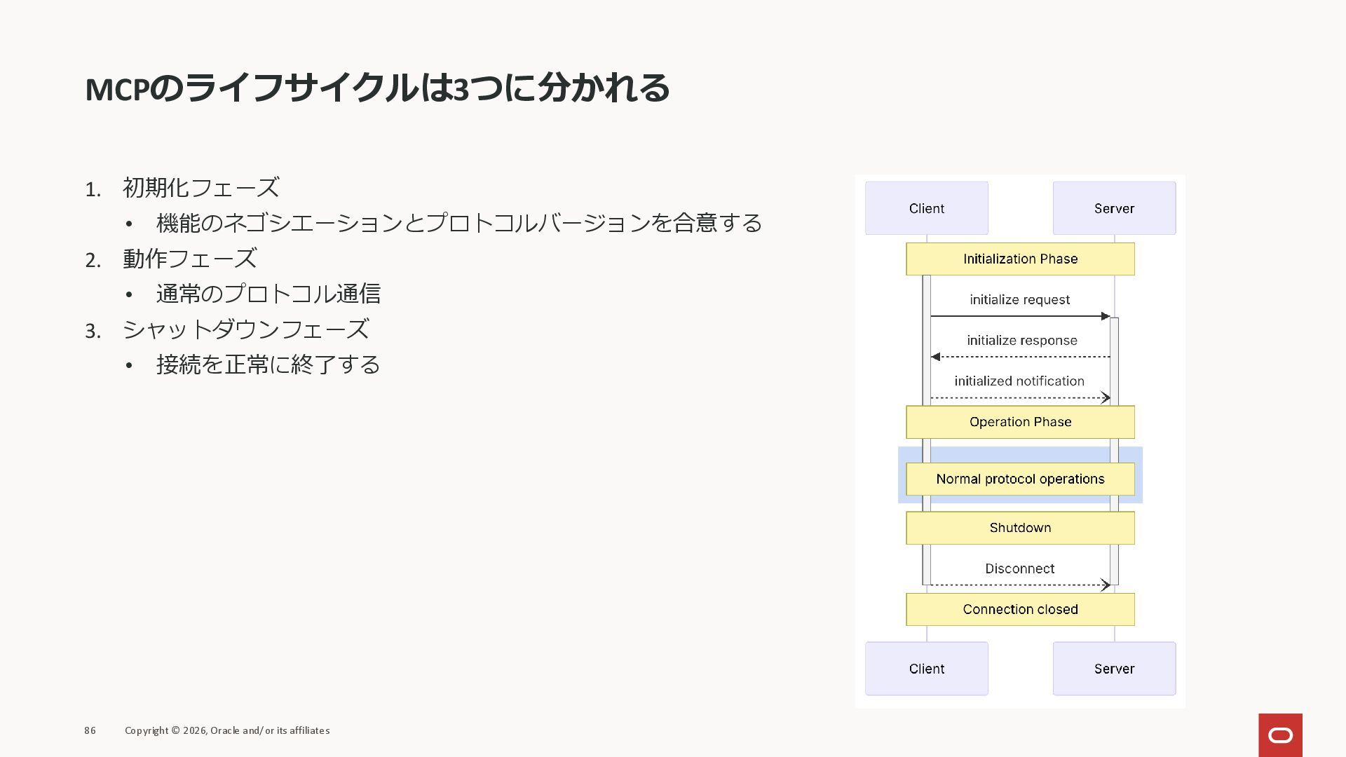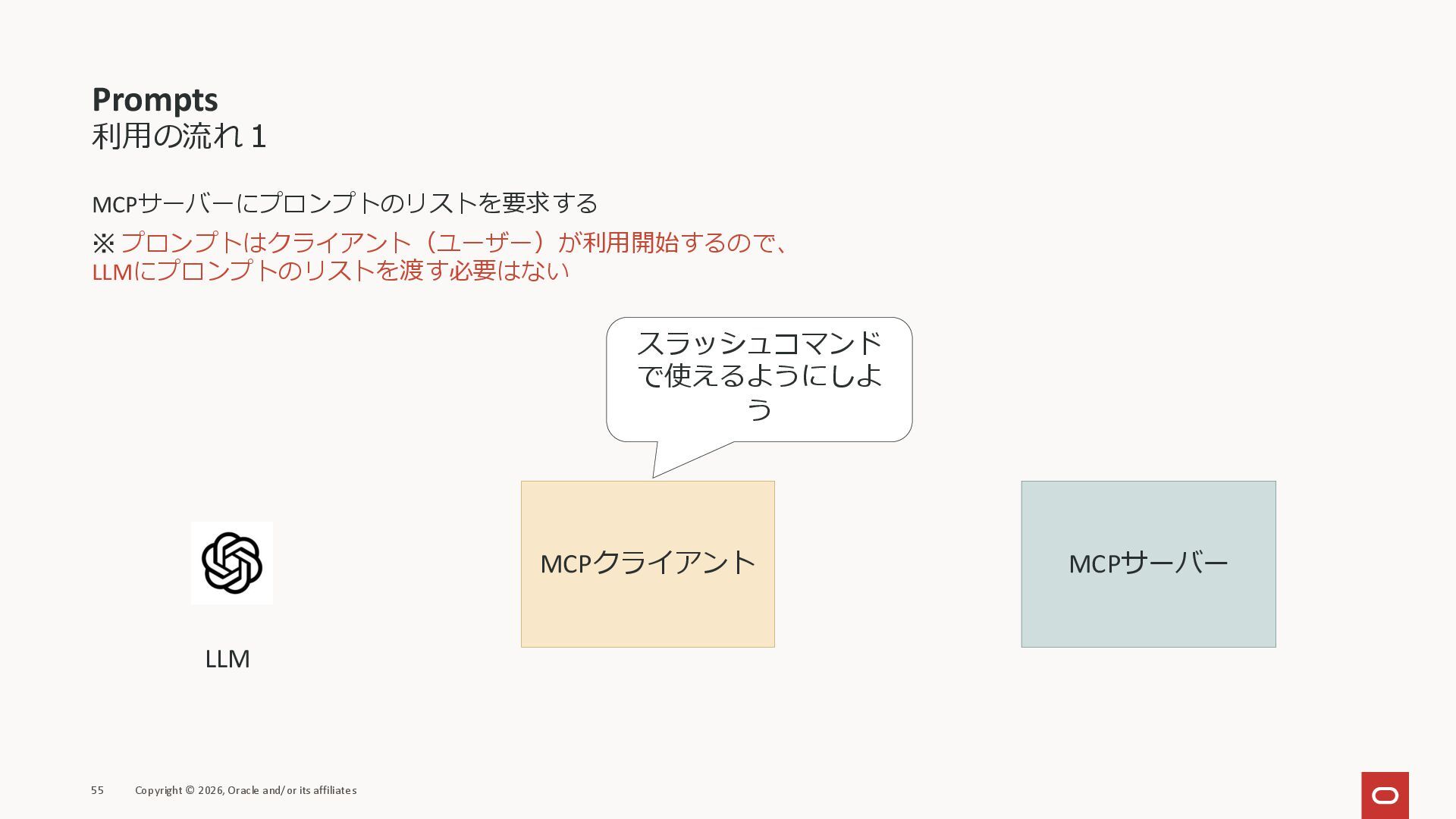 affiliates MCPクライアント MCPサーバー JSON-RPC 2.0 MCPの仕様 (メソッドなど) JSON-RPC 2.0 MCPの仕様 (メソッドなど) *JSON-RPC 2.0では、jsonrpc, id, method, paramsなどのフィールドが定義されているが、その中に何がくるのかまでは定 義されていない MCPは、その中(例えばmethodの中)にどういう名前が入るかなどを定義している *https://www.jsonrpc.org/specification
