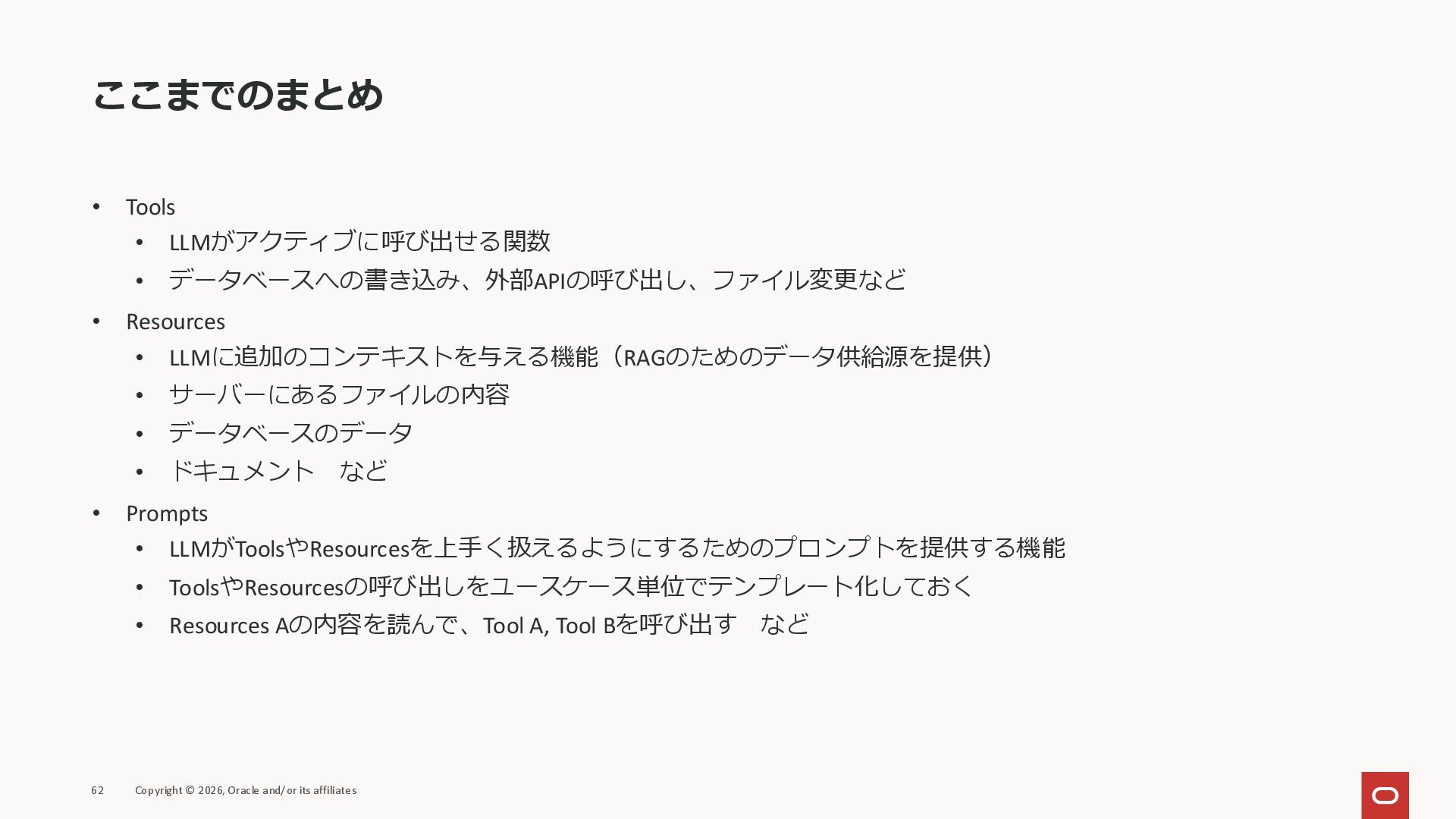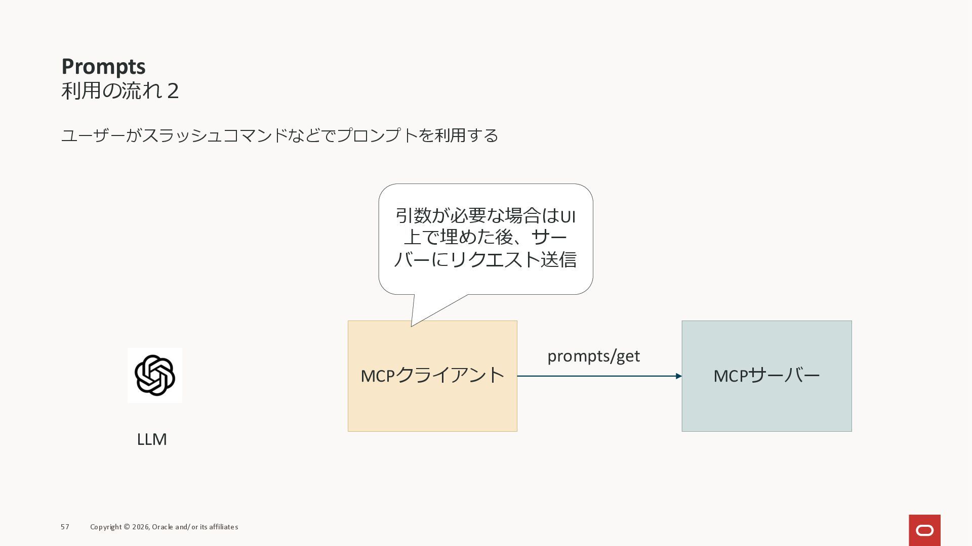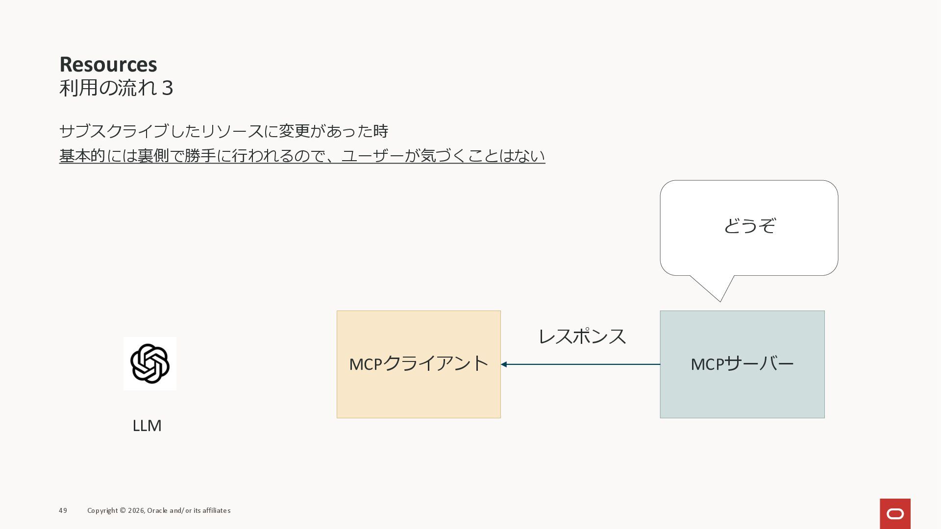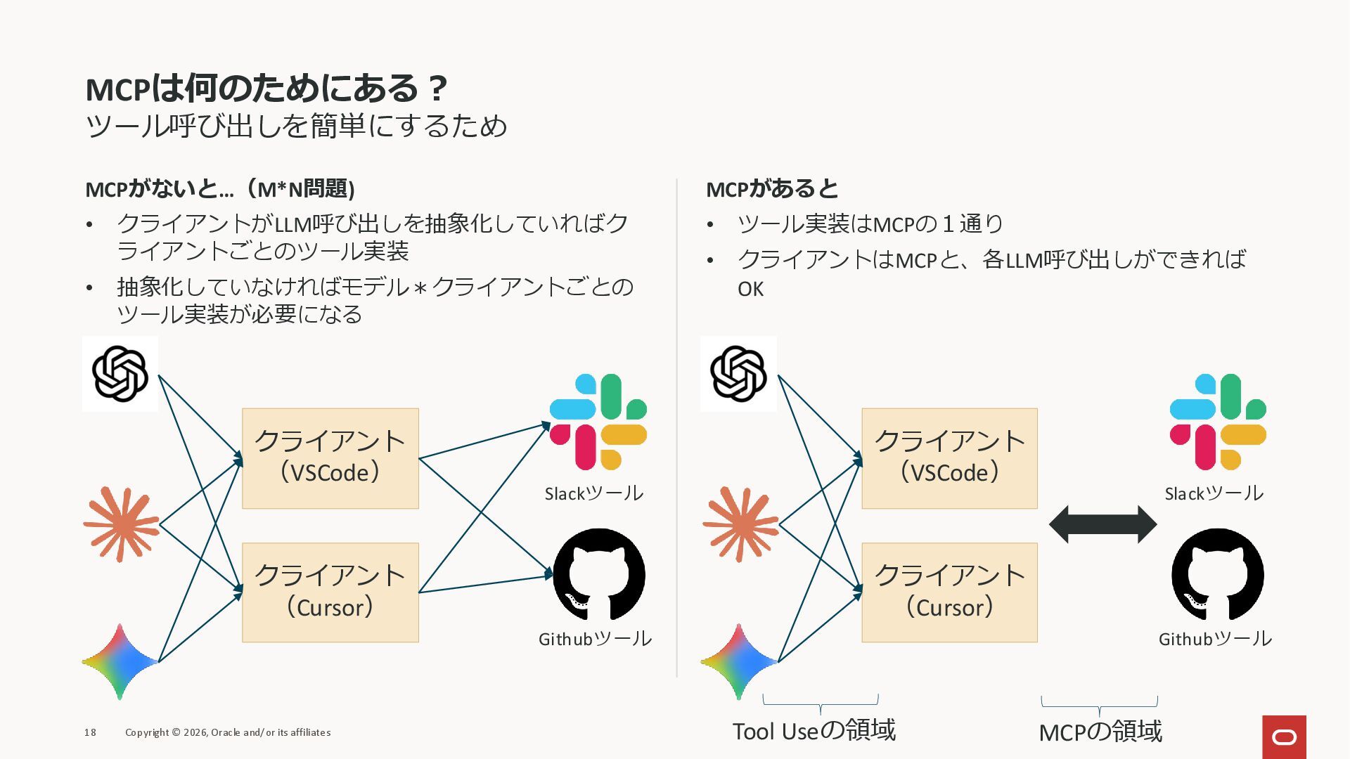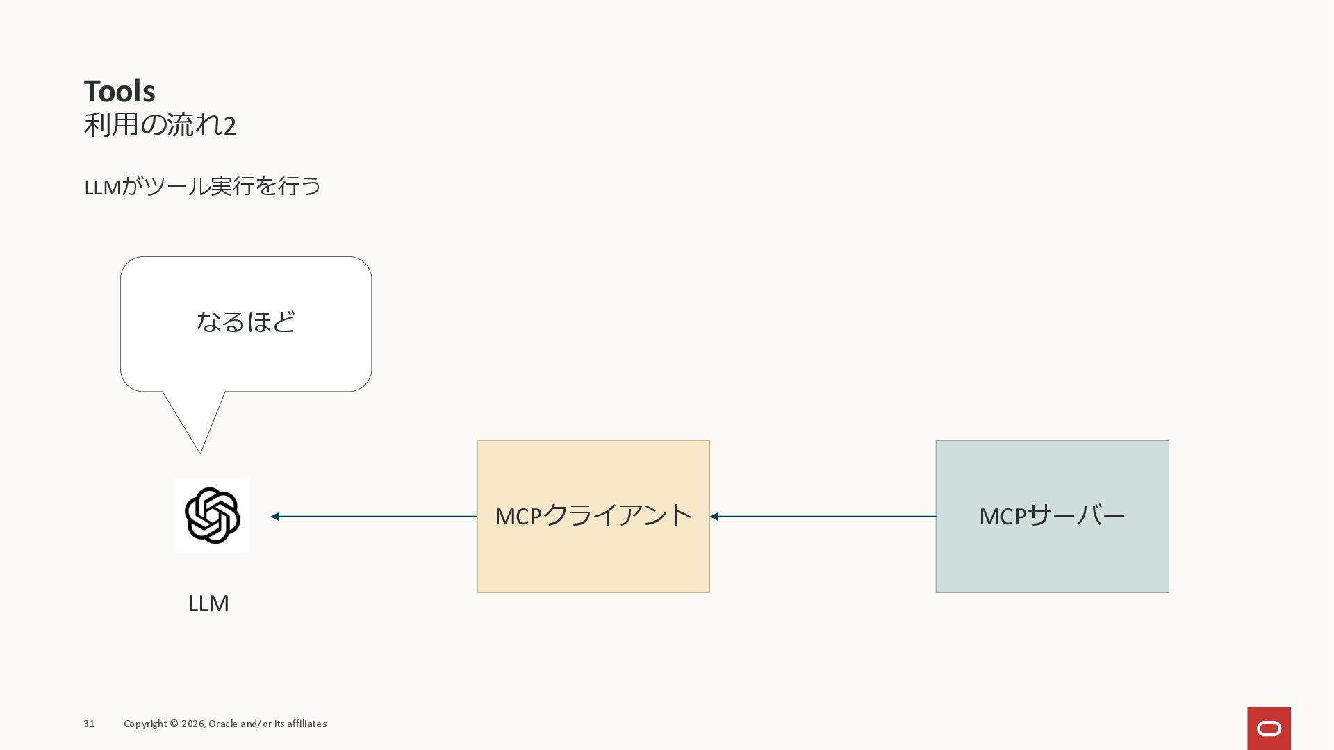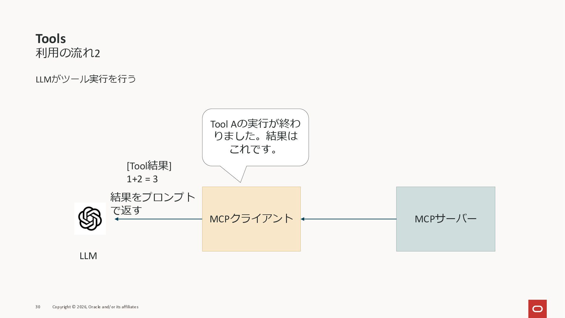 affiliates MCPクライアント MCPサーバー JSON-RPC 2.0 MCPの仕様 (メソッドなど) JSON-RPC 2.0 MCPの仕様 (メソッドなど) *JSON-RPC 2.0では、jsonrpc, id, method, paramsなどのフィールドが定義されているが、その中に何がくるのかまでは定 義されていない MCPは、その中(例えばmethodの中)にどういう名前が入るかなどを定義している *https://www.jsonrpc.org/specification
