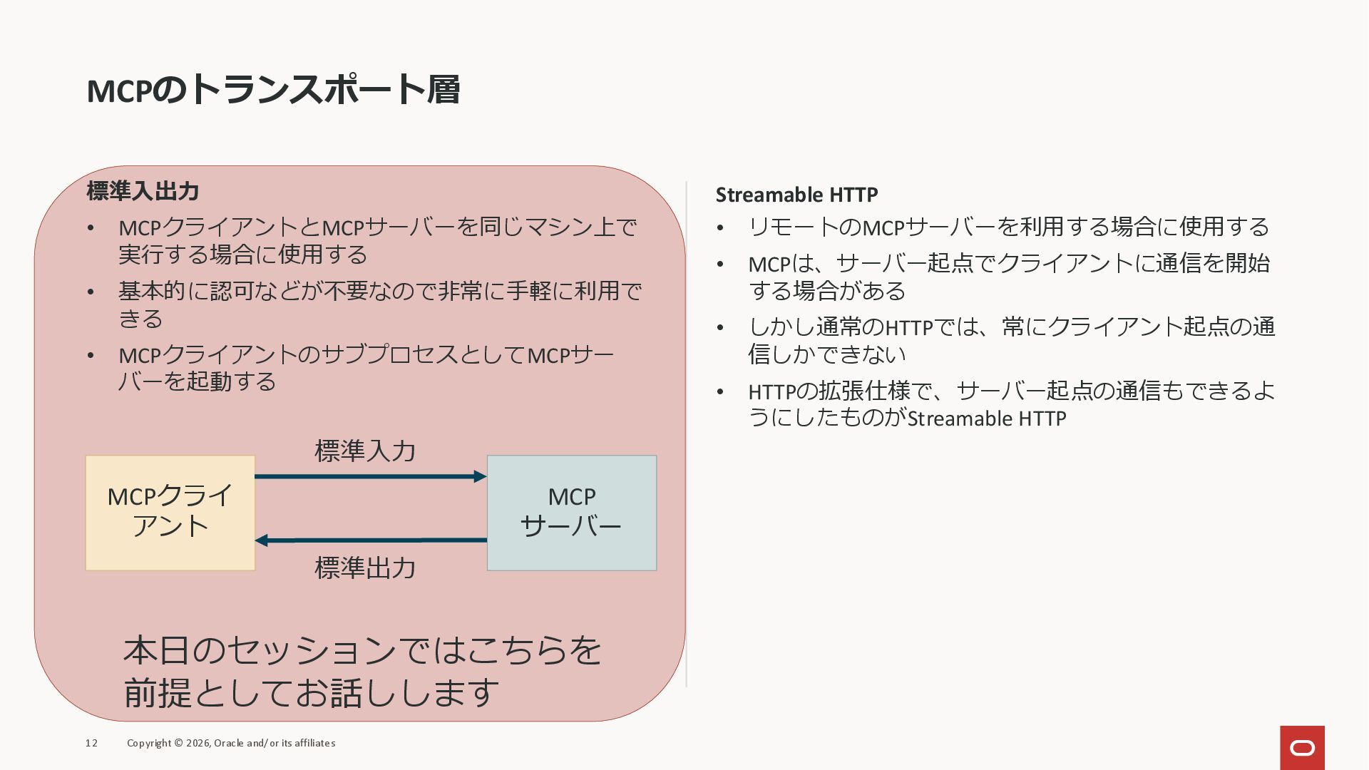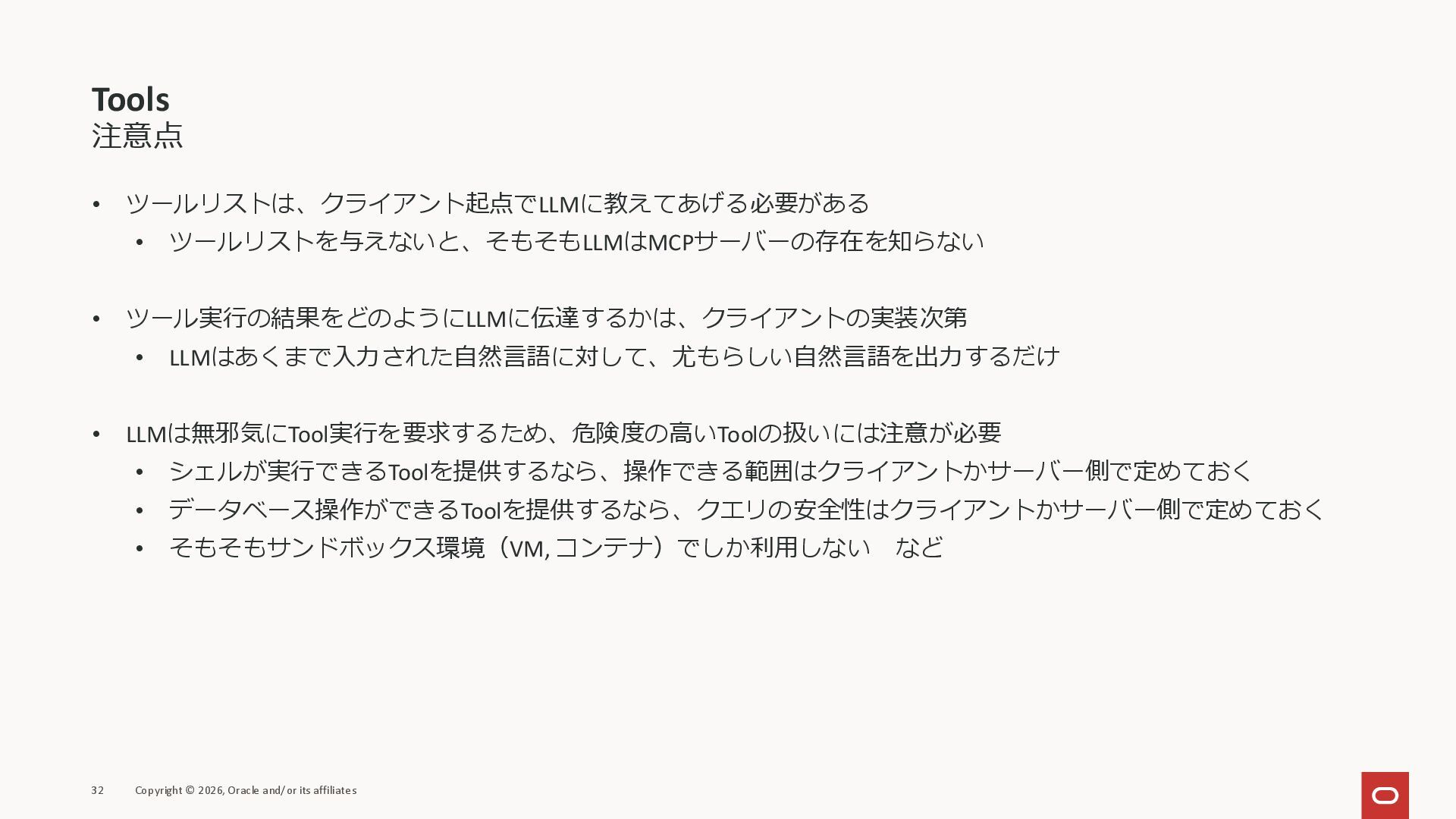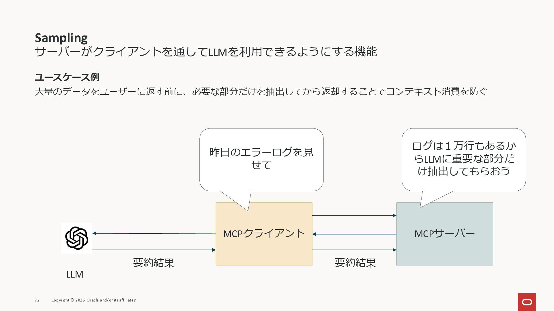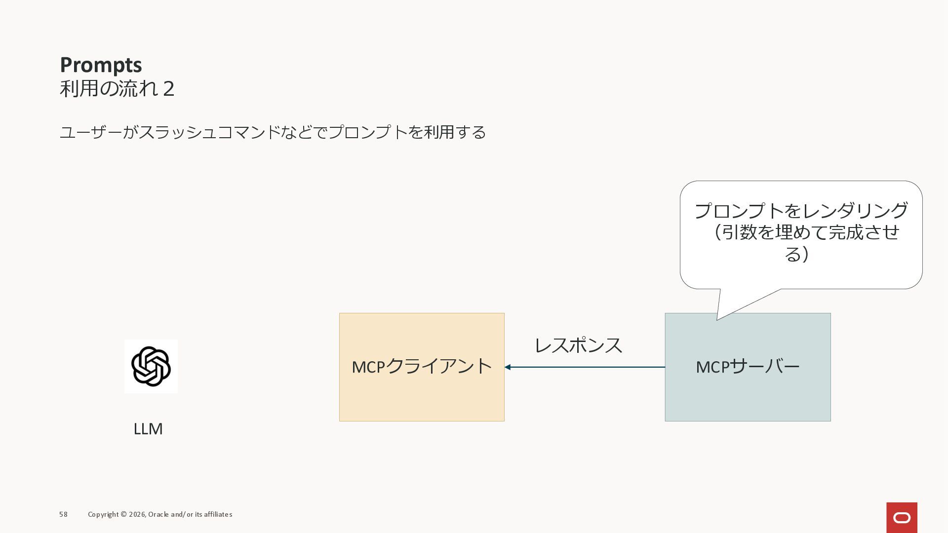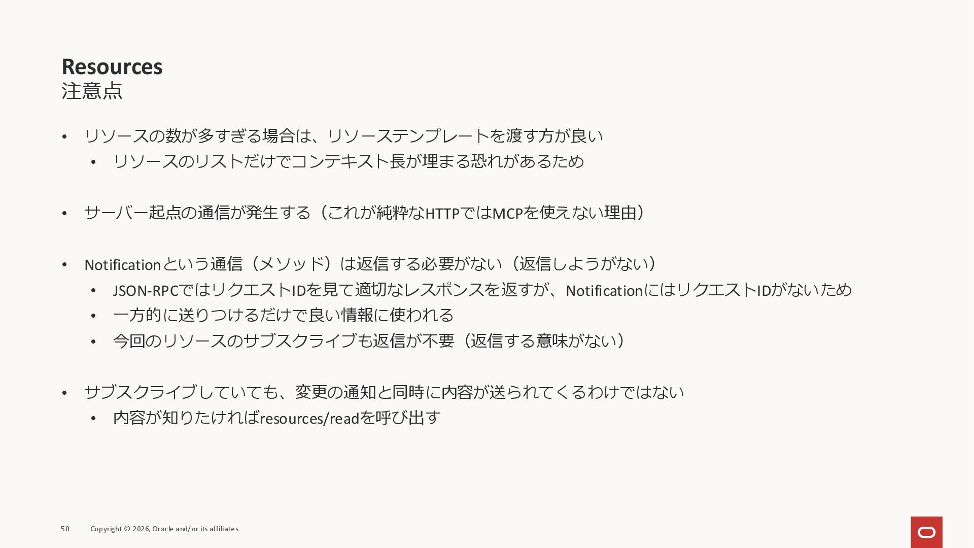 affiliates MCPクライアント MCPサーバー JSON-RPC 2.0 MCPの仕様 (メソッドなど) JSON-RPC 2.0 MCPの仕様 (メソッドなど) *JSON-RPC 2.0では、jsonrpc, id, method, paramsなどのフィールドが定義されているが、その中に何がくるのかまでは定 義されていない MCPは、その中(例えばmethodの中)にどういう名前が入るかなどを定義している *https://www.jsonrpc.org/specification