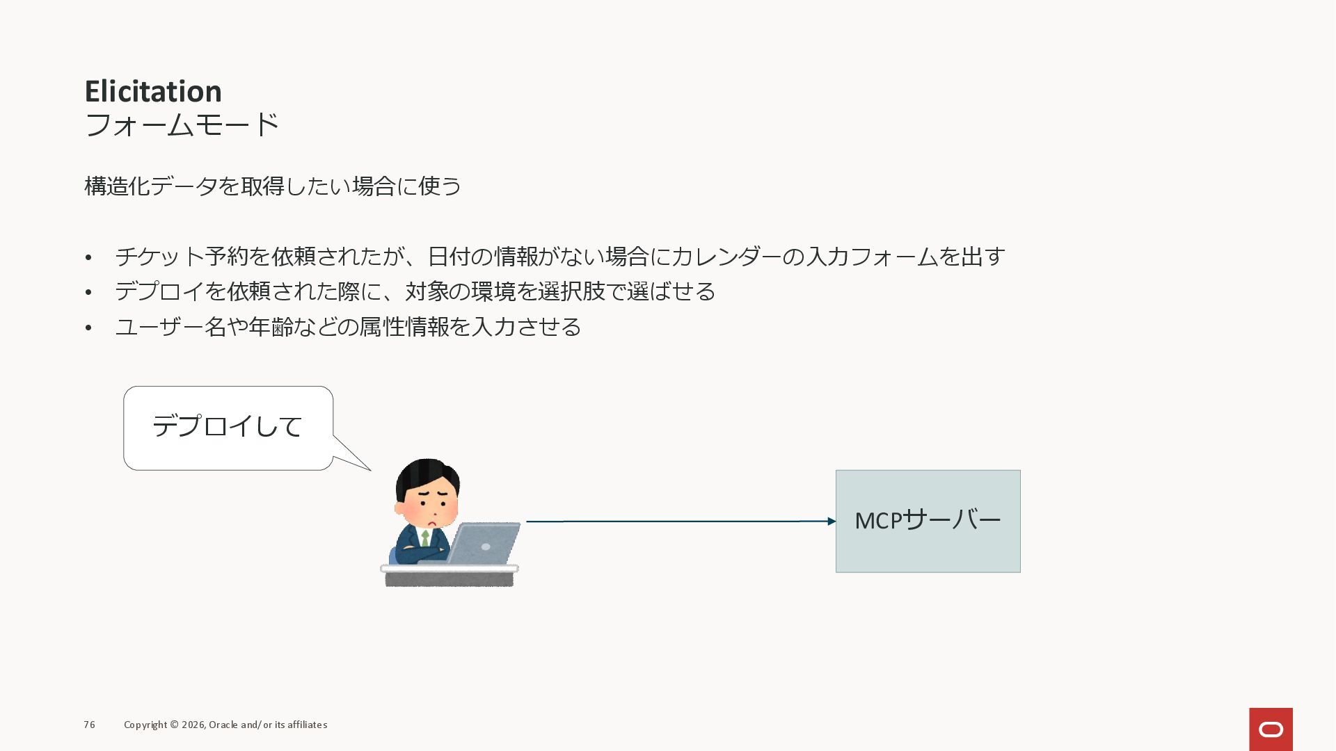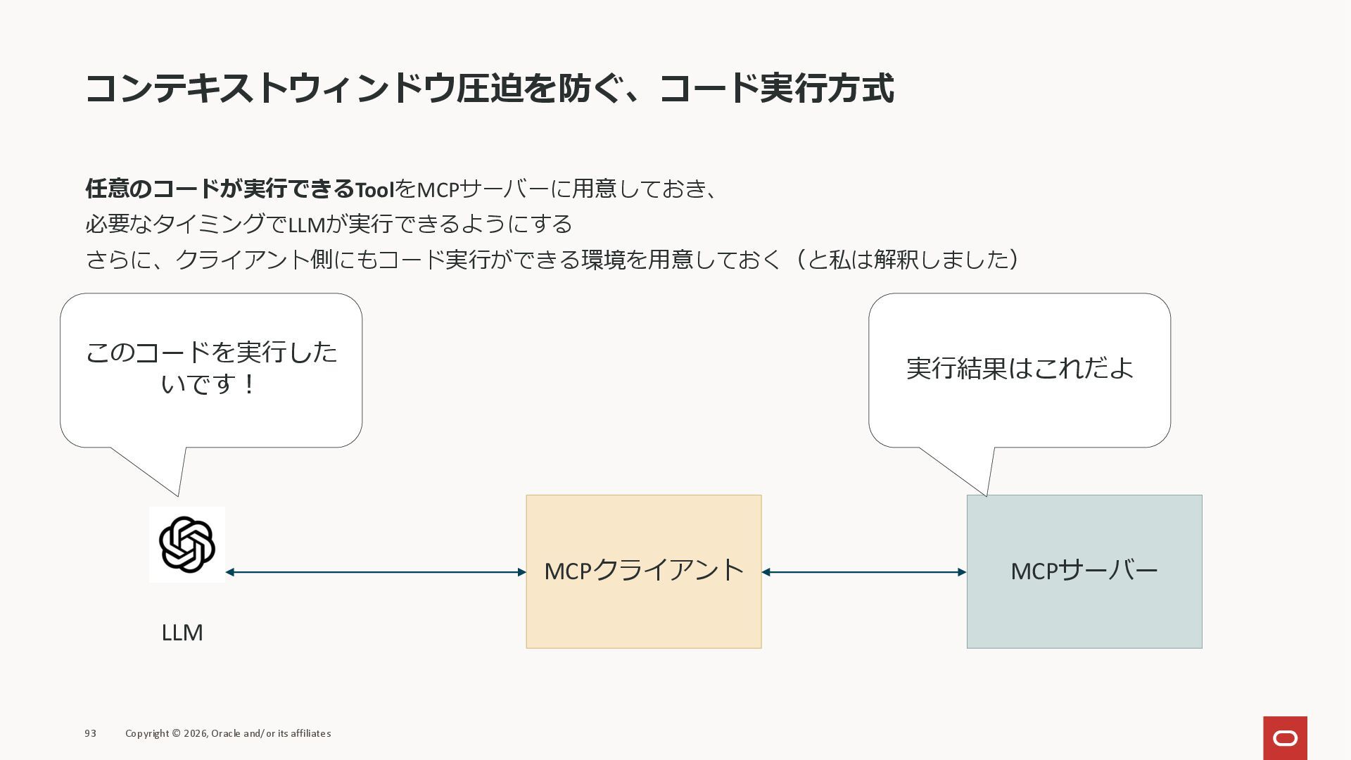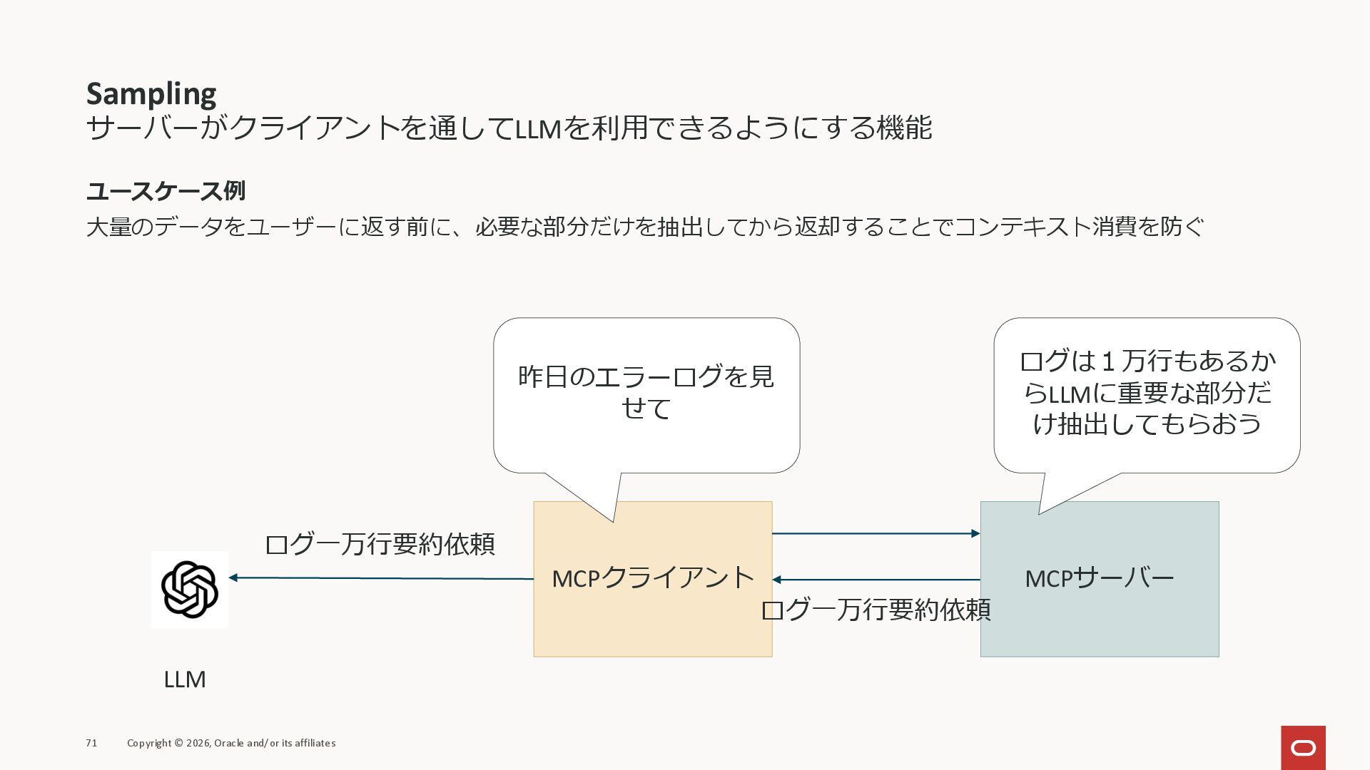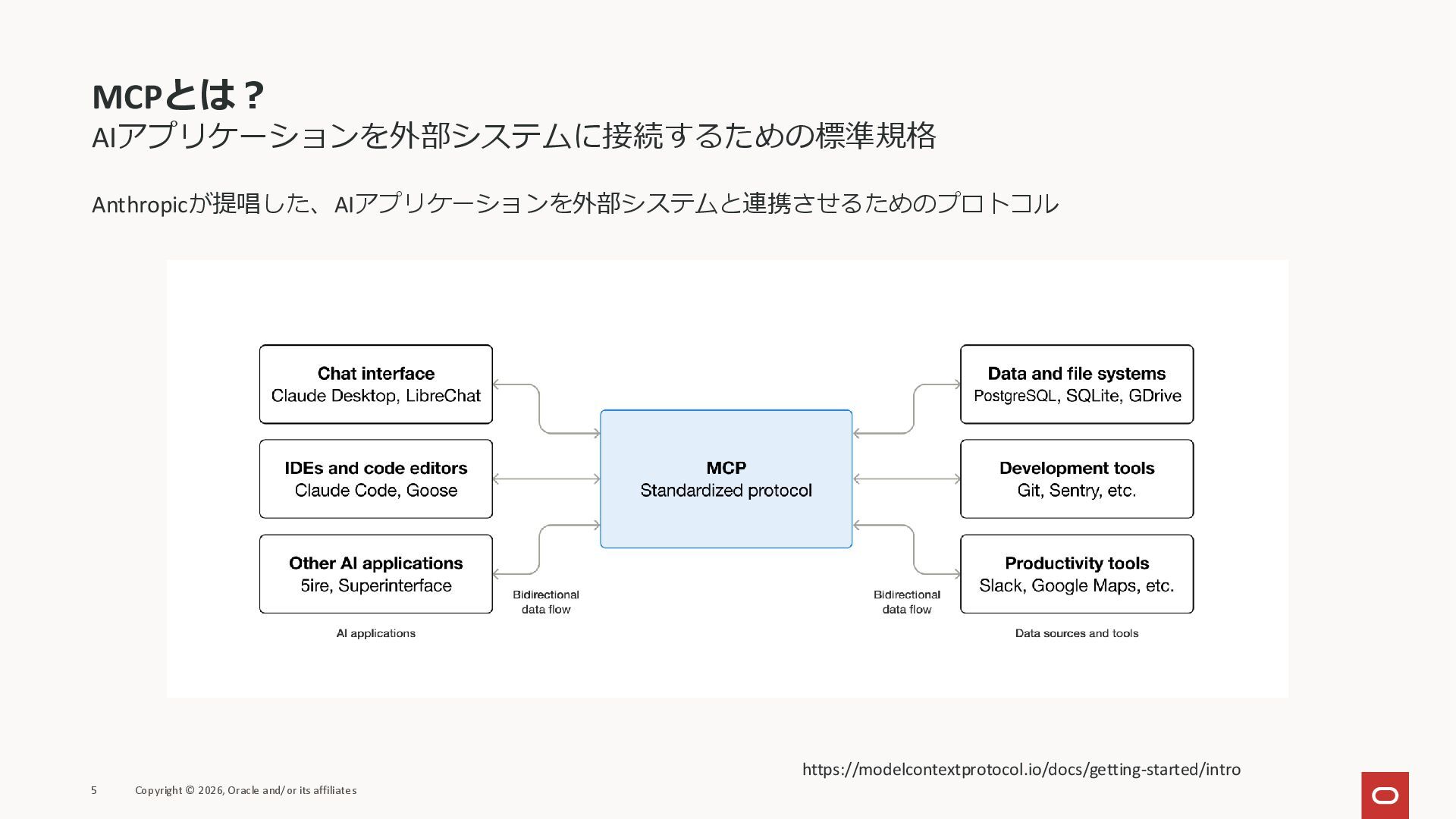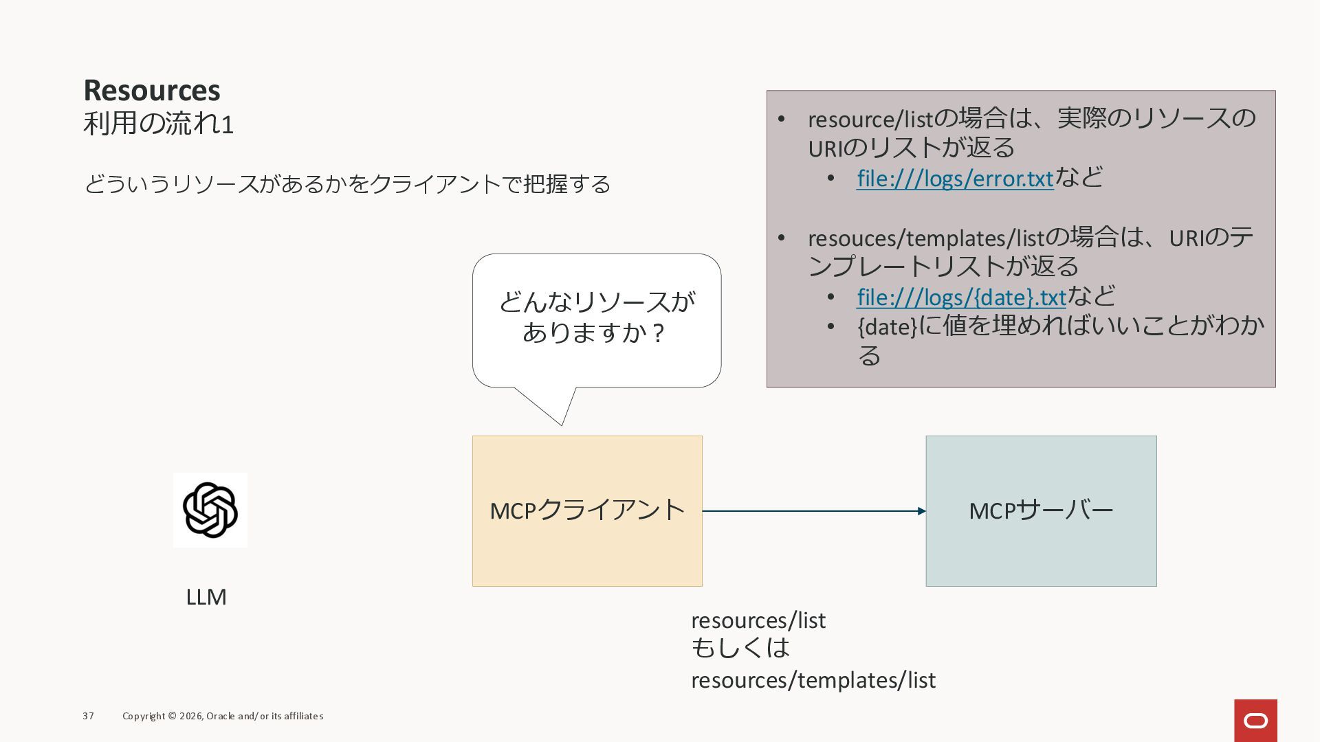 affiliates MCPクライアント MCPサーバー JSON-RPC 2.0 MCPの仕様 (メソッドなど) JSON-RPC 2.0 MCPの仕様 (メソッドなど) *JSON-RPC 2.0では、jsonrpc, id, method, paramsなどのフィールドが定義されているが、その中に何がくるのかまでは定 義されていない MCPは、その中(例えばmethodの中)にどういう名前が入るかなどを定義している *https://www.jsonrpc.org/specification