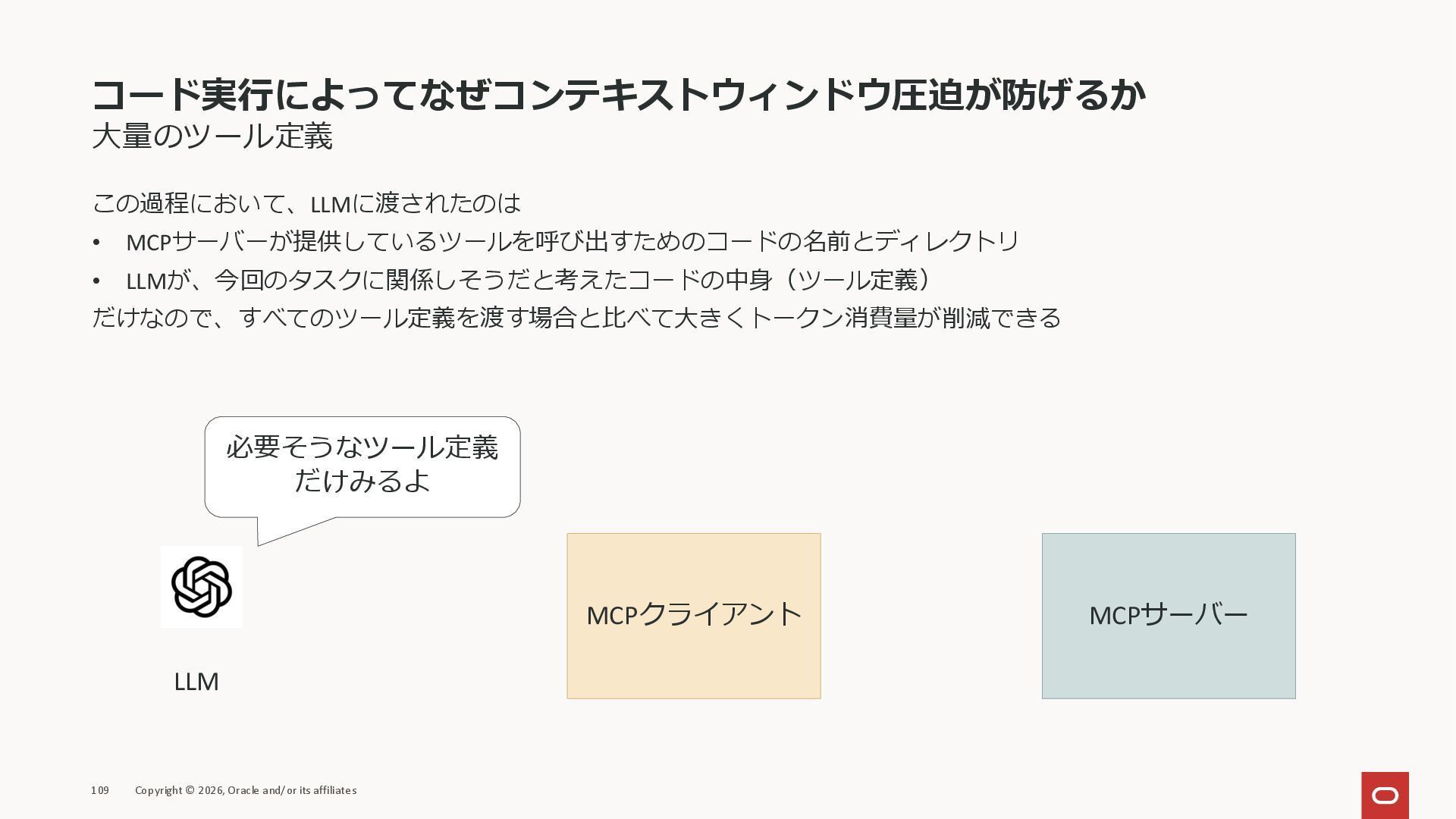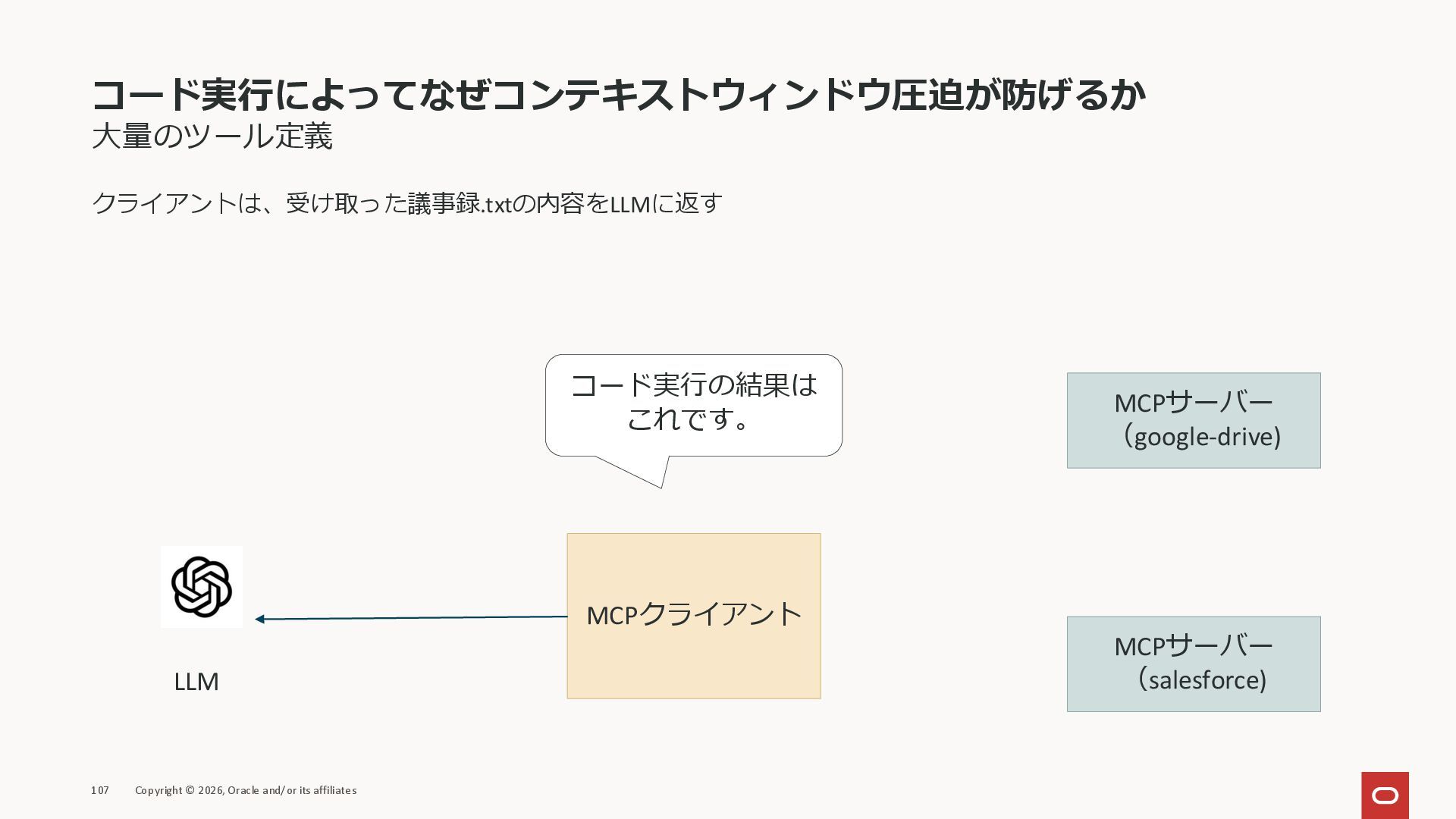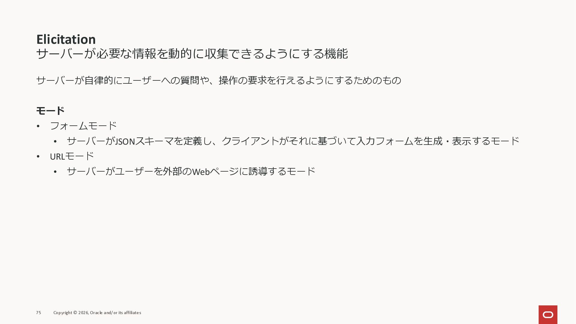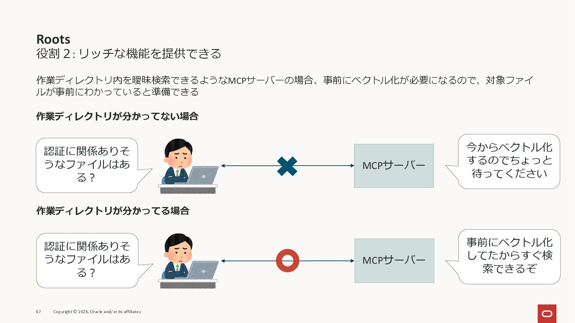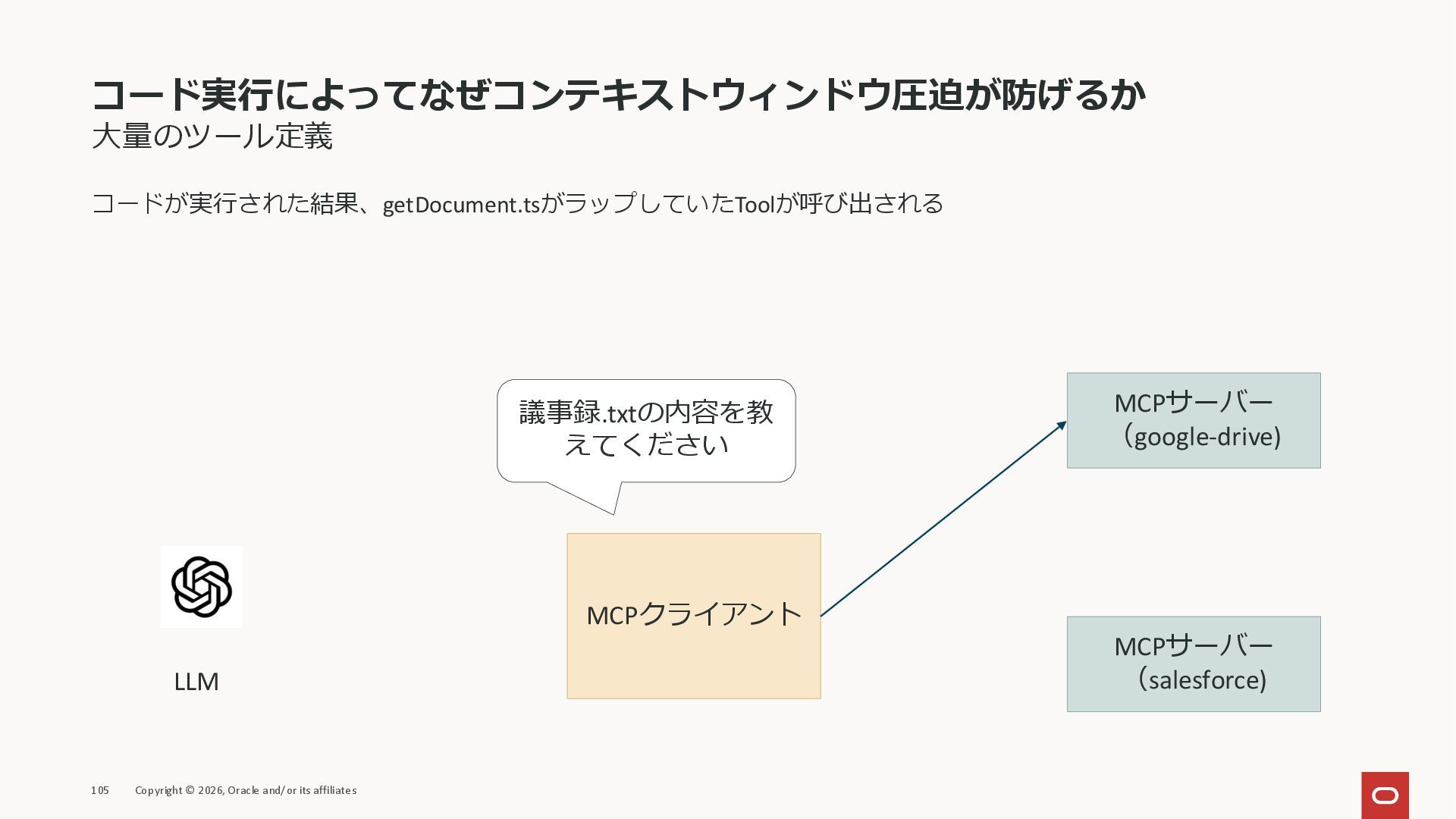 affiliates MCPクライアント MCPサーバー JSON-RPC 2.0 MCPの仕様 (メソッドなど) JSON-RPC 2.0 MCPの仕様 (メソッドなど) *JSON-RPC 2.0では、jsonrpc, id, method, paramsなどのフィールドが定義されているが、その中に何がくるのかまでは定 義されていない MCPは、その中(例えばmethodの中)にどういう名前が入るかなどを定義している *https://www.jsonrpc.org/specification