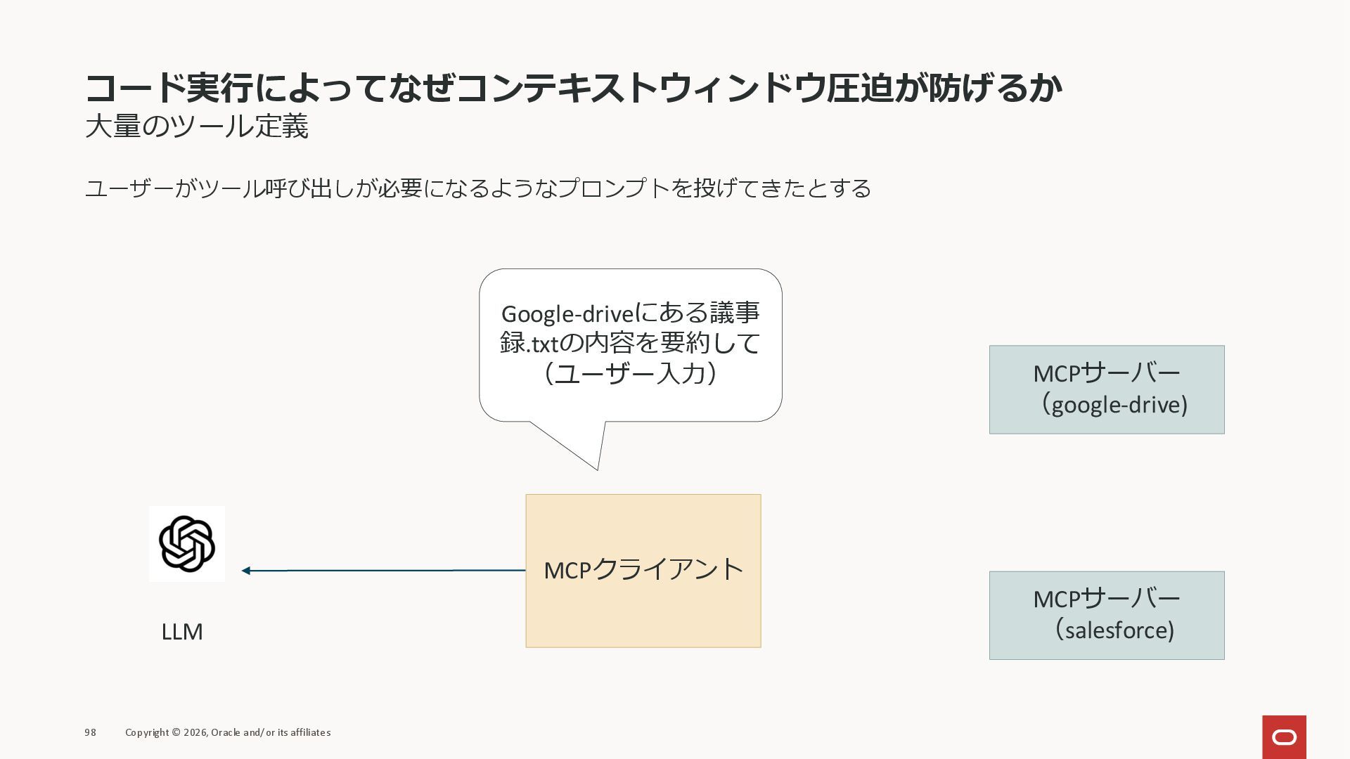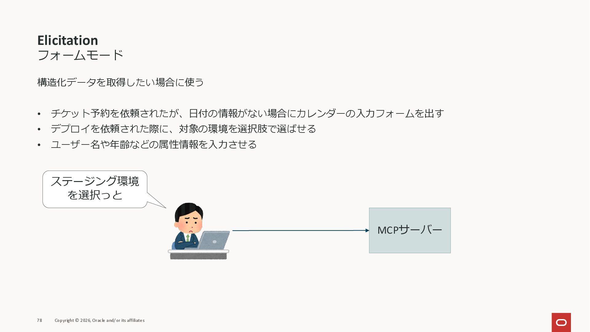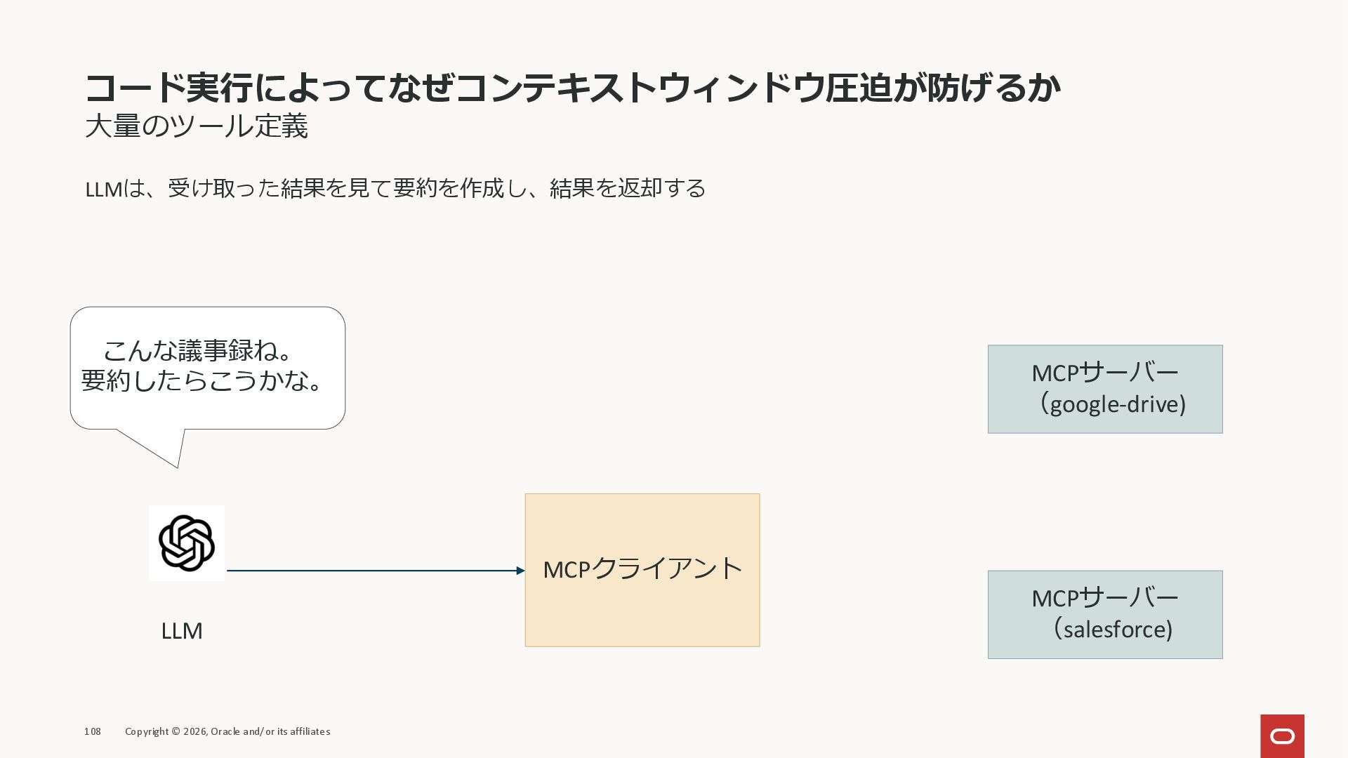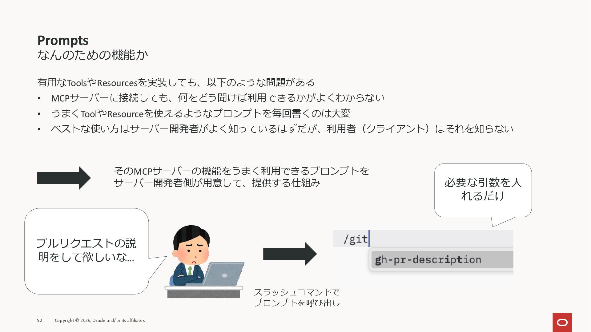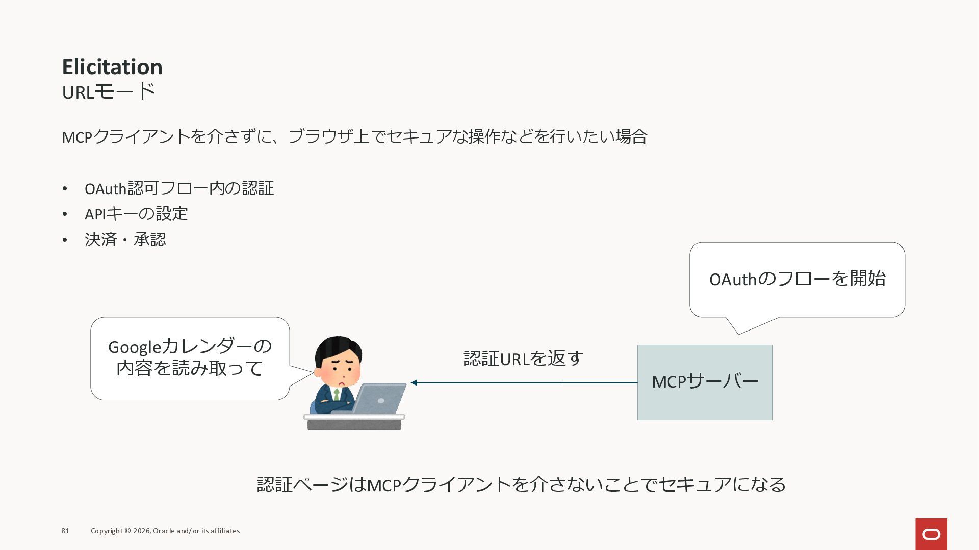 affiliates MCPクライアント MCPサーバー JSON-RPC 2.0 MCPの仕様 (メソッドなど) JSON-RPC 2.0 MCPの仕様 (メソッドなど) *JSON-RPC 2.0では、jsonrpc, id, method, paramsなどのフィールドが定義されているが、その中に何がくるのかまでは定 義されていない MCPは、その中(例えばmethodの中)にどういう名前が入るかなどを定義している *https://www.jsonrpc.org/specification