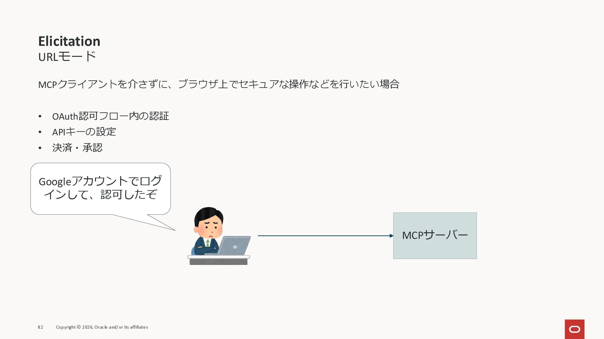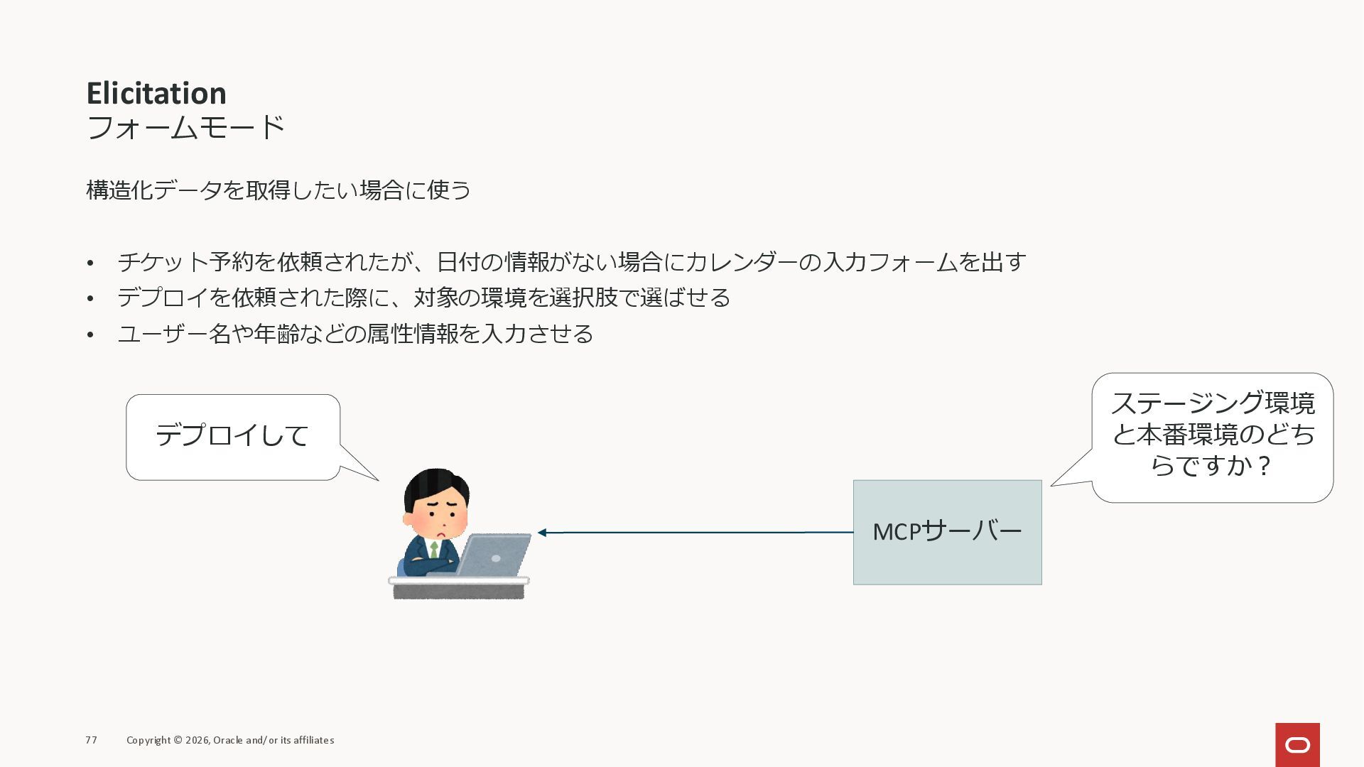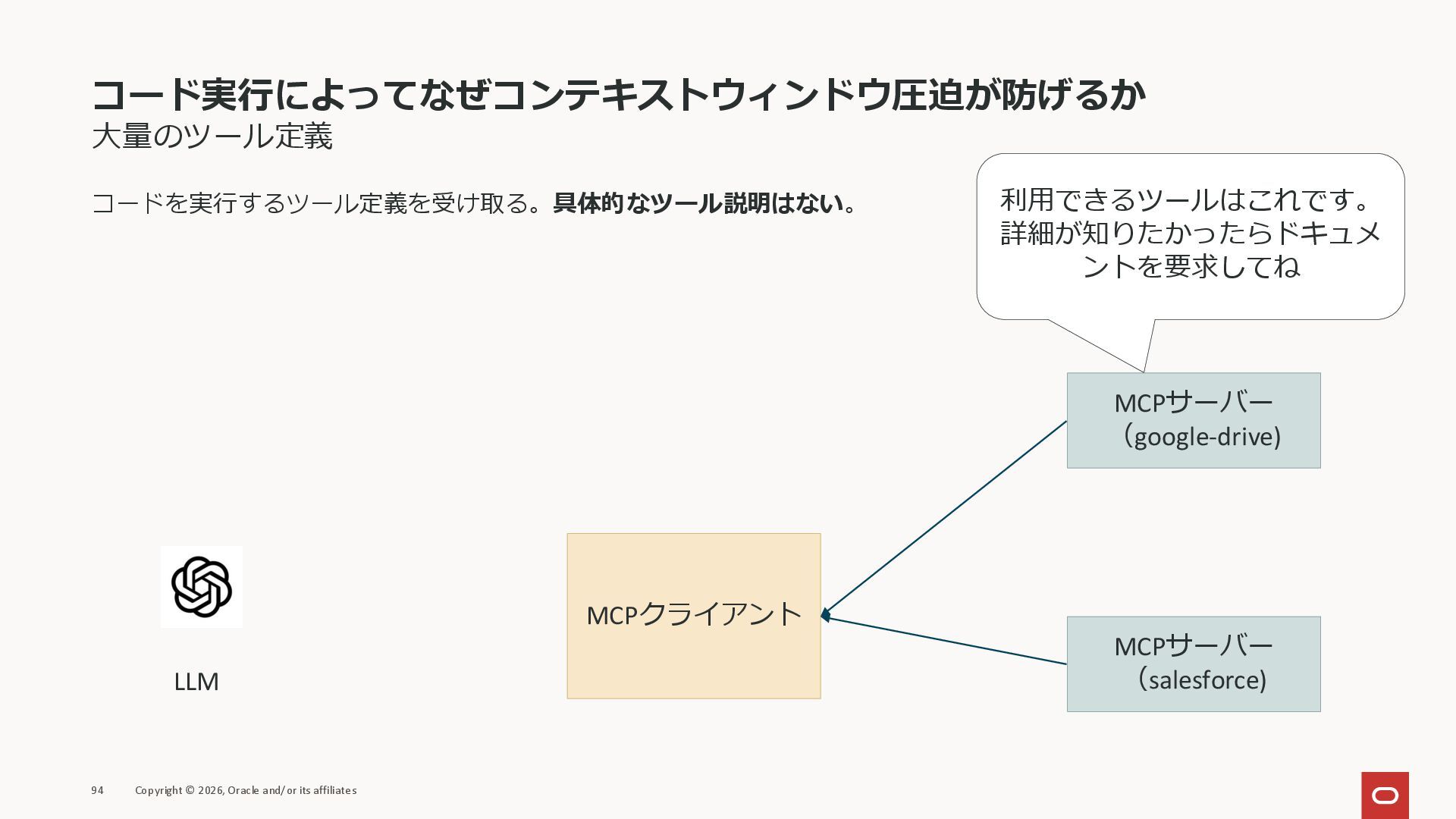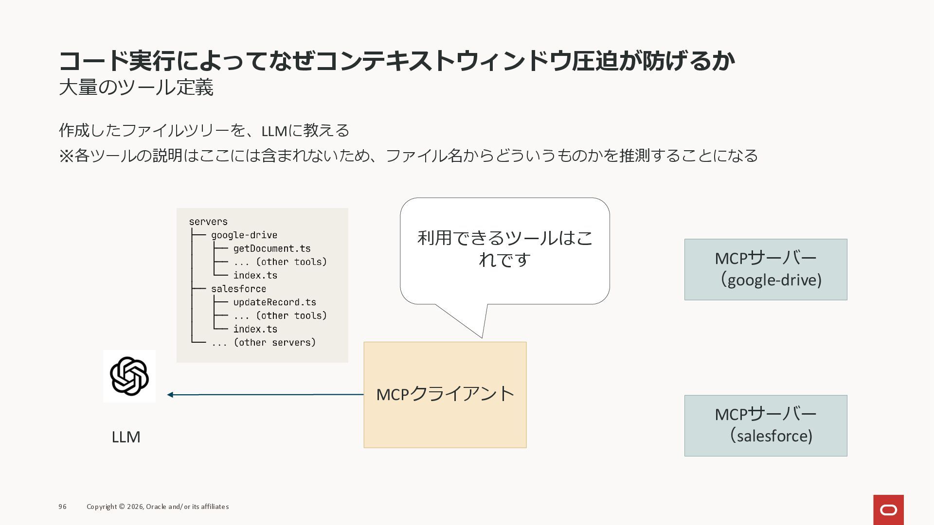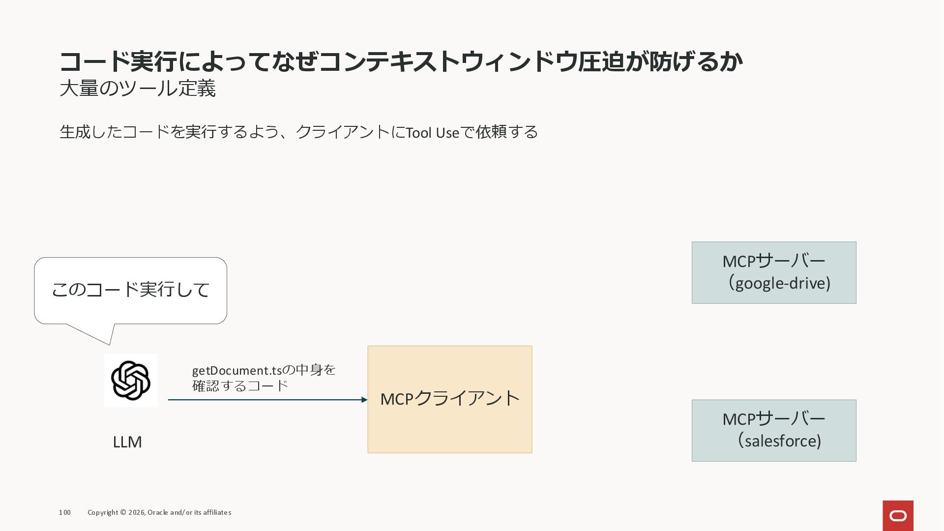 affiliates MCPクライアント MCPサーバー JSON-RPC 2.0 MCPの仕様 (メソッドなど) JSON-RPC 2.0 MCPの仕様 (メソッドなど) *JSON-RPC 2.0では、jsonrpc, id, method, paramsなどのフィールドが定義されているが、その中に何がくるのかまでは定 義されていない MCPは、その中(例えばmethodの中)にどういう名前が入るかなどを定義している *https://www.jsonrpc.org/specification
