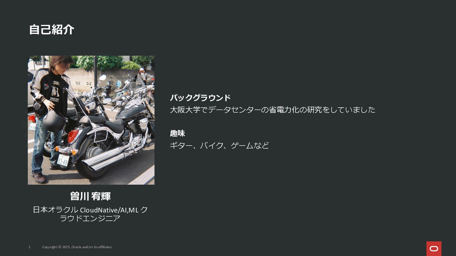 自己紹介 曽川 宥輝 日本オラクル CloudNative/AI,ML ク ラウドエンジニア バックグラウンド 大阪大学でデータセンターの省電力化の研究をしていました 趣味