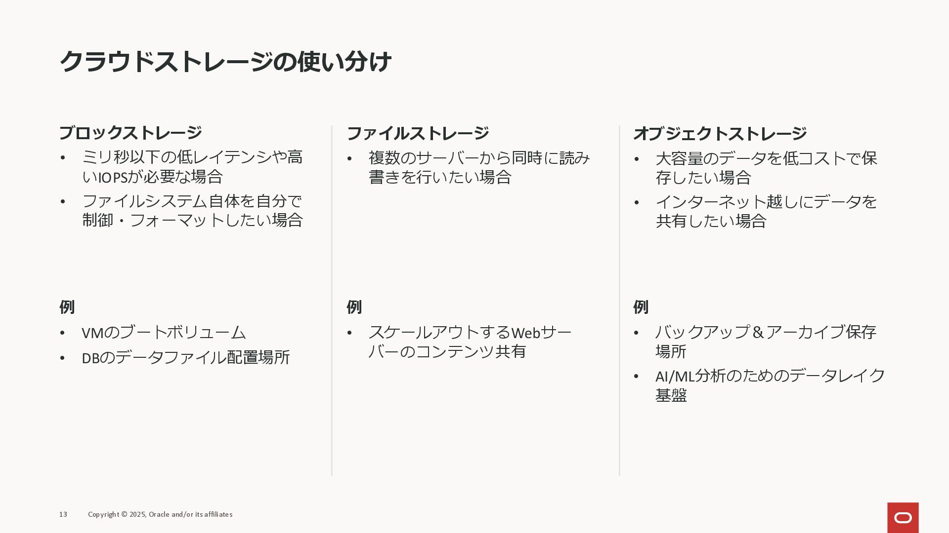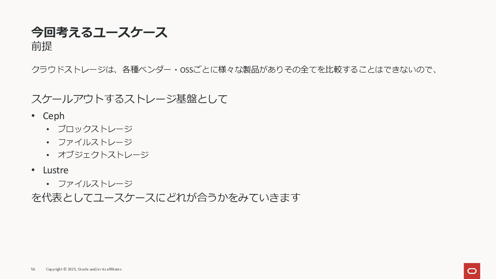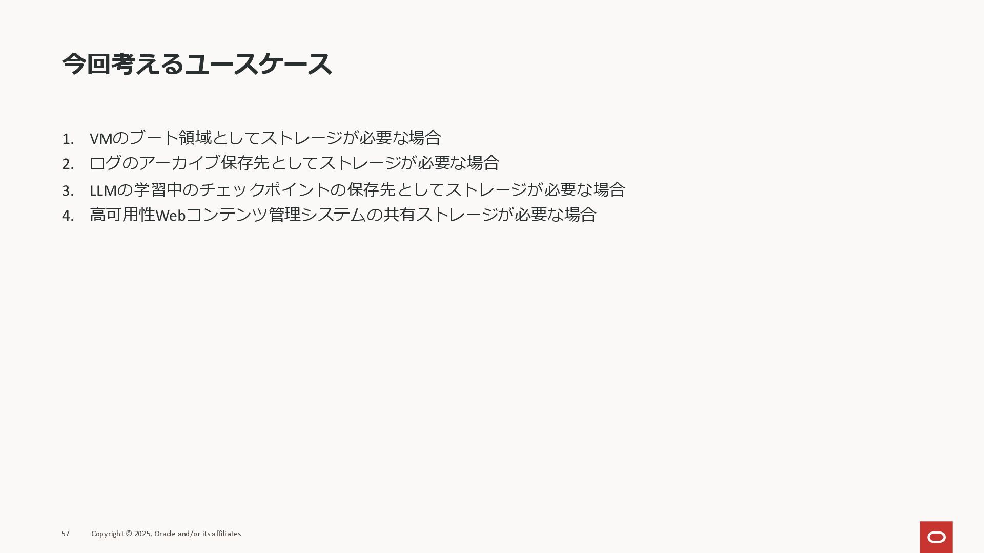 • オブジェクトストレージ • Lustre • ファイルストレージ を代表としてユースケースにどれが合うかをみていきます 56 Copyright © 2025, Oracle and/or its affiliates