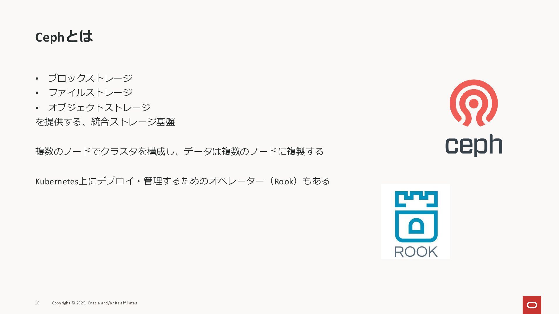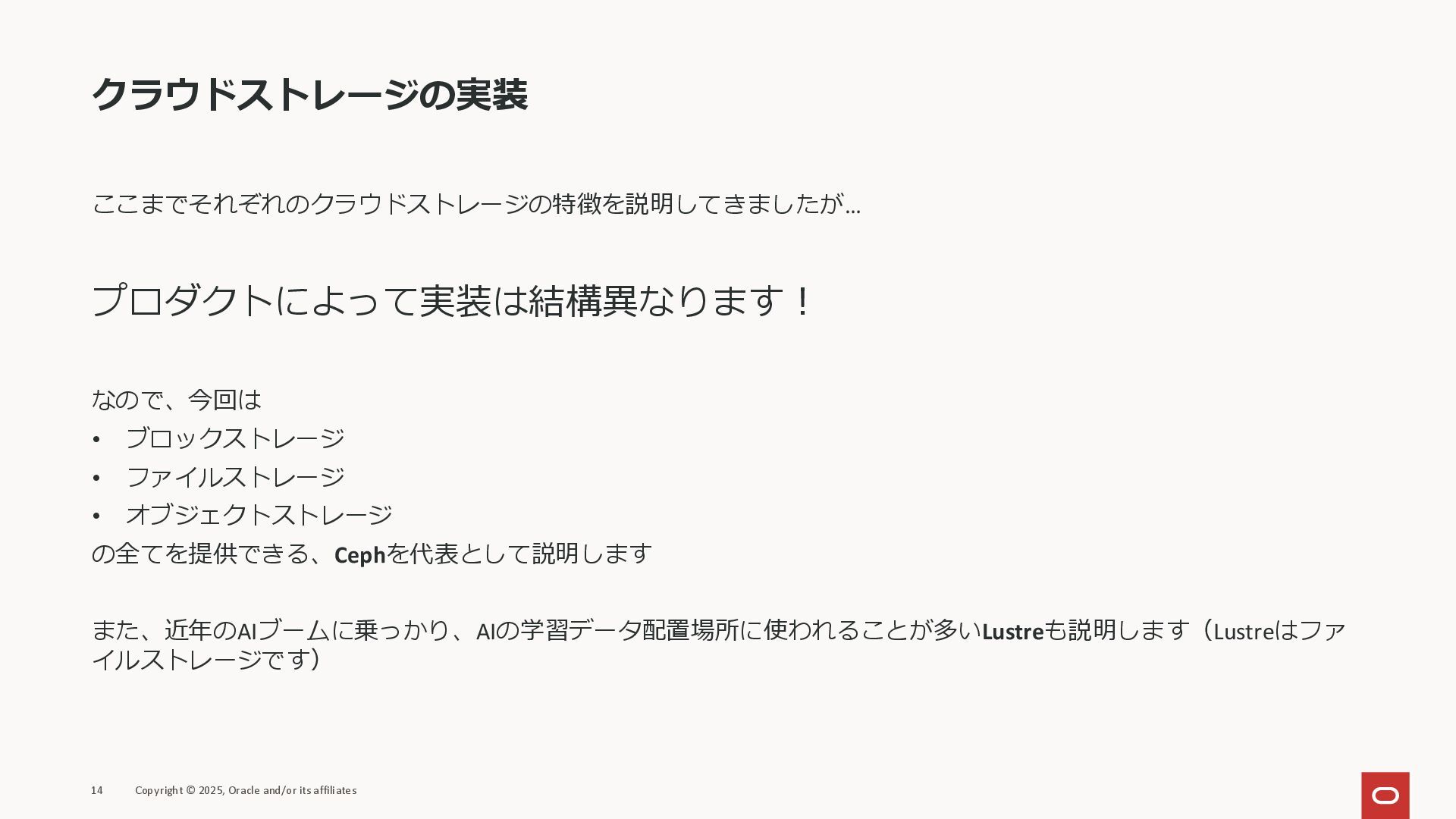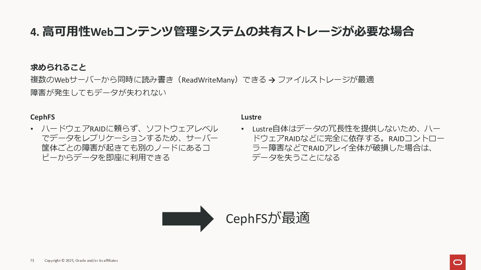 2025, Oracle and/or its affiliates CephFS • ハードウェアRAIDに頼らず、ソフトウェアレベル でデータをレプリケーションするため、サーバー 筐体ごとの障害が起きても別のノードにあるコ ピーからデータを即座に利用できる Lustre • Lustre自体はデータの冗長性を提供しないため、ハー ドウェアRAIDなどに完全に依存する。RAIDコントロー ラー障害などでRAIDアレイ全体が破損した場合は、 データを失うことになる CephFSが最適