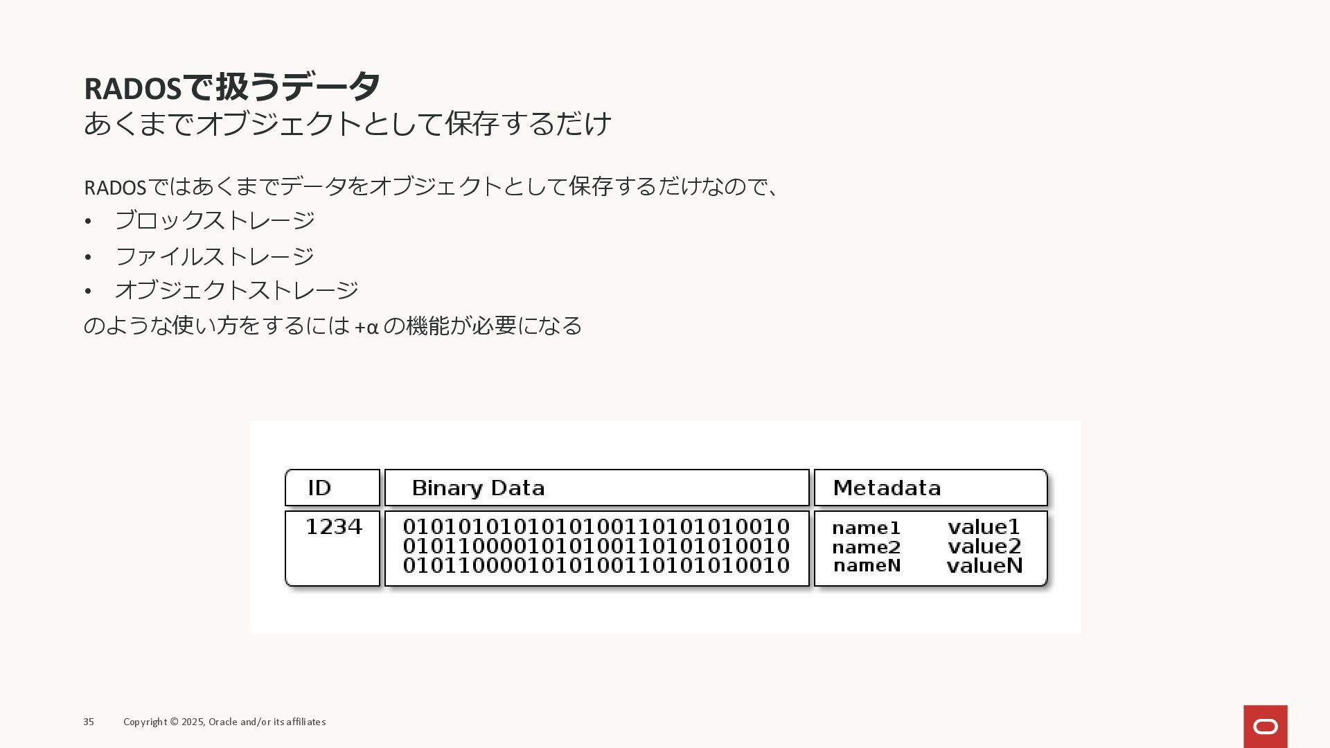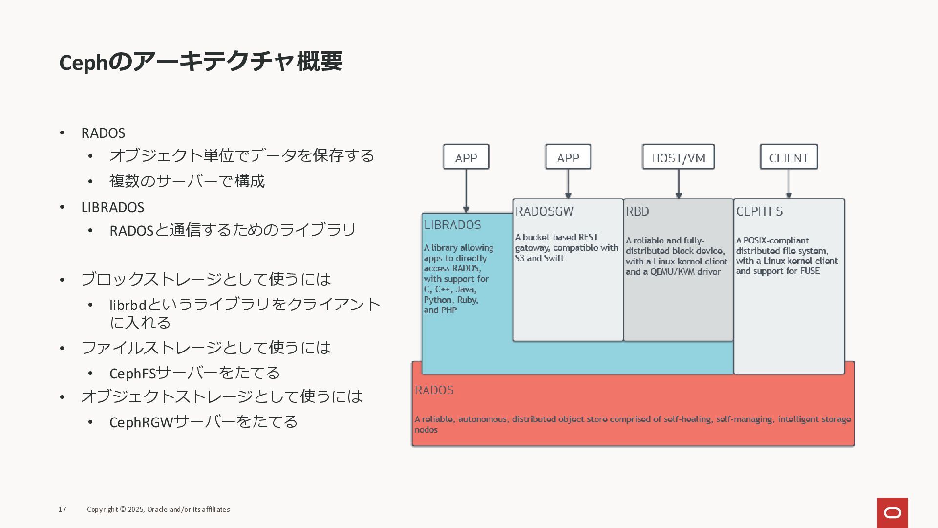 Oracle and/or its affiliates クライアント Ceph RGW (RADOS Gateway) RADOS HTTPでリクエスト (PUT /bucket/hoge.txt) Webサーバーとして動作 し、RADOSのオブジェク ト操作に変換