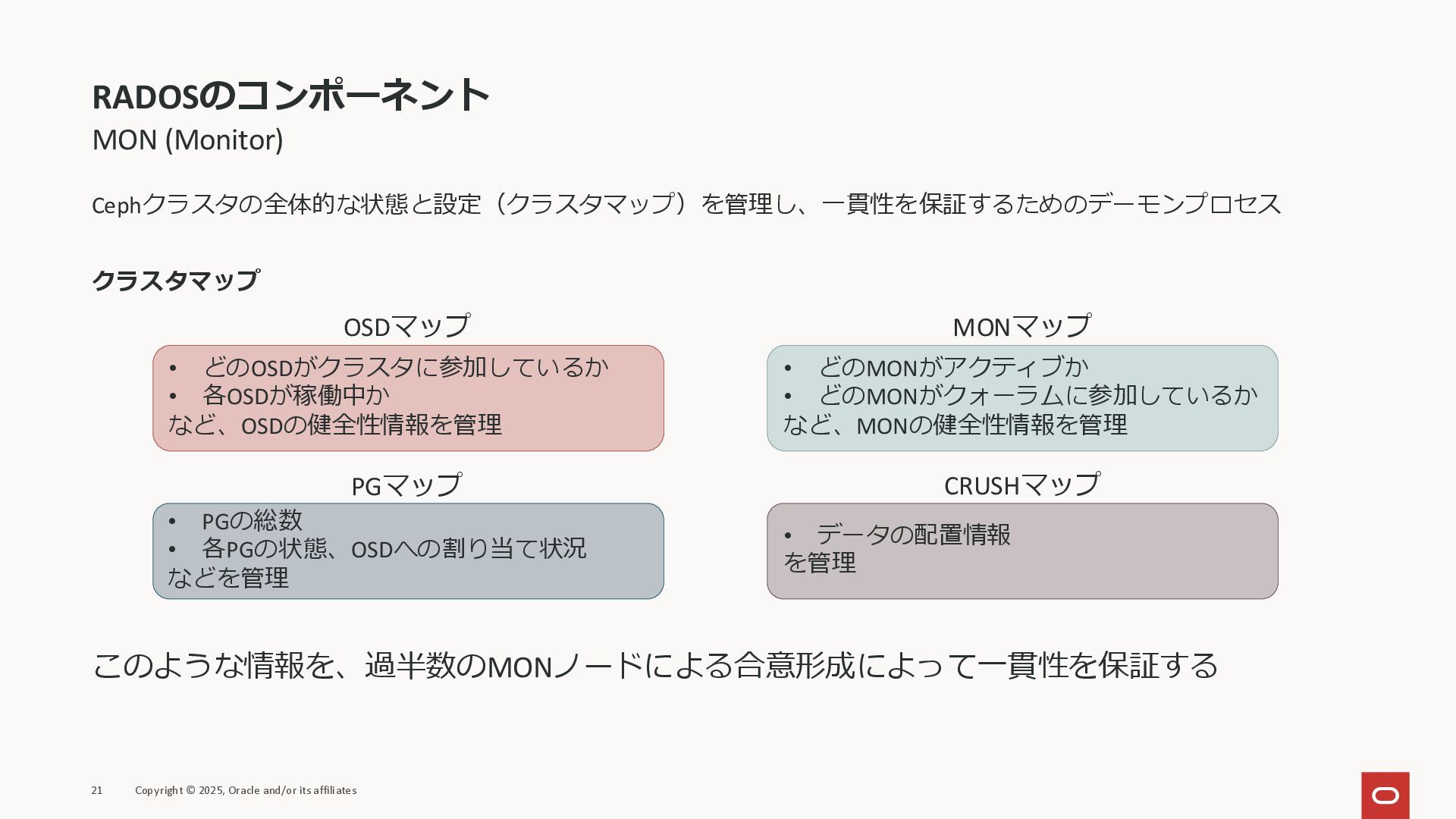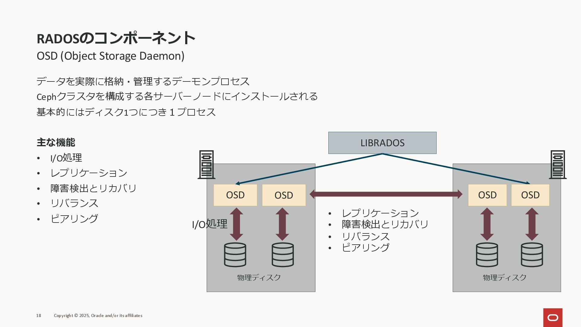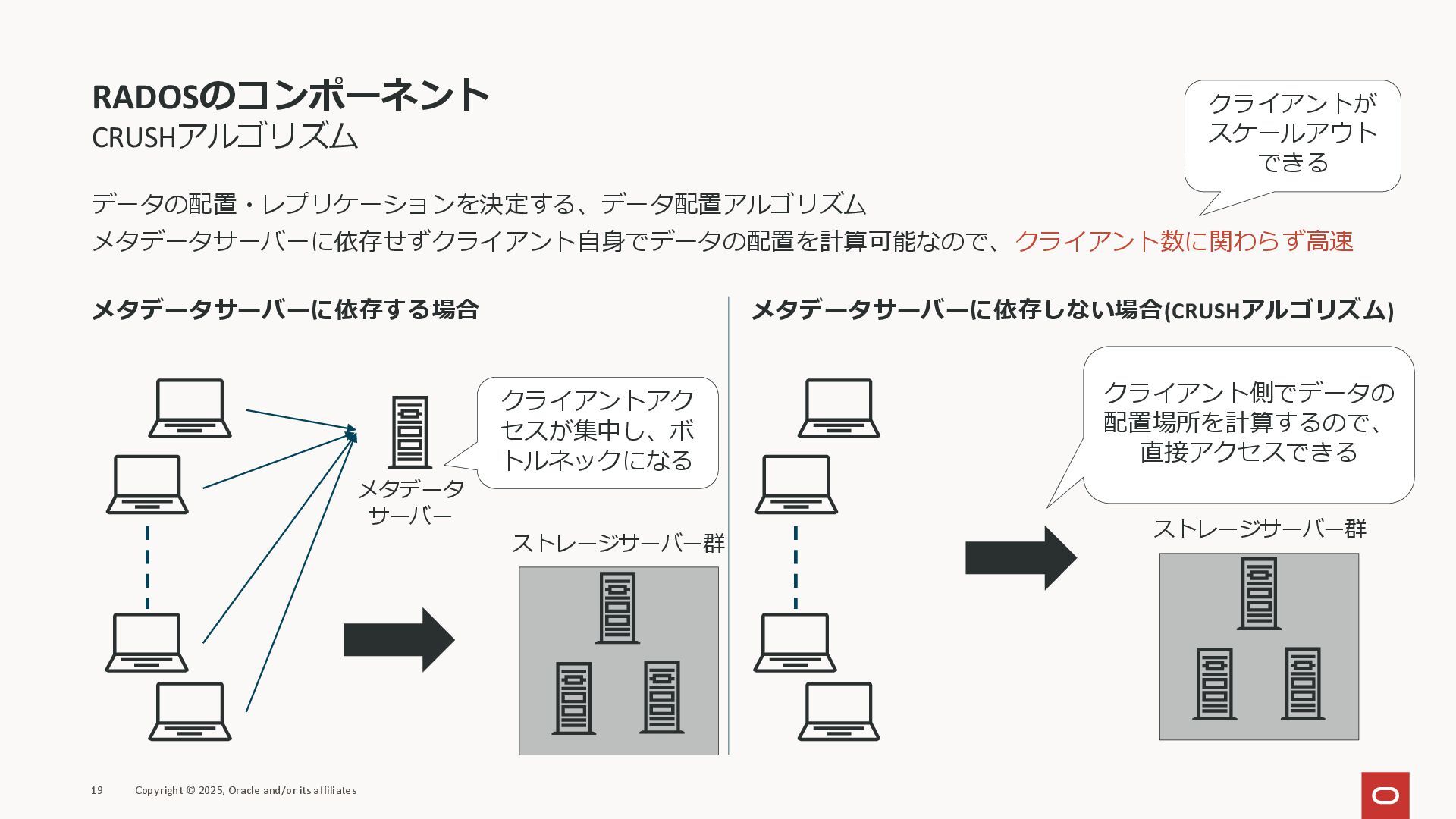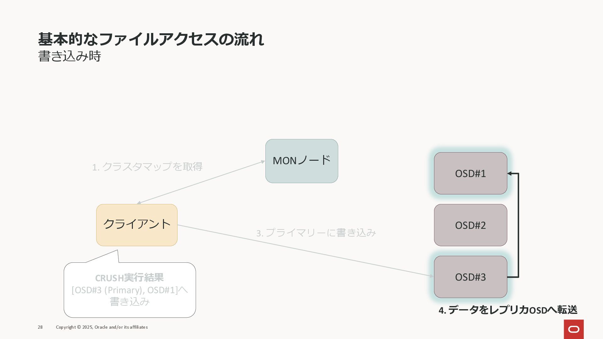 2025, Oracle and/or its affiliates クライアント プライマリ OSD レプリカ OSD レプリカ OSD 同期レプリケーション すべてのレプリカへ書き込みが完了してから、クライ アントに書き込み完了を通知する データのリバランス 自己修復機能によって、OSDの故障や追加時にリバラ ンスが行われる プライマリ OSD レプリカ OSD レプリカ OSD 故障 規定のReplication数を満たすため、大 量のデータ転送が行われる 不意なディスクI/O, ネットワークI/Oの消費