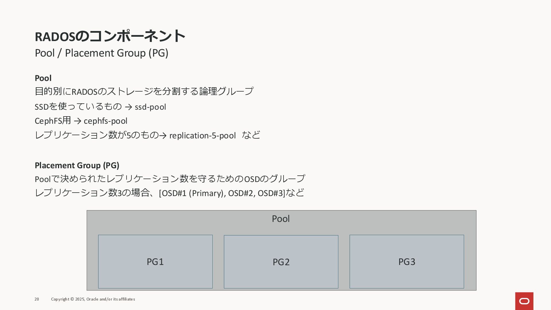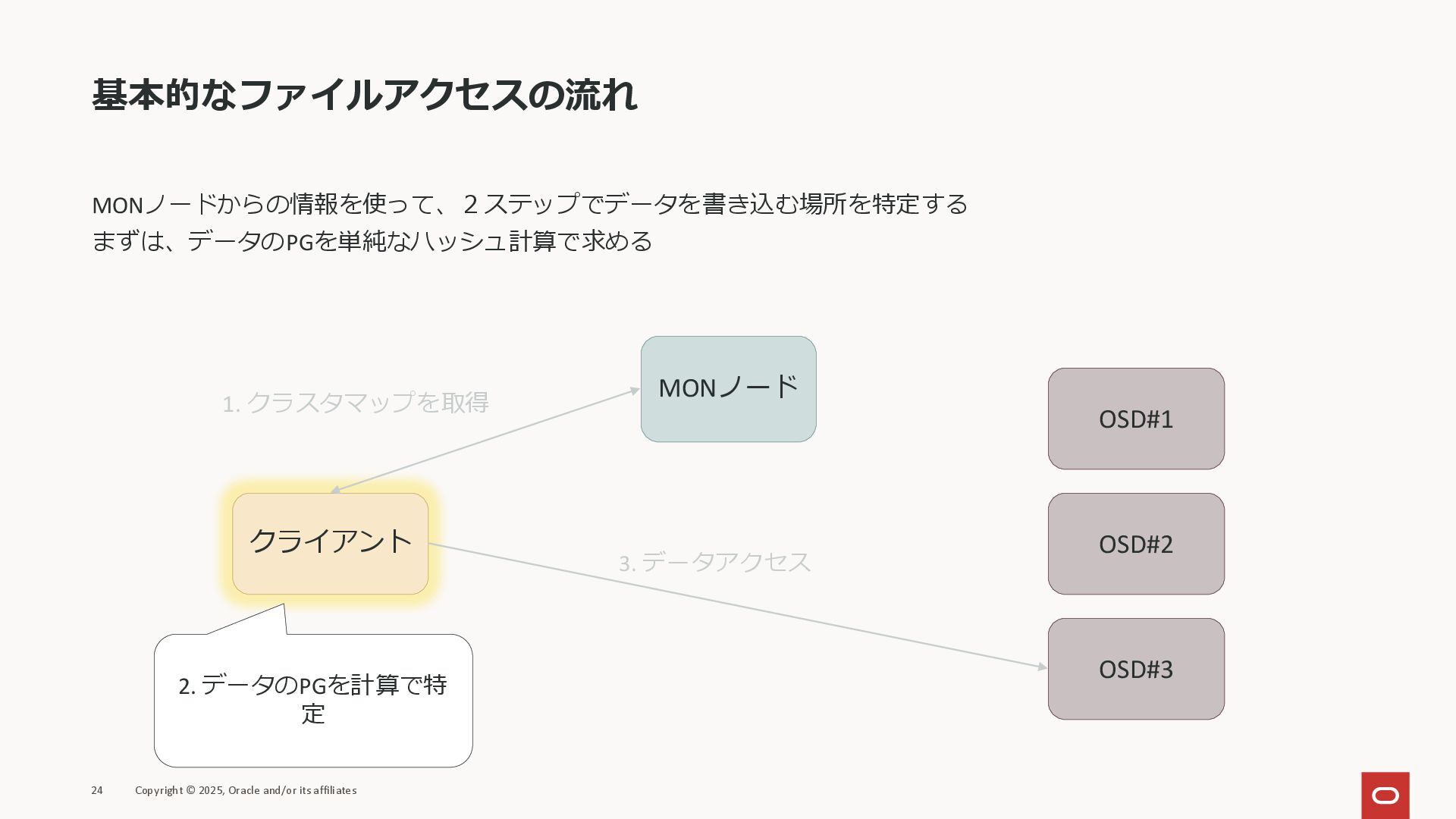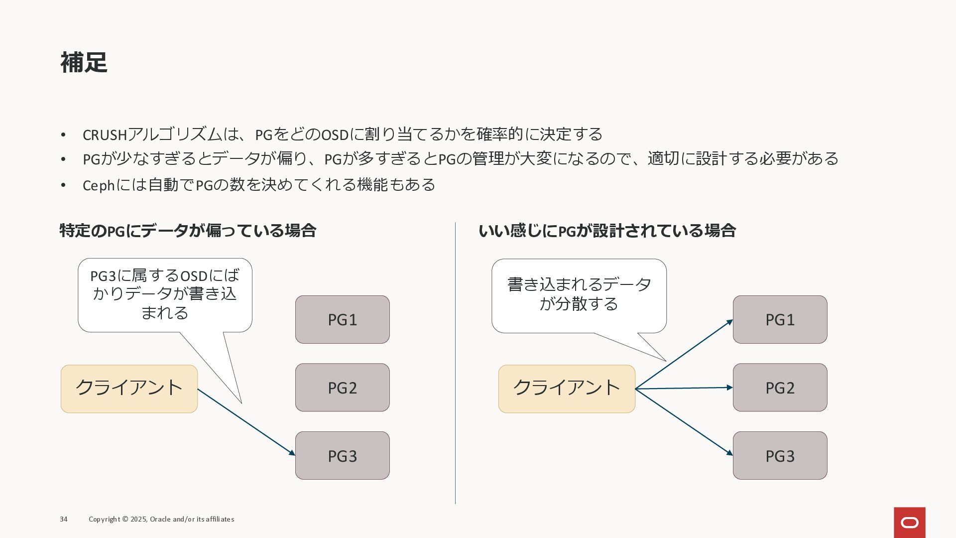 2025, Oracle and/or its affiliates PG3 PG2 PG1 クライアント 特定のPGにデータが偏っている場合 PG3に属するOSDにば かりデータが書き込 まれる いい感じにPGが設計されている場合 PG3 PG2 PG1 クライアント 書き込まれるデータ が分散する