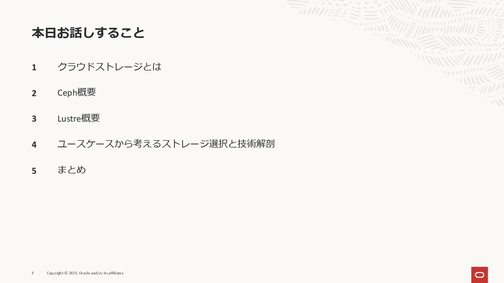 2 3 4 5 クラウドストレージとは Ceph概要 Lustre概要 ユースケースから考えるストレージ選択と技術解剖 まとめ