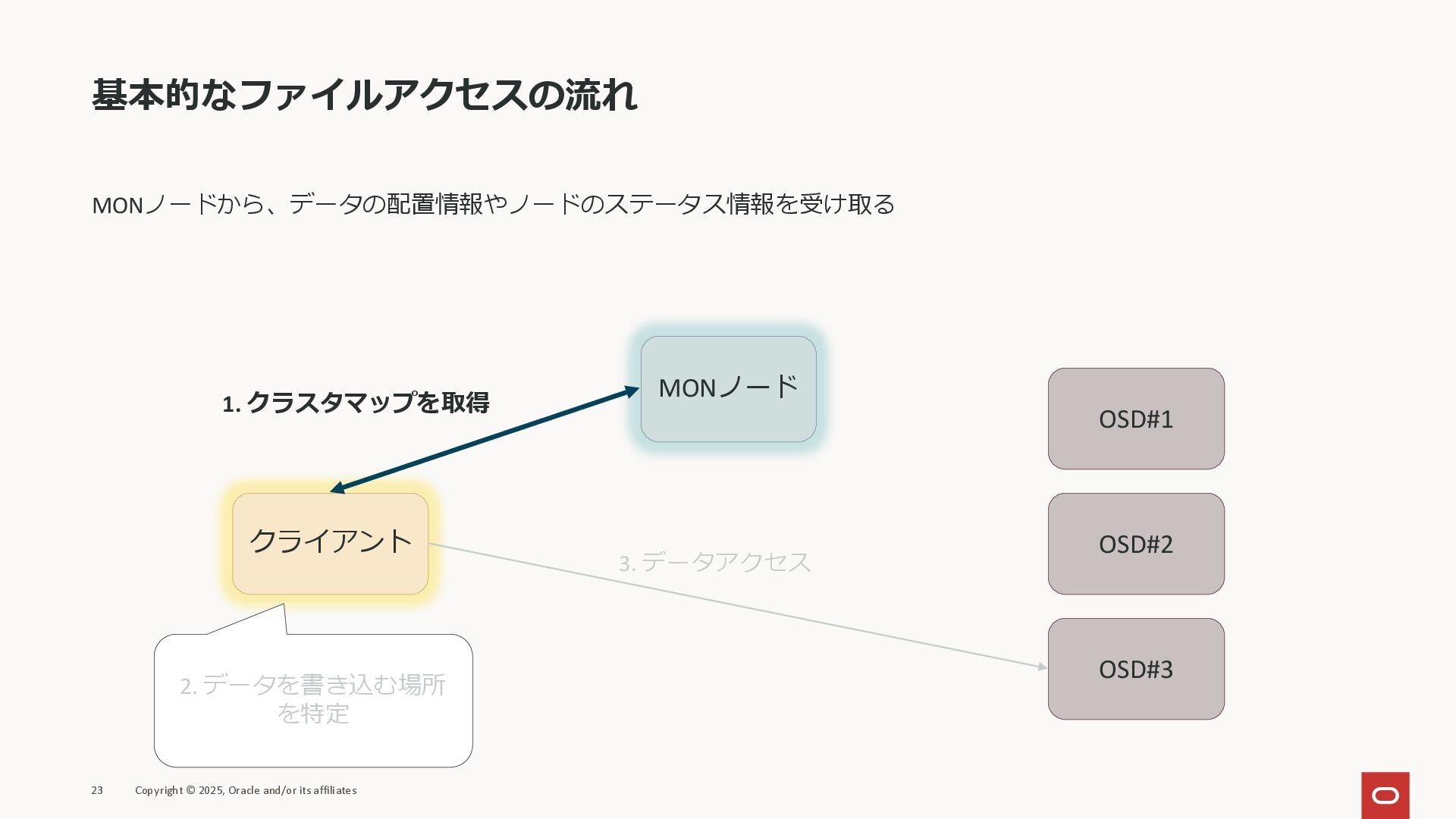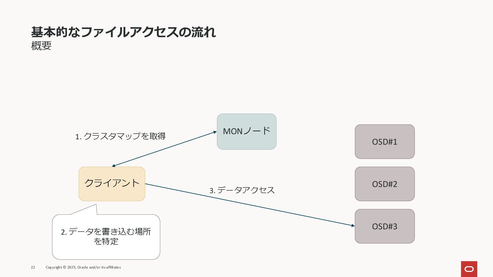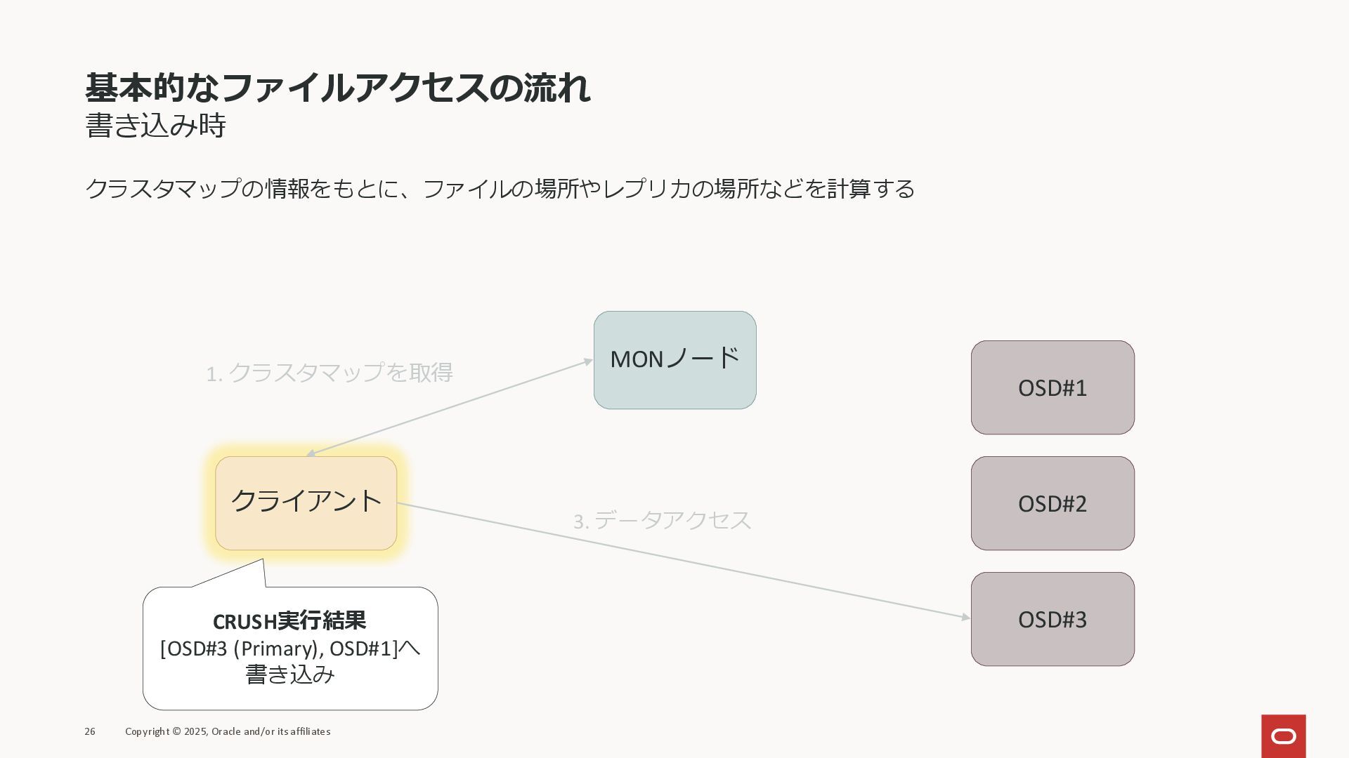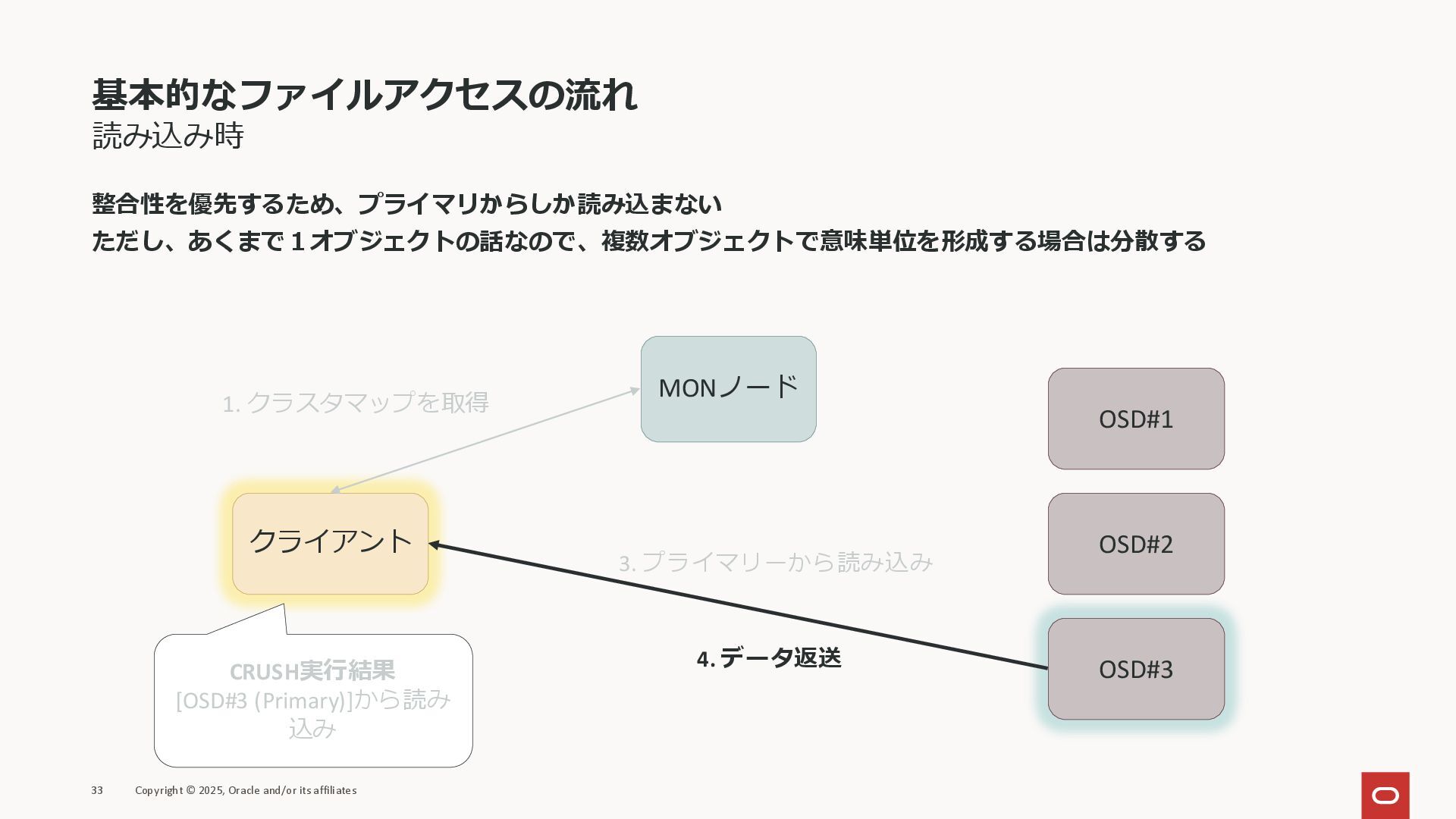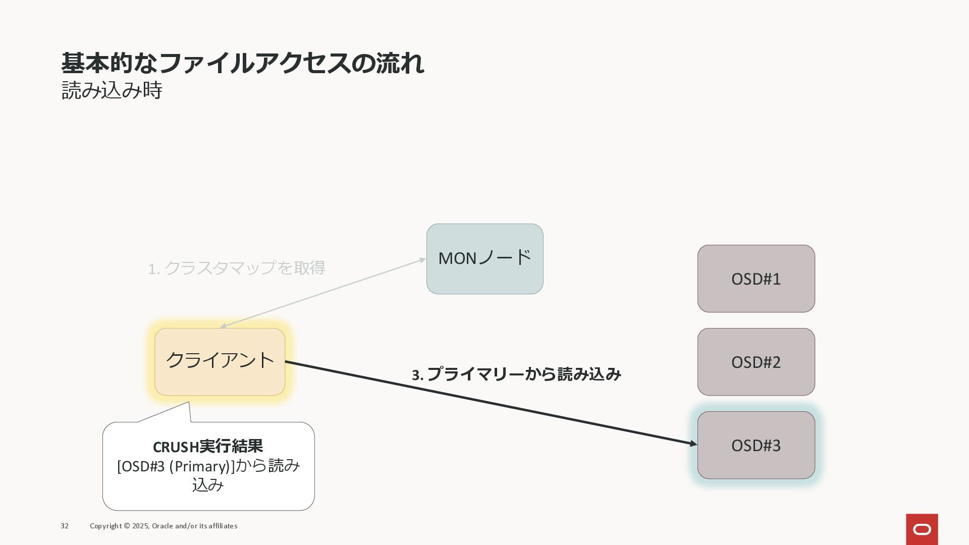 基本的なファイルアクセスの流れ 読み込み時 クラスタマップの情報をもとに、ファイルの場所やレプリカの場所などを計算する 31 Copyright © 2025, Oracle and/or its