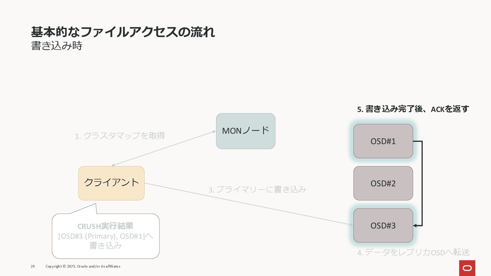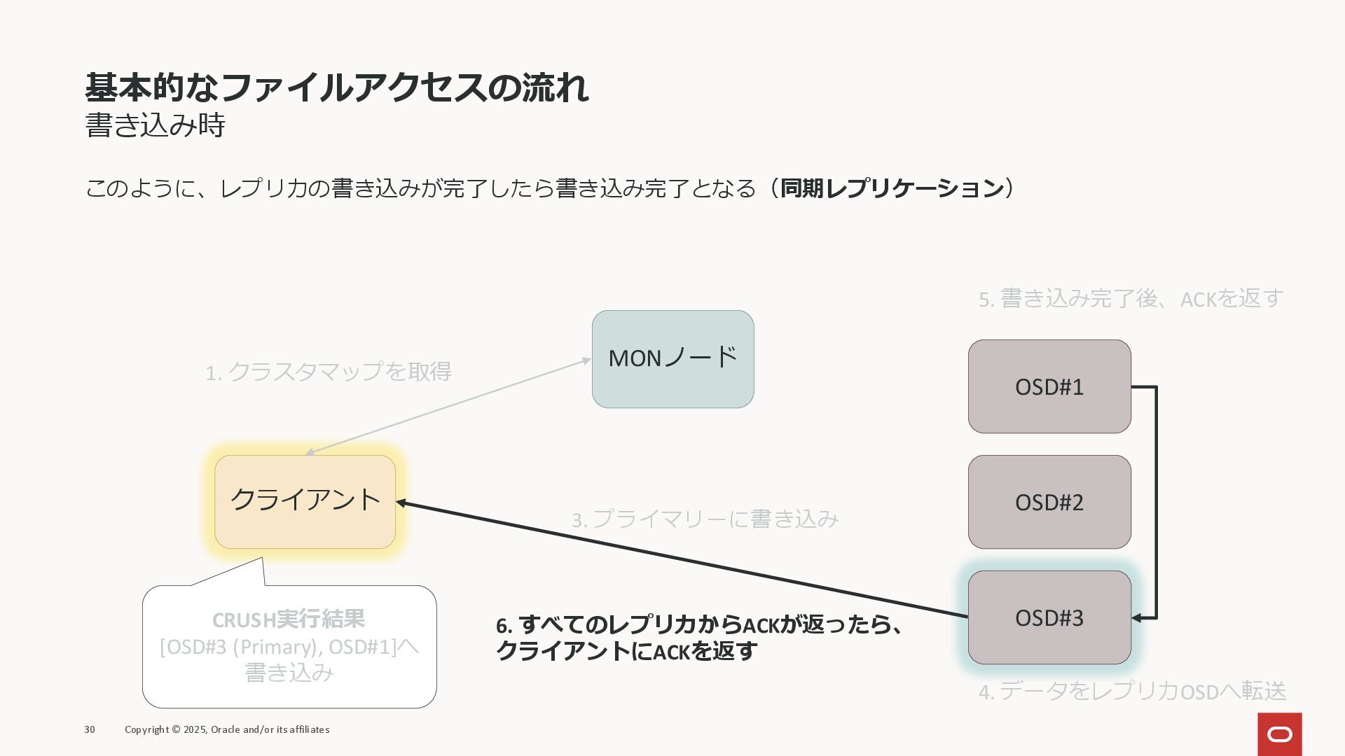 基本的なファイルアクセスの流れ 書き込み時 このように、レプリカの書き込みが完了したら書き込み完了となる(同期レプリケーション) 30 Copyright © 2025, Oracle and/or its