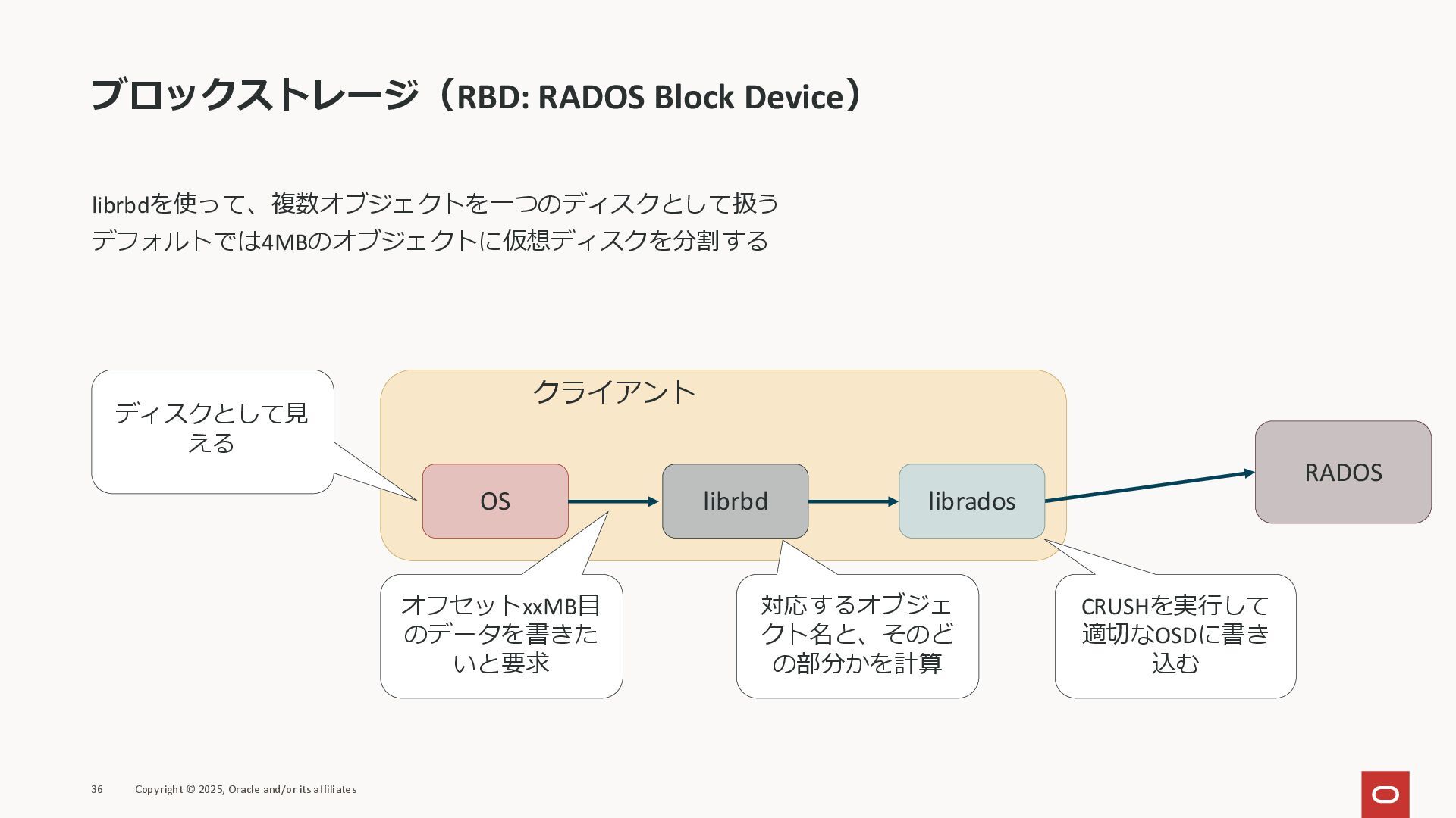 ブロックストレージ(RBD: RADOS Block Device) librbdを使って、複数オブジェクトを一つのディスクとして扱う デフォルトでは4MBのオブジェクトに仮想ディスクを分割する 36 Copyright © 2025,
