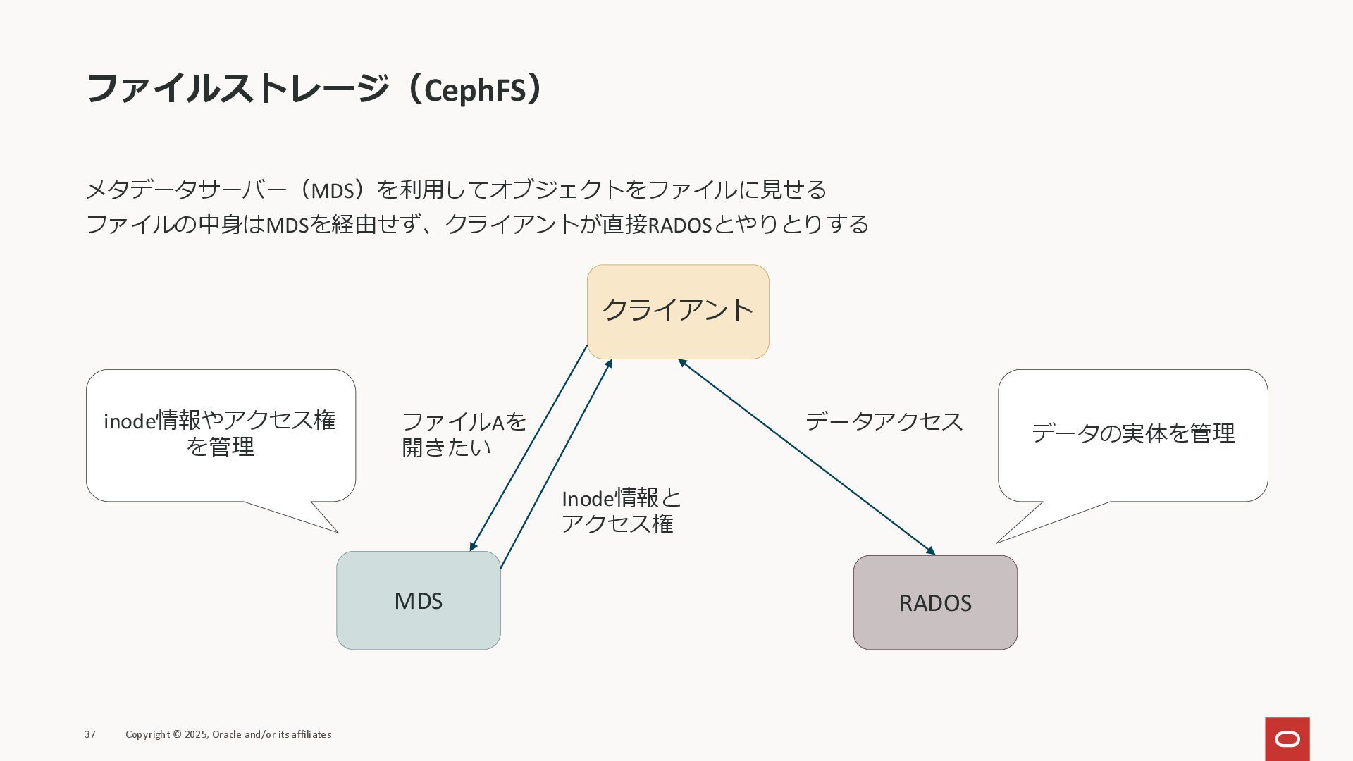 ファイルストレージ(CephFS) メタデータサーバー(MDS)を利用してオブジェクトをファイルに見せる ファイルの中身はMDSを経由せず、クライアントが直接RADOSとやりとりする 37 Copyright © 2025, Oracle and/or its