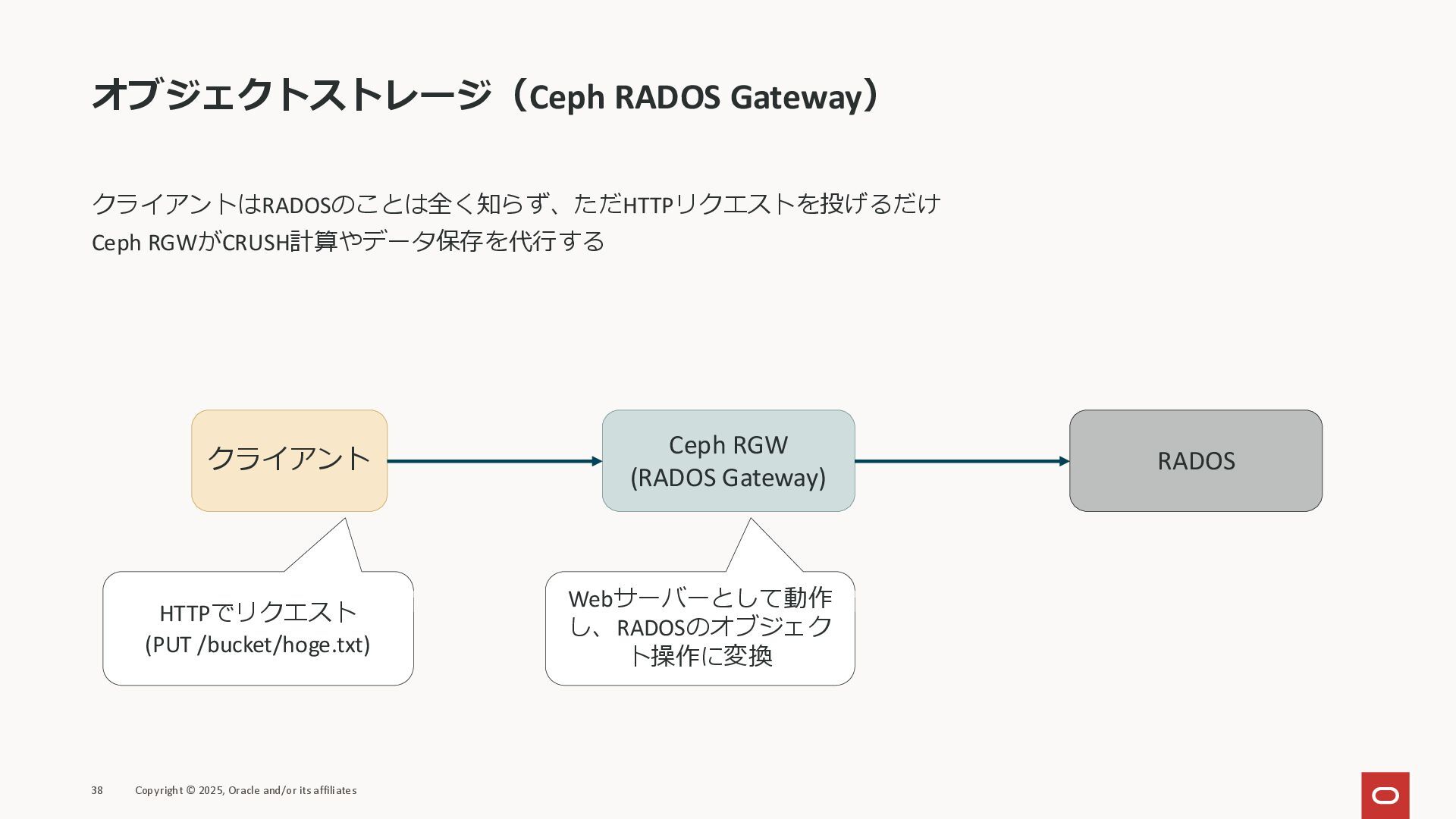 オブジェクトストレージ(Ceph RADOS Gateway) クライアントはRADOSのことは全く知らず、ただHTTPリクエストを投げるだけ Ceph RGWがCRUSH計算やデータ保存を代行する 38 Copyright © 2025,
