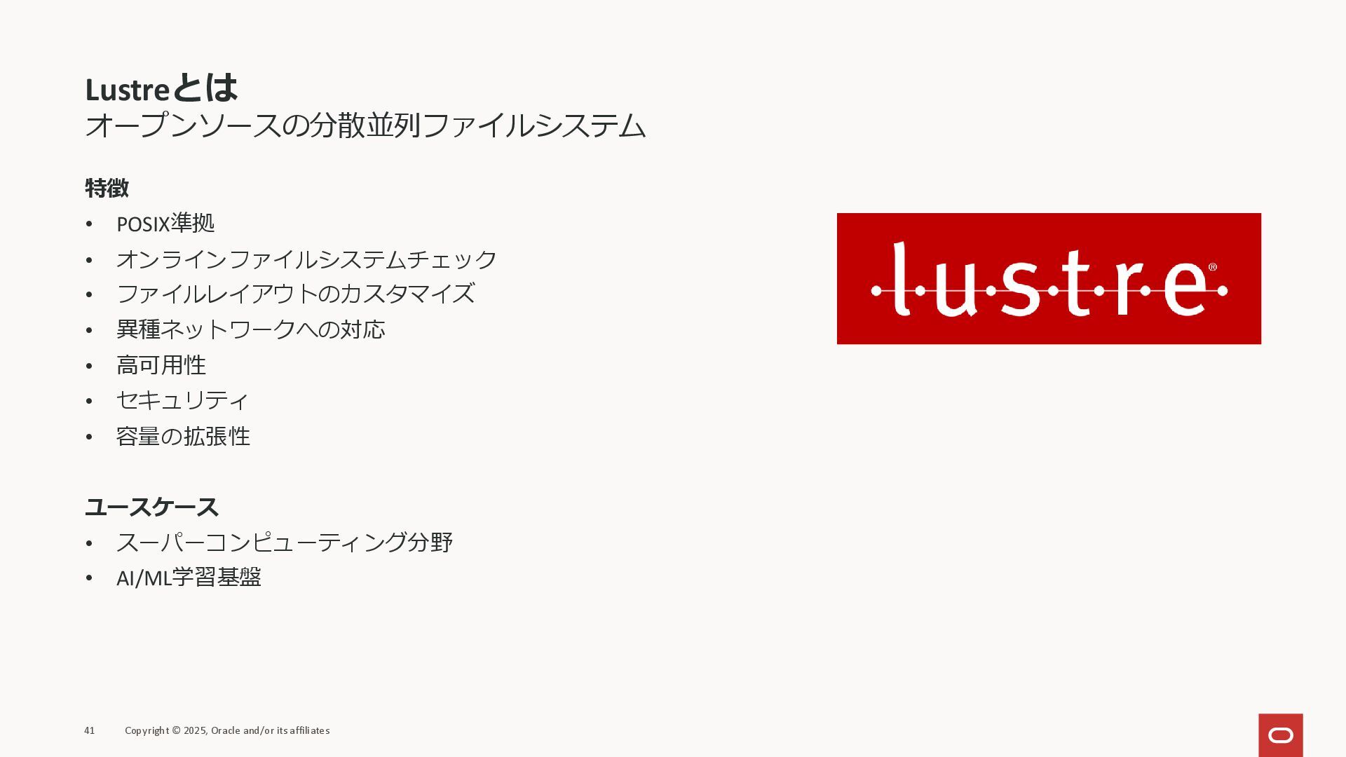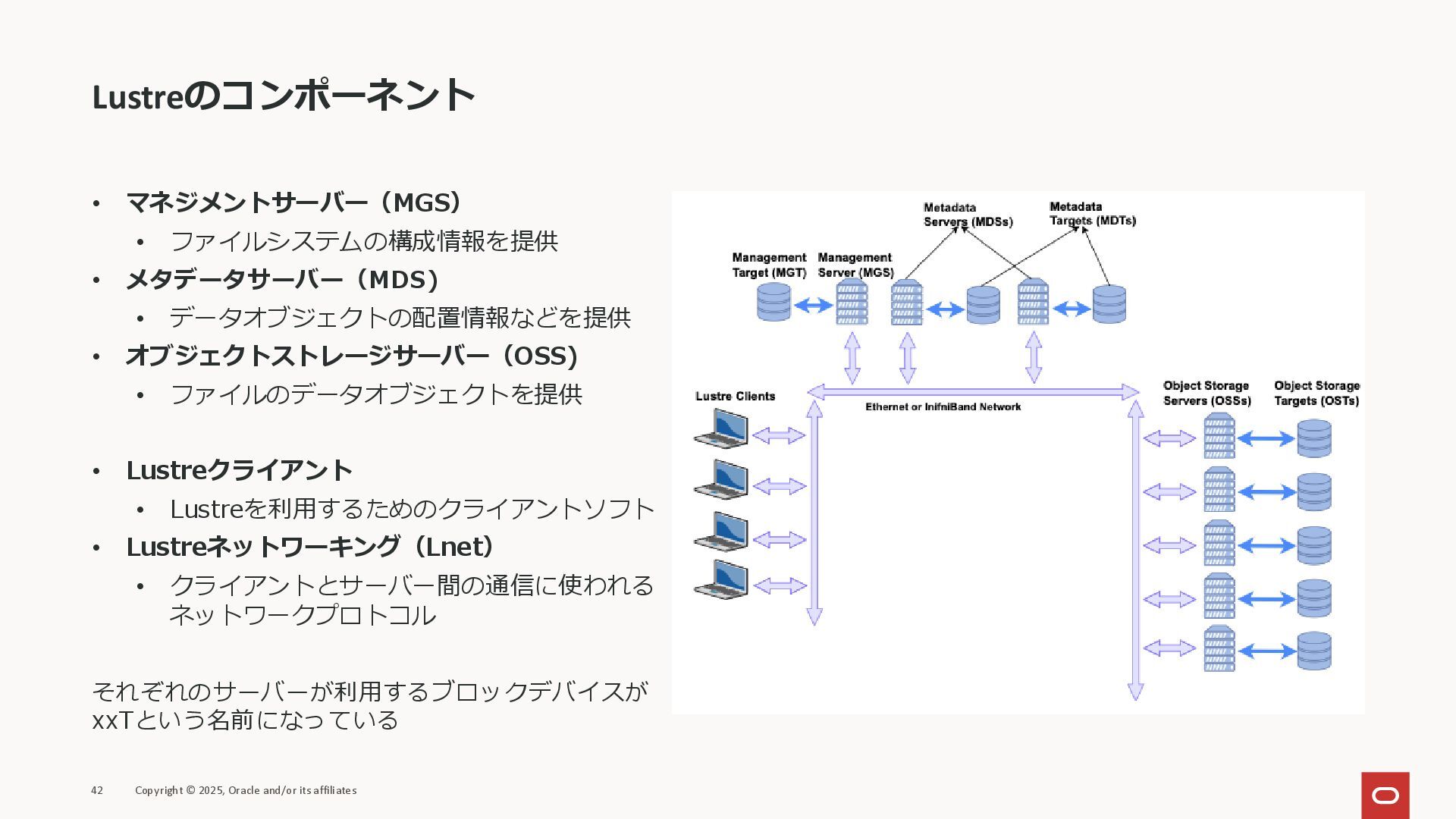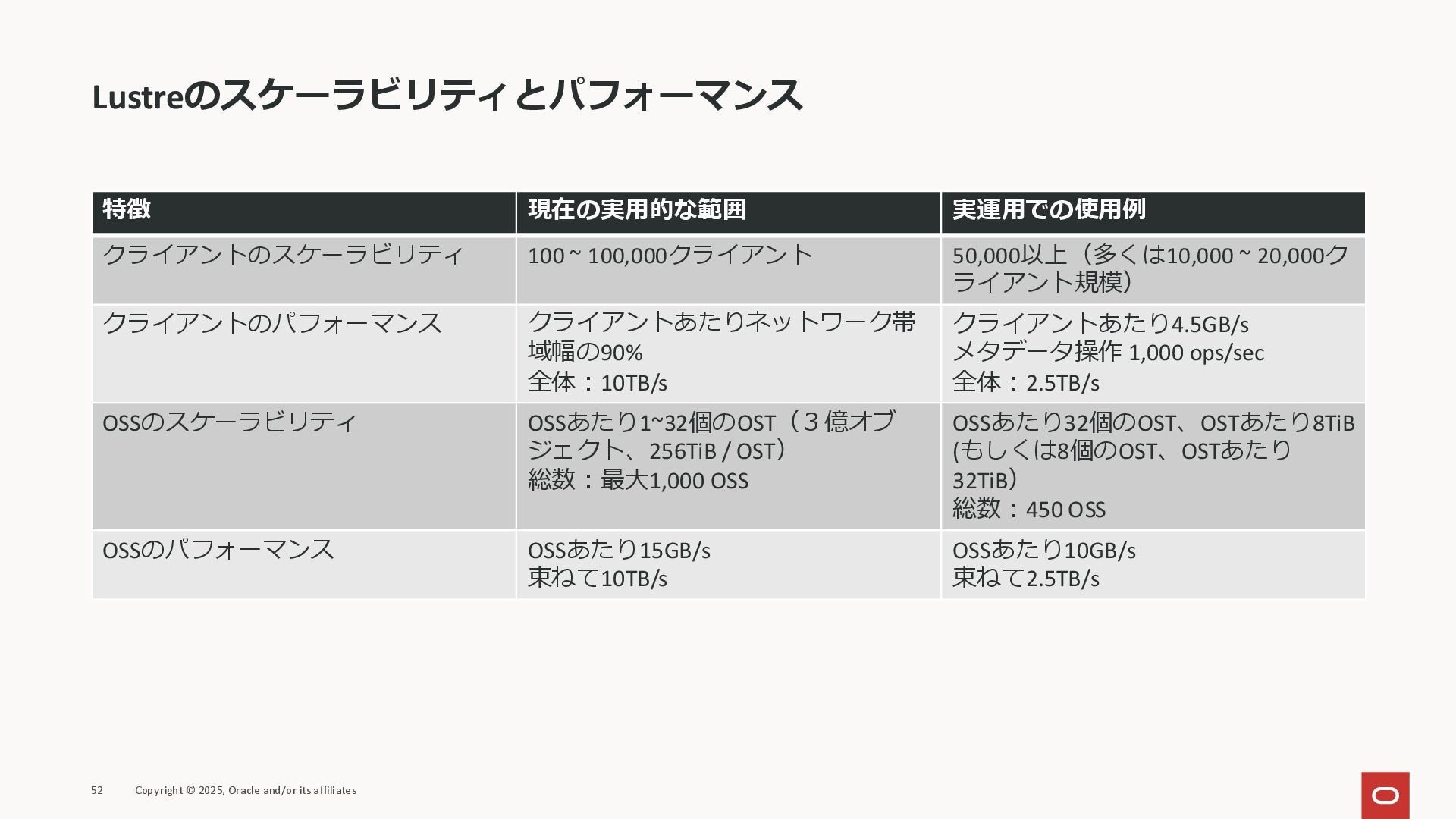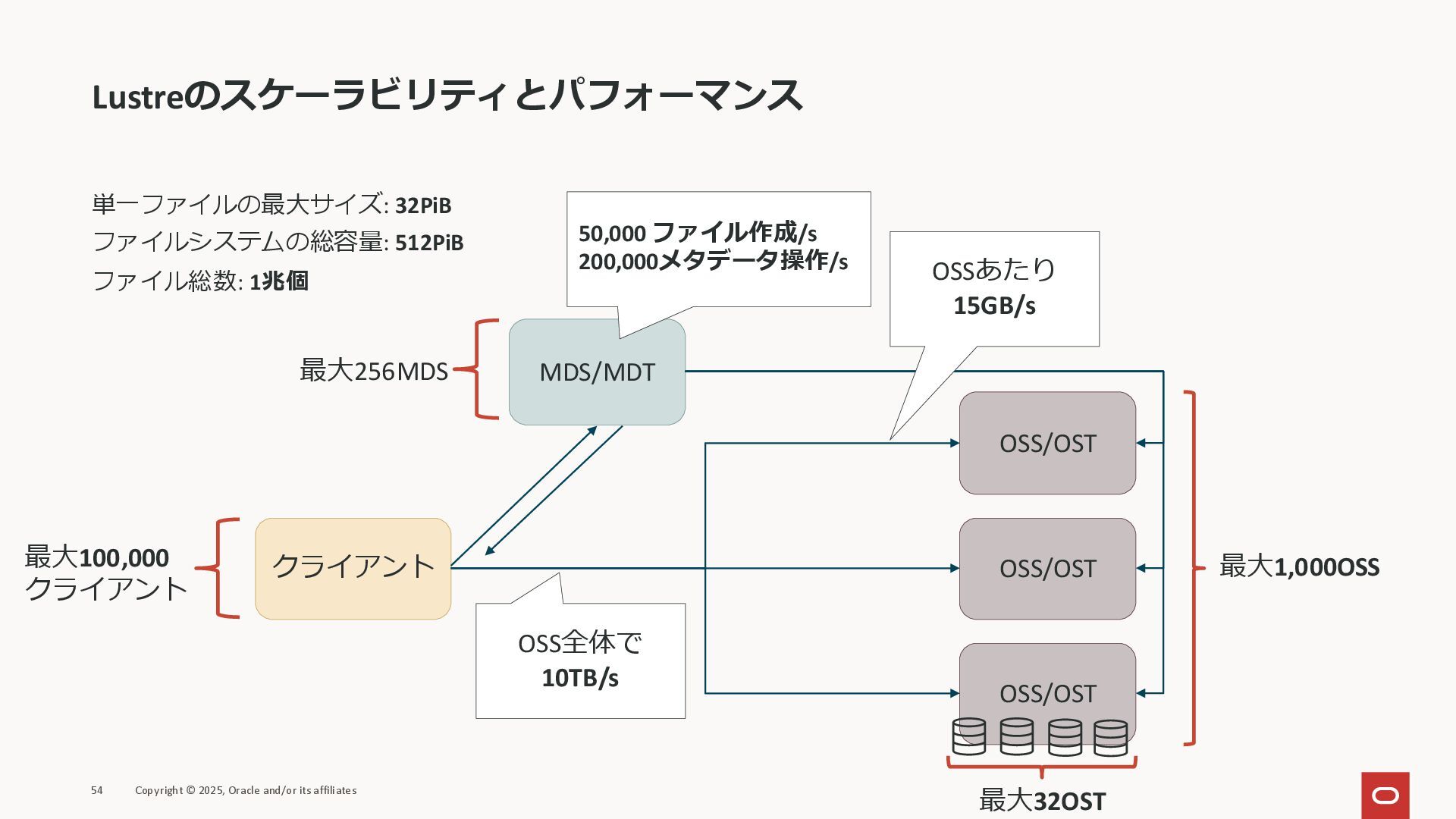 2025, Oracle and/or its affiliates クライアント MDS/MDT OSS/OST OSS/OST OSS/OST 最大1,000OSS 最大32OST 最大100,000 クライアント 最大256MDS OSS全体で 10TB/s OSSあたり 15GB/s 50,000 ファイル作成/s 200,000メタデータ操作/s
