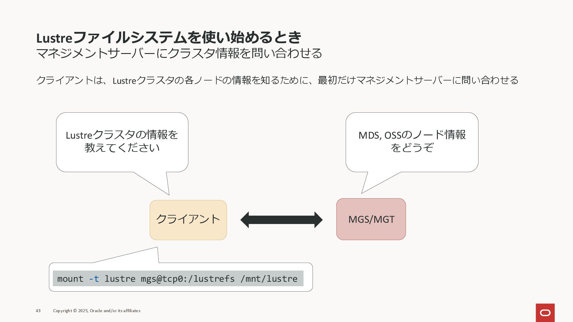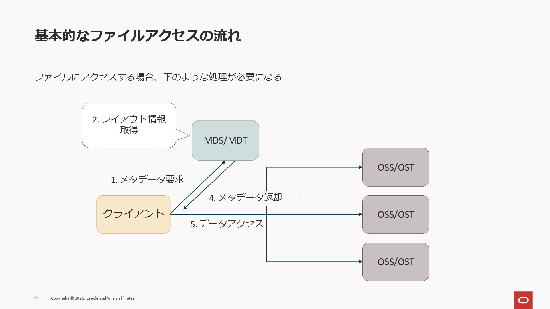 Lustreファイルシステムを使い始めるとき マネジメントサーバーにクラスタ情報を問い合わせる クライアントは、Lustreクラスタの各ノードの情報を知るために、最初だけマネジメントサーバーに問い合わせる 43 Copyright © 2025, Oracle and/or its