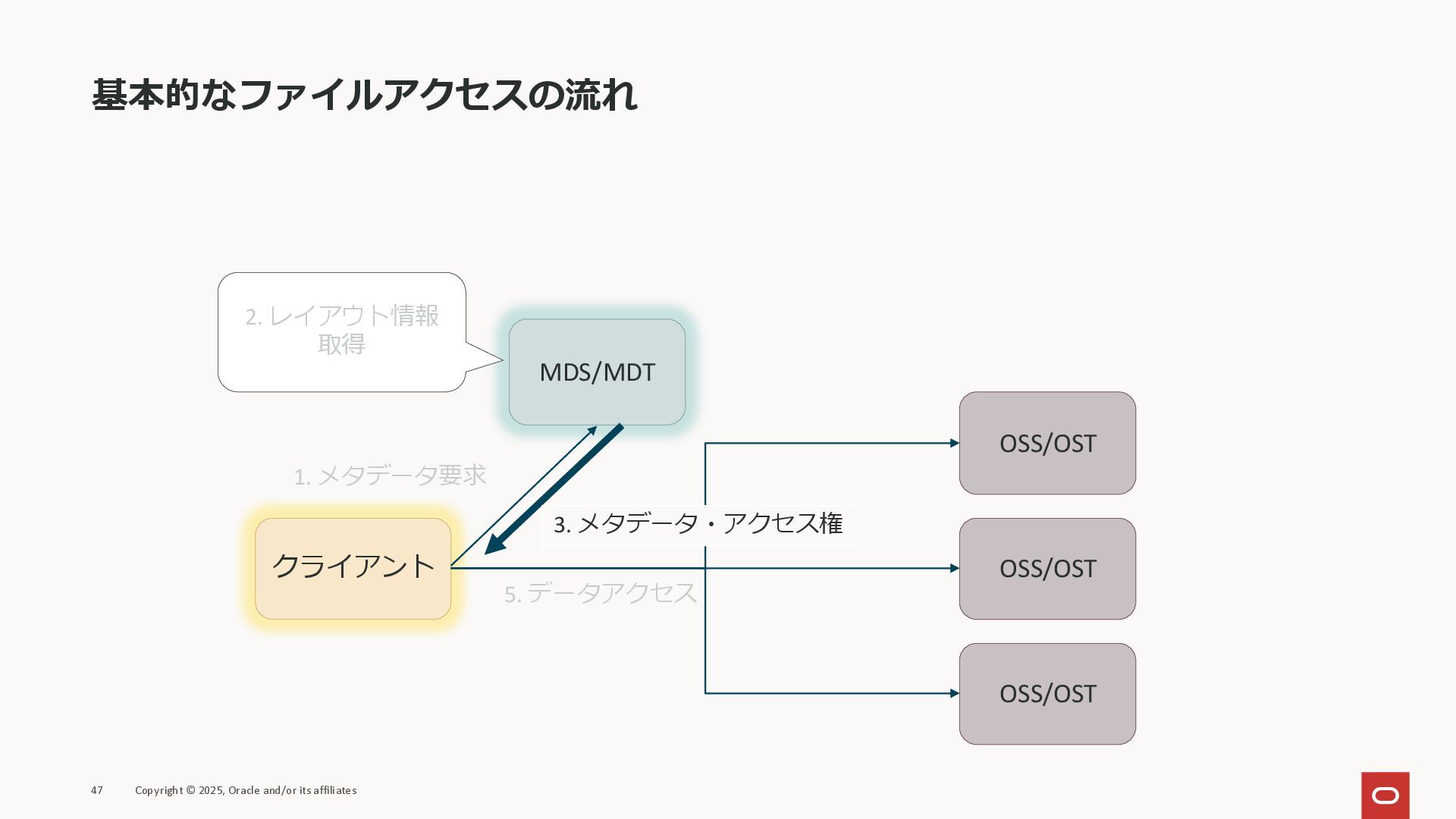 基本的なファイルアクセスの流れ 46 Copyright © 2025, Oracle and/or its affiliates クライアント