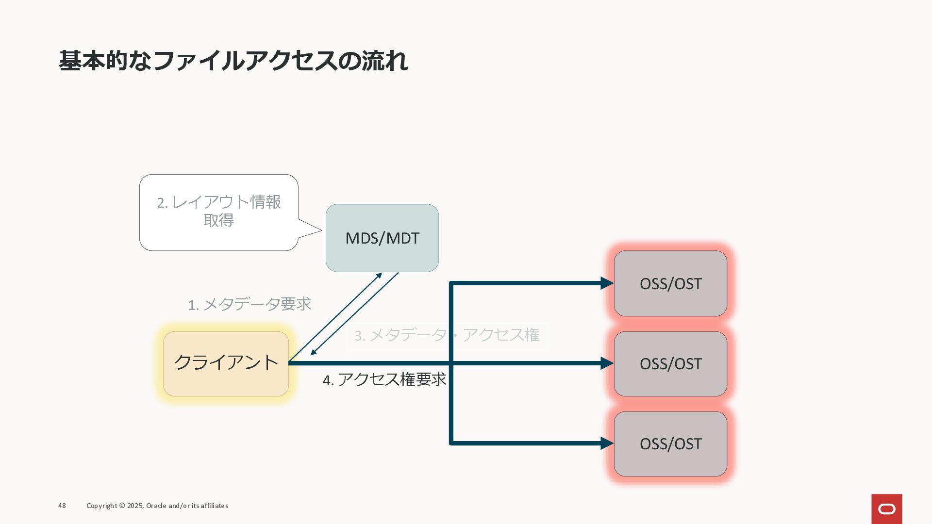 基本的なファイルアクセスの流れ 47 Copyright © 2025, Oracle and/or its affiliates クライアント