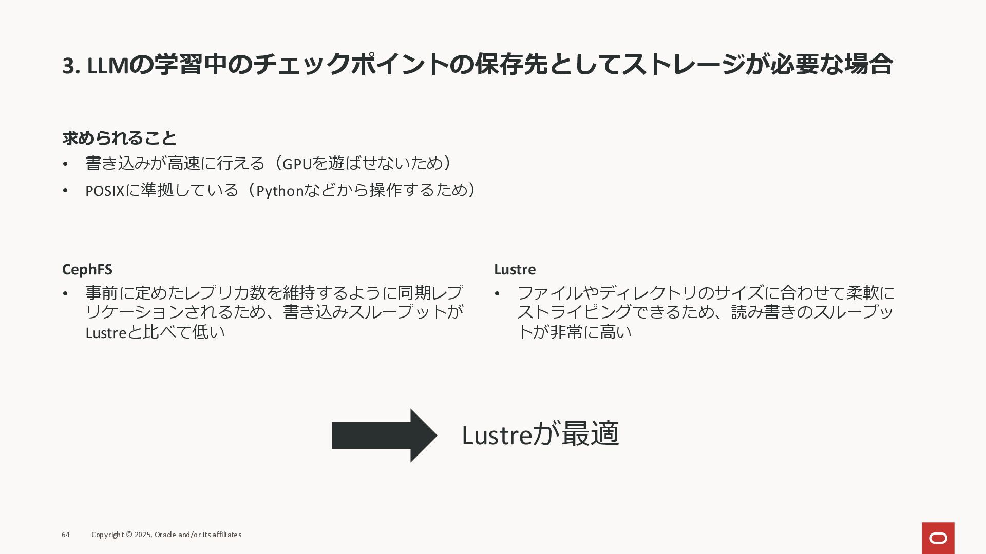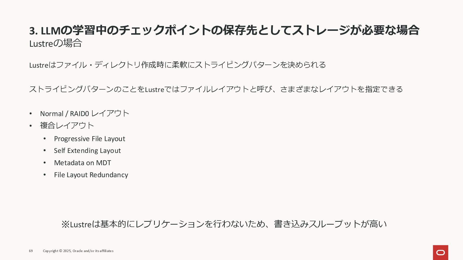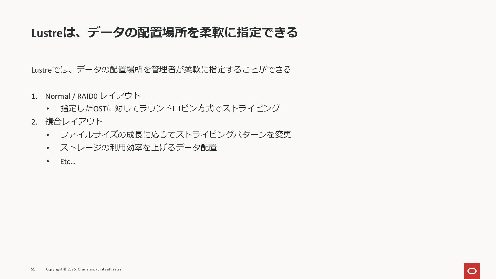 2025, Oracle and/or its affiliates CephFS • 事前に定めたレプリカ数を維持するように同期レプ リケーションされるため、書き込みスループットが Lustreと比べて低い Lustre • ファイルやディレクトリのサイズに合わせて柔軟に ストライピングできるため、読み書きのスループッ トが非常に高い Lustreが最適