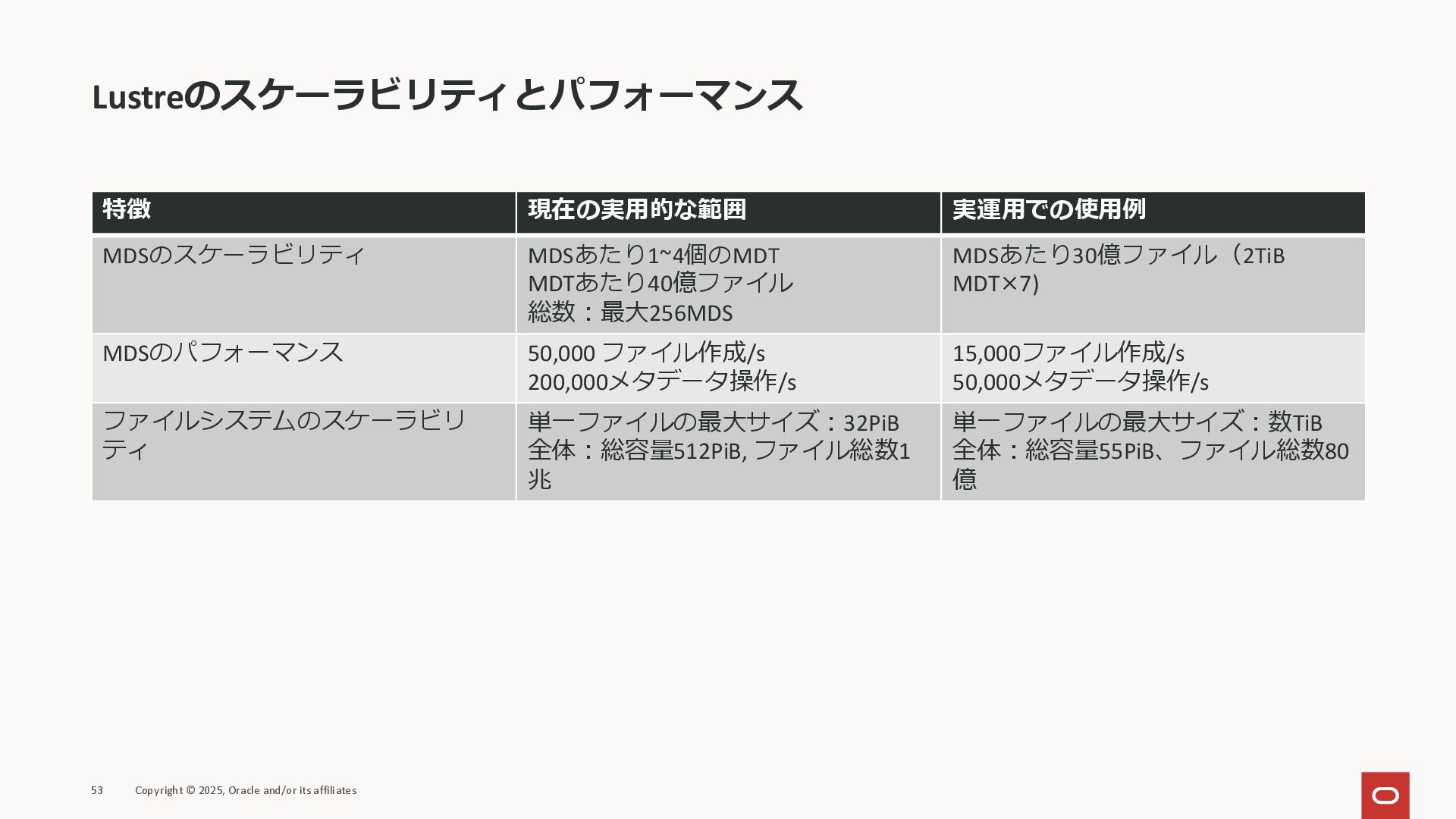 20,000ク ライアント規模) クライアントのパフォーマンス クライアントあたりネットワーク帯 域幅の90% 全体:10TB/s クライアントあたり4.5GB/s メタデータ操作 1,000 ops/sec 全体:2.5TB/s OSSのスケーラビリティ OSSあたり1~32個のOST(3億オブ ジェクト、256TiB / OST) 総数:最大1,000 OSS OSSあたり32個のOST、OSTあたり8TiB (もしくは8個のOST、OSTあたり 32TiB) 総数:450 OSS OSSのパフォーマンス OSSあたり15GB/s 束ねて10TB/s OSSあたり10GB/s 束ねて2.5TB/s 52 Copyright © 2025, Oracle and/or its affiliates