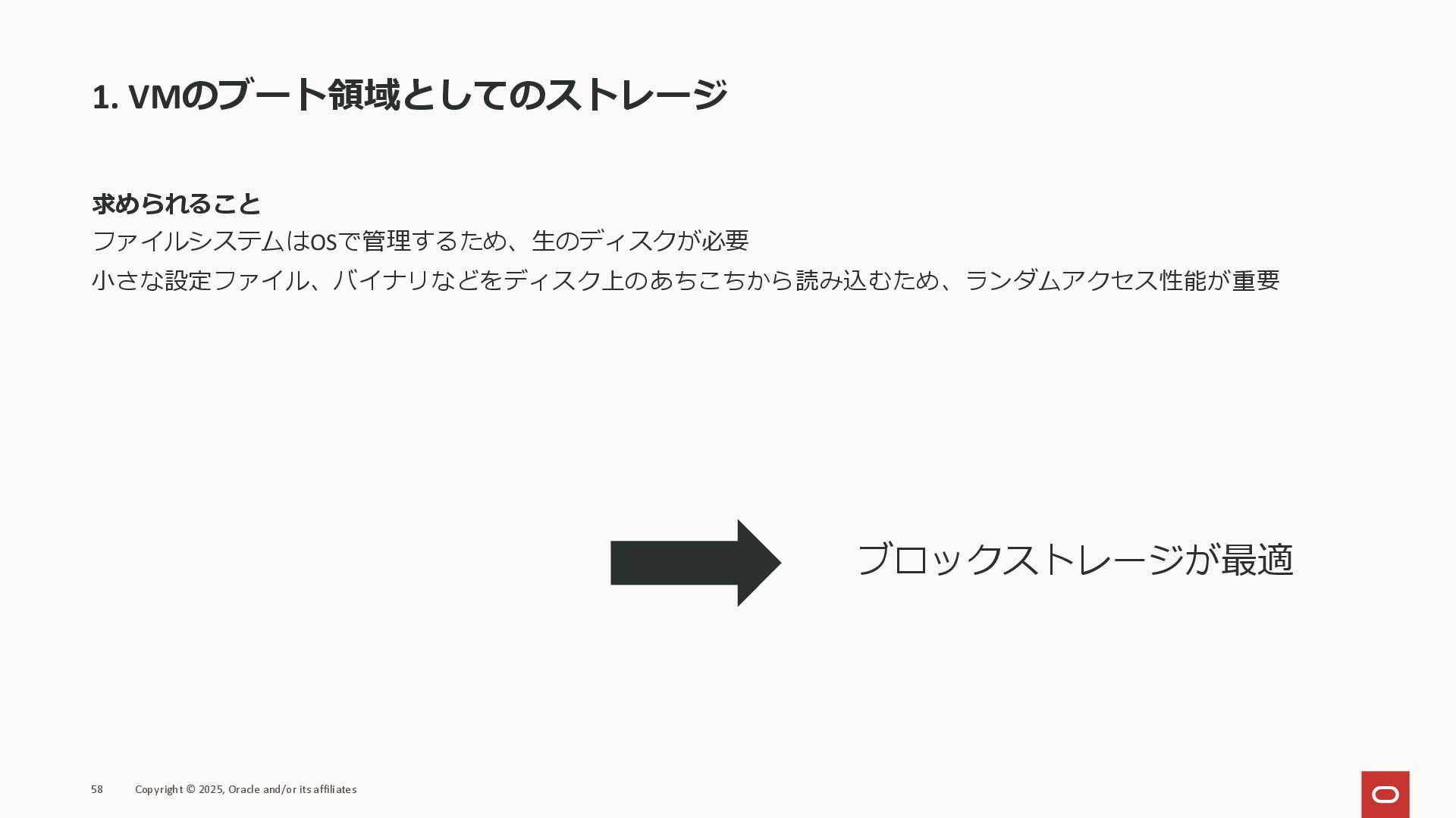 1. VMのブート領域としてのストレージ 求められること ファイルシステムはOSで管理するため、生のディスクが必要 小さな設定ファイル、バイナリなどをディスク上のあちこちから読み込むため、ランダムアクセス性能が重要 58 Copyright © 2025, Oracle