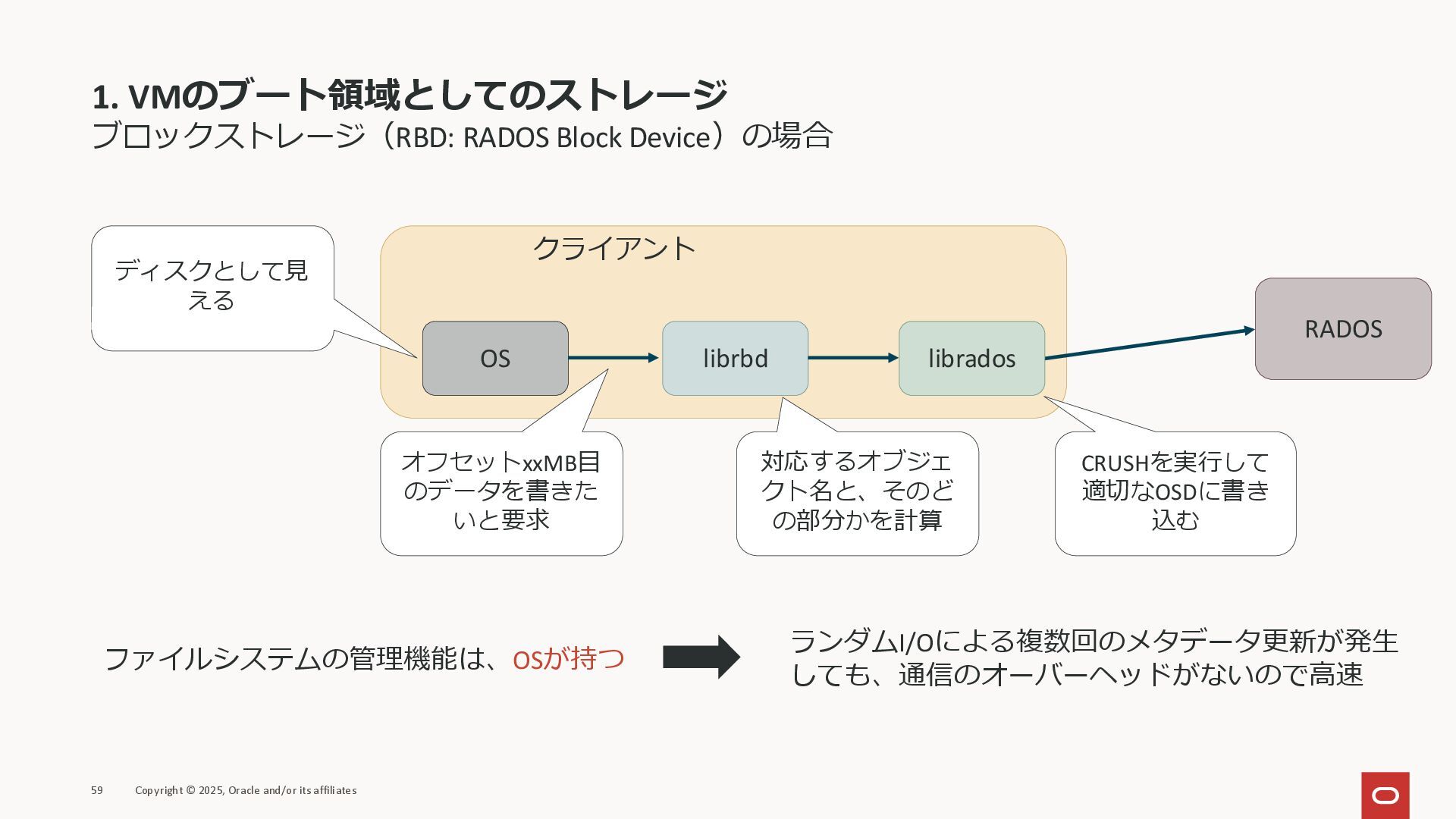 1. VMのブート領域としてのストレージ ブロックストレージ(RBD: RADOS Block Device)の場合 59 Copyright © 2025,