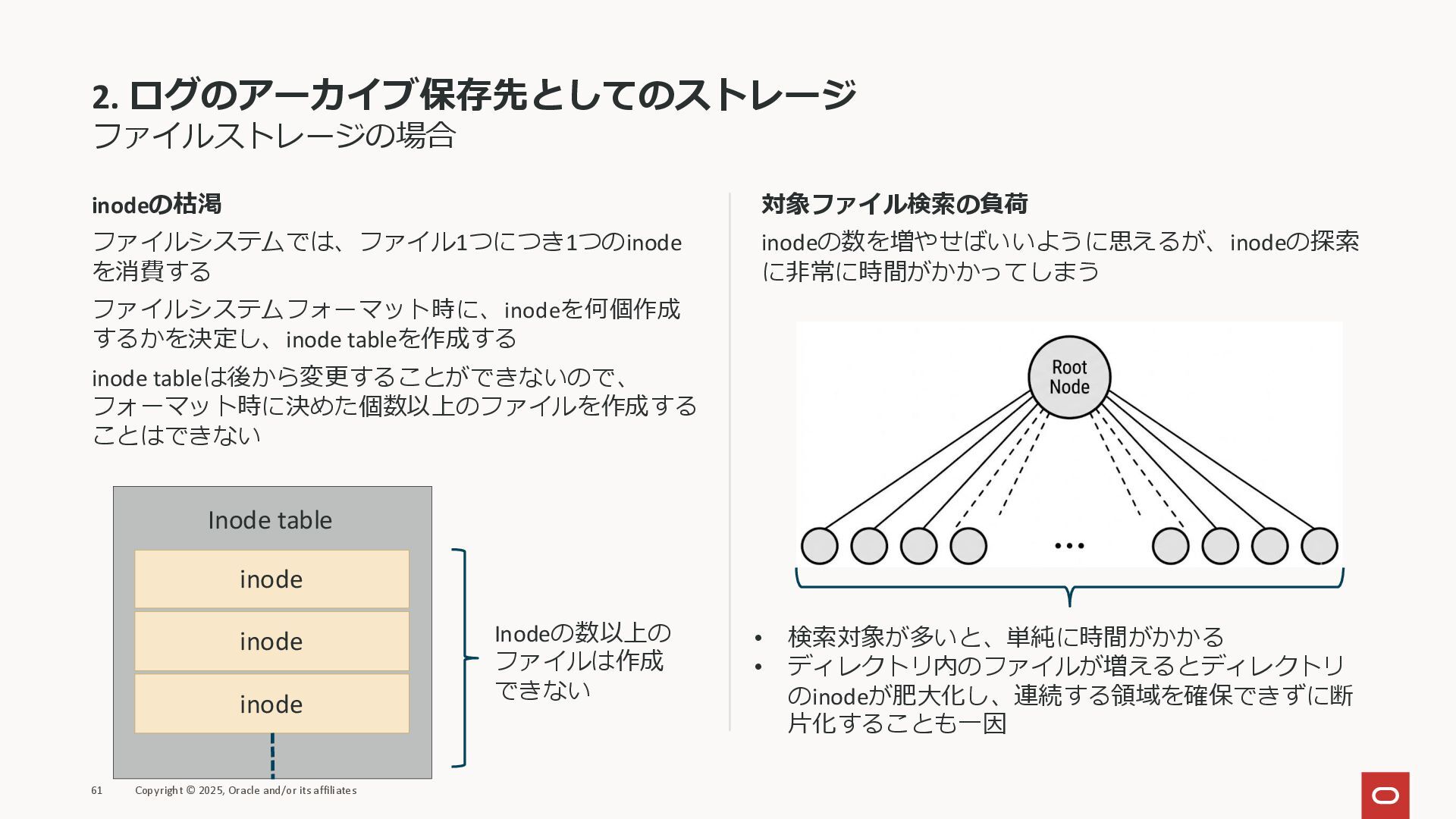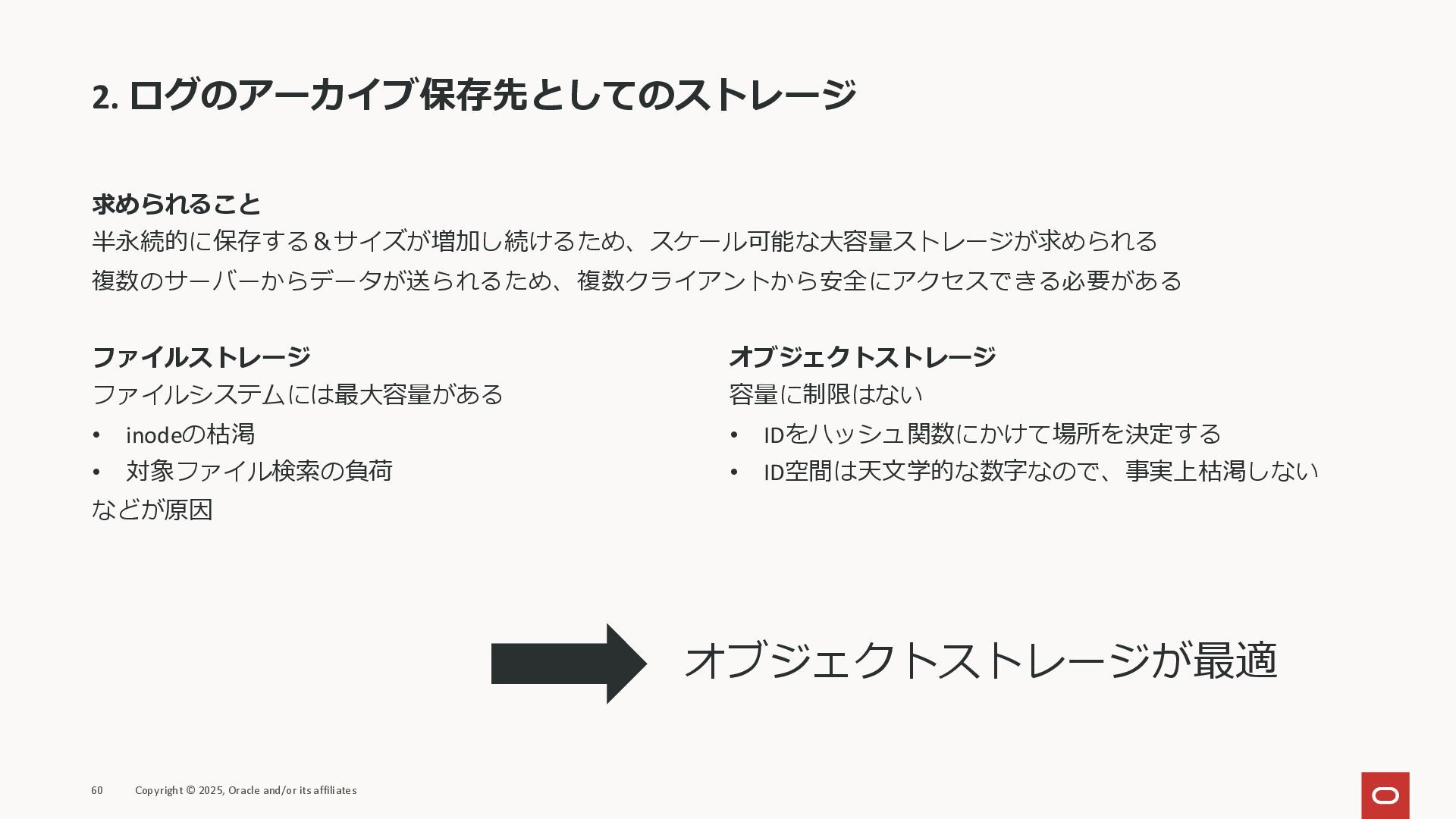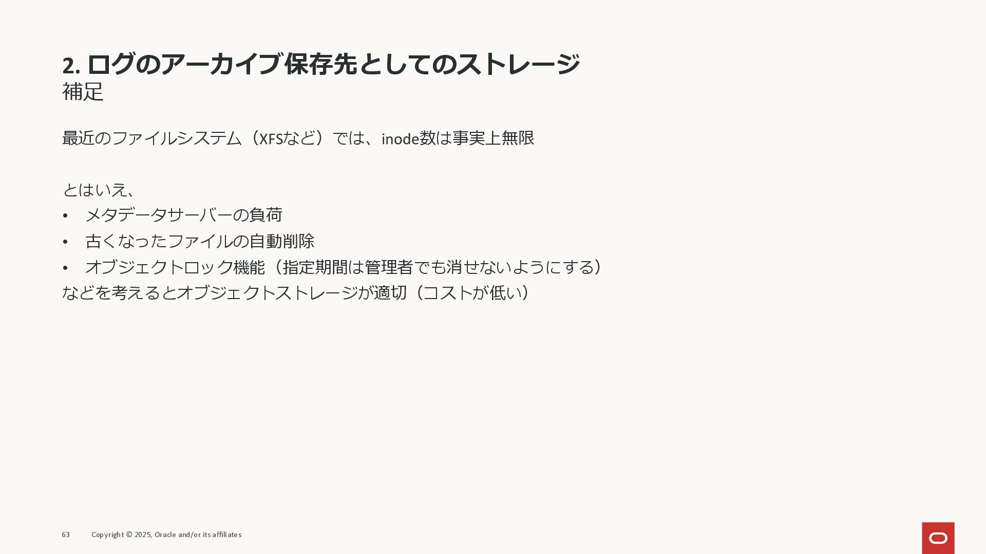 2. ログのアーカイブ保存先としてのストレージ 求められること 半永続的に保存する&サイズが増加し続けるため、スケール可能な大容量ストレージが求められる 複数のサーバーからデータが送られるため、複数クライアントから安全にアクセスできる必要がある 60 Copyright © 2025, Oracle