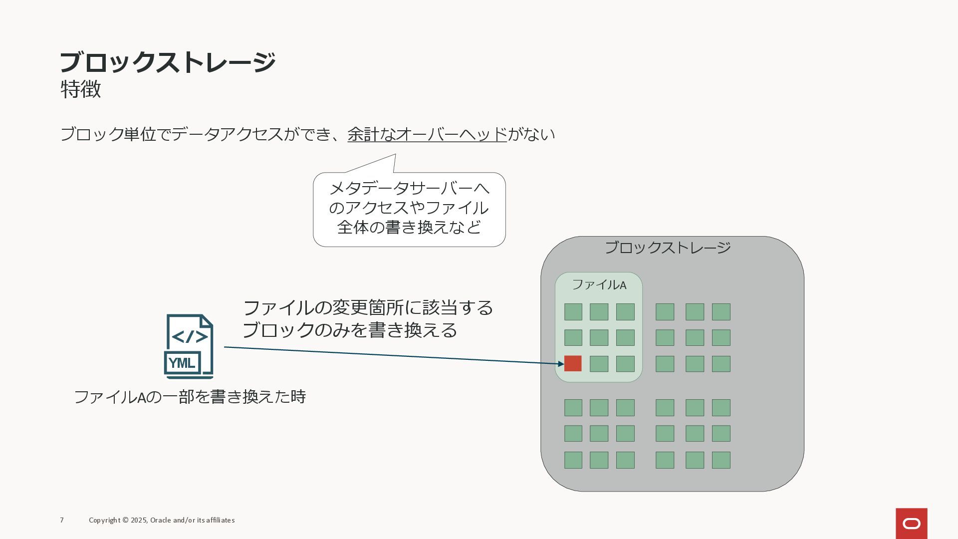 ブロックストレージ 特徴 ブロック単位でデータアクセスができ、余計なオーバーヘッドがない 7 Copyright © 2025, Oracle and/or its