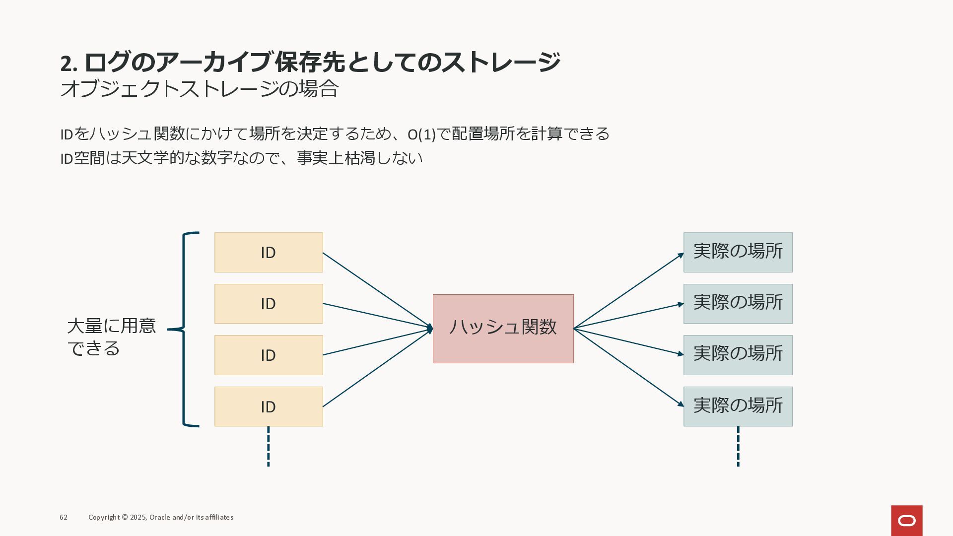 2. ログのアーカイブ保存先としてのストレージ オブジェクトストレージの場合 IDをハッシュ関数にかけて場所を決定するため、O(1)で配置場所を計算できる ID空間は天文学的な数字なので、事実上枯渇しない 62 Copyright © 2025, Oracle
