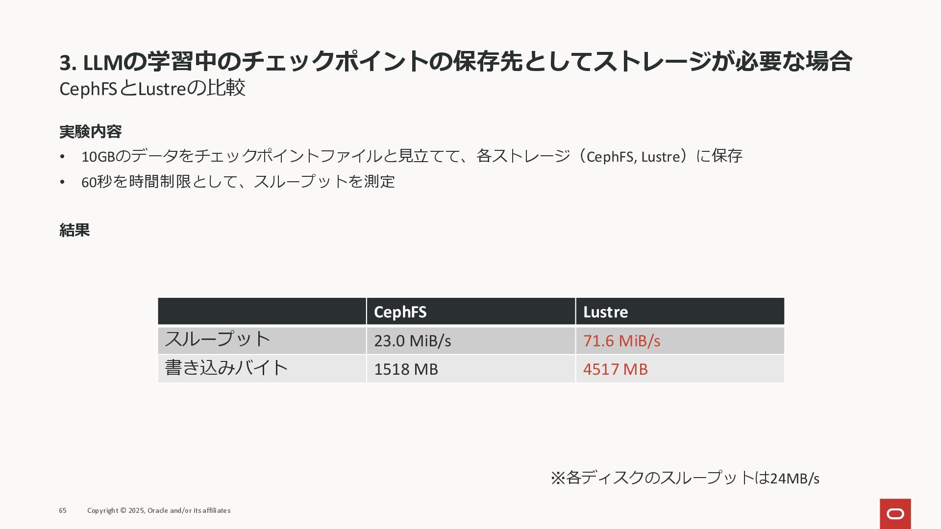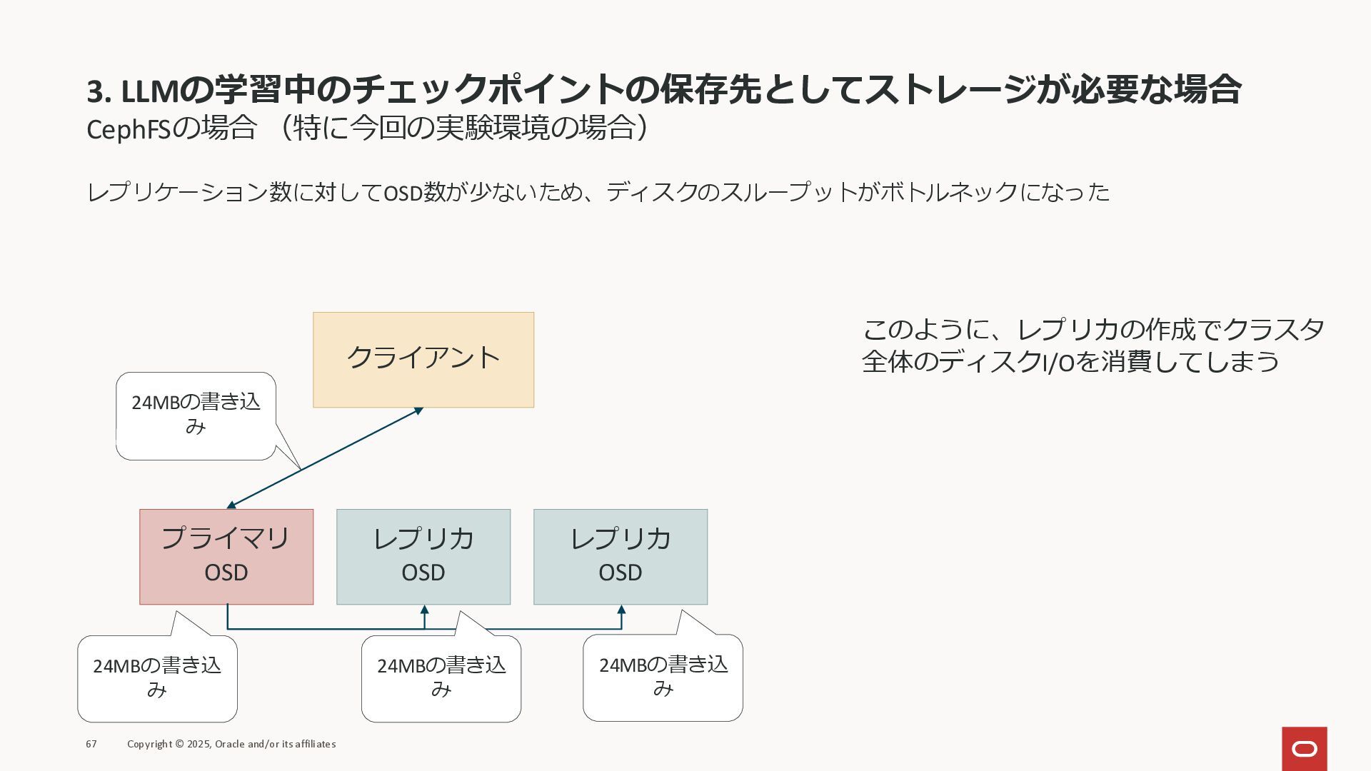 3. LLMの学習中のチェックポイントの保存先としてストレージが必要な場合 CephFSの場合 (特に今回の実験環境の場合) レプリケーション数に対してOSD数が少ないため、ディスクのスループットがボトルネックになった 68 Copyright © 2025, Oracle