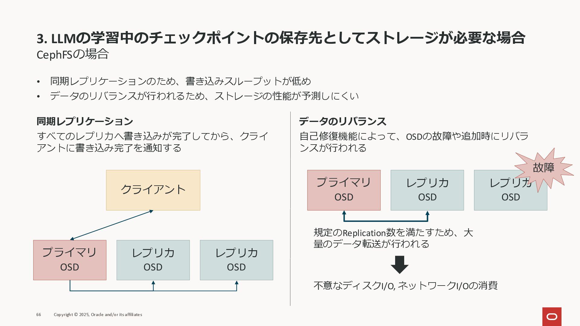 3. LLMの学習中のチェックポイントの保存先としてストレージが必要な場合 CephFSの場合 • 同期レプリケーションのため、書き込みスループットが低め • データのリバランスが行われるため、ストレージの性能が予測しにくい 66 Copyright ©