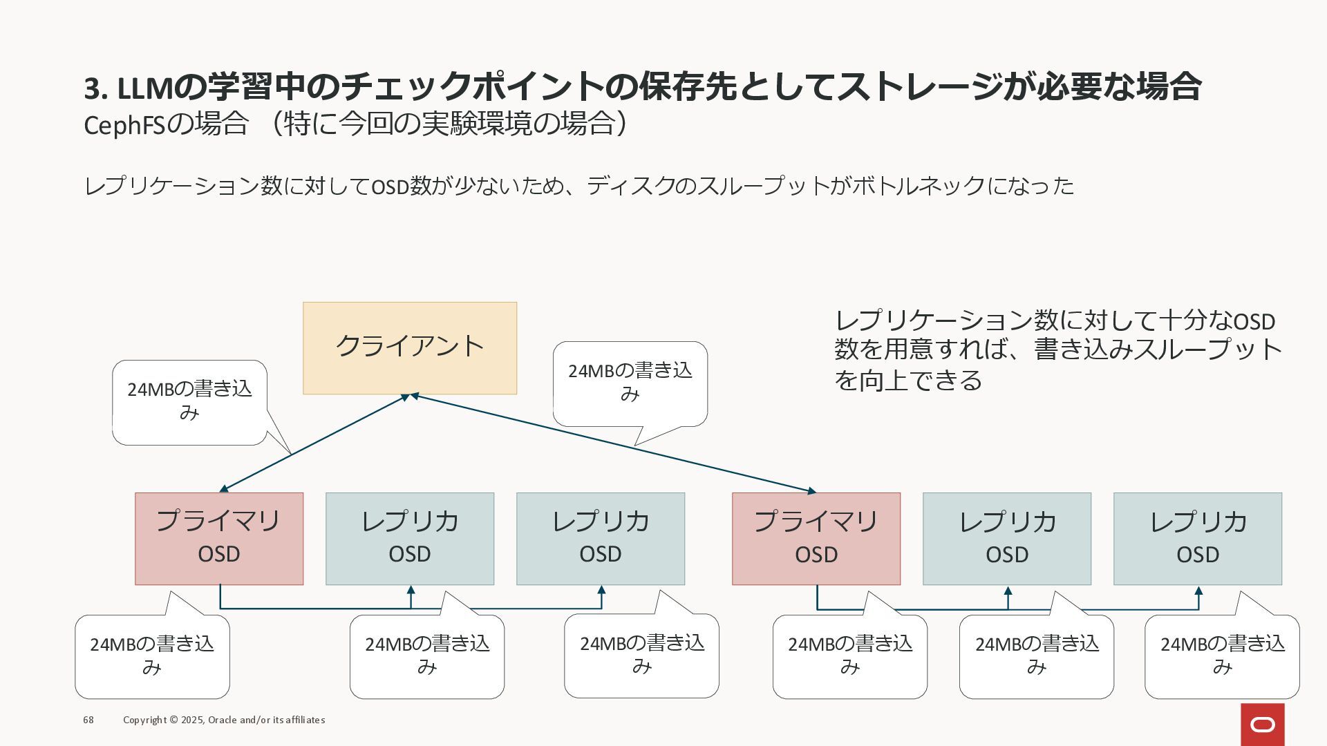 3. LLMの学習中のチェックポイントの保存先としてストレージが必要な場合 CephFSの場合 (特に今回の実験環境の場合) レプリケーション数に対してOSD数が少ないため、ディスクのスループットがボトルネックになった 67 Copyright © 2025, Oracle