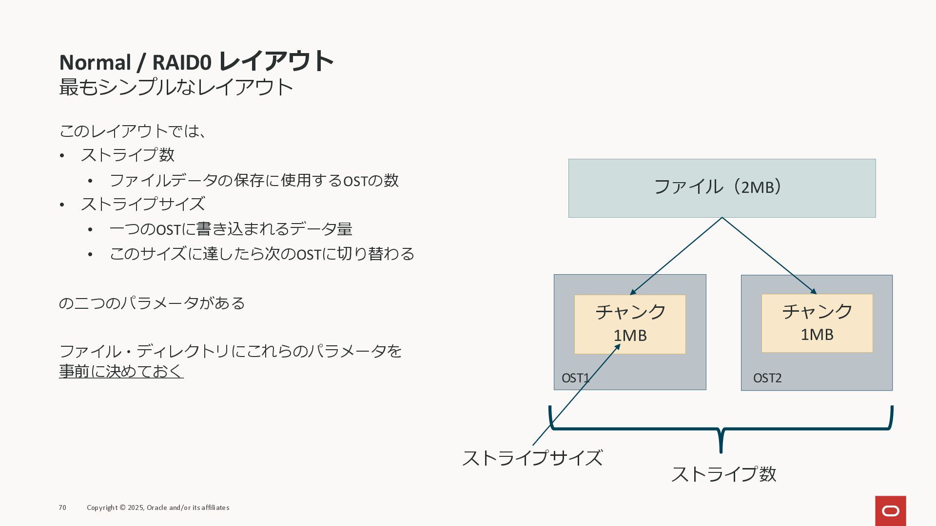 • ストライプサイズ • 一つのOSTに書き込まれるデータ量 • このサイズに達したら次のOSTに切り替わる の二つのパラメータがある ファイル・ディレクトリにこれらのパラメータを 事前に決めておく 70 Copyright © 2025, Oracle and/or its affiliates ファイル(2MB) チャンク 1MB チャンク 1MB OST1 OST2 ストライプ数 ストライプサイズ