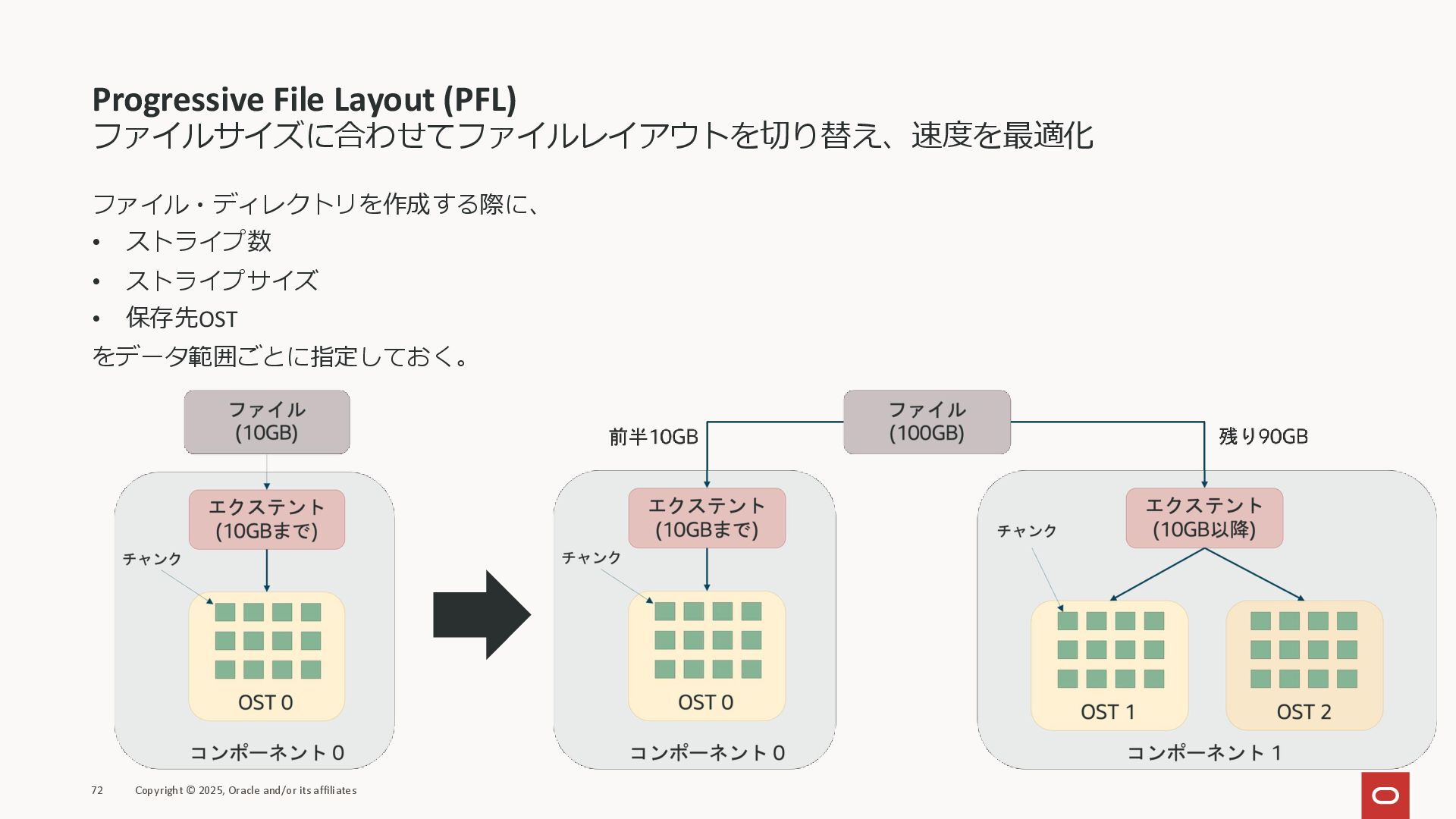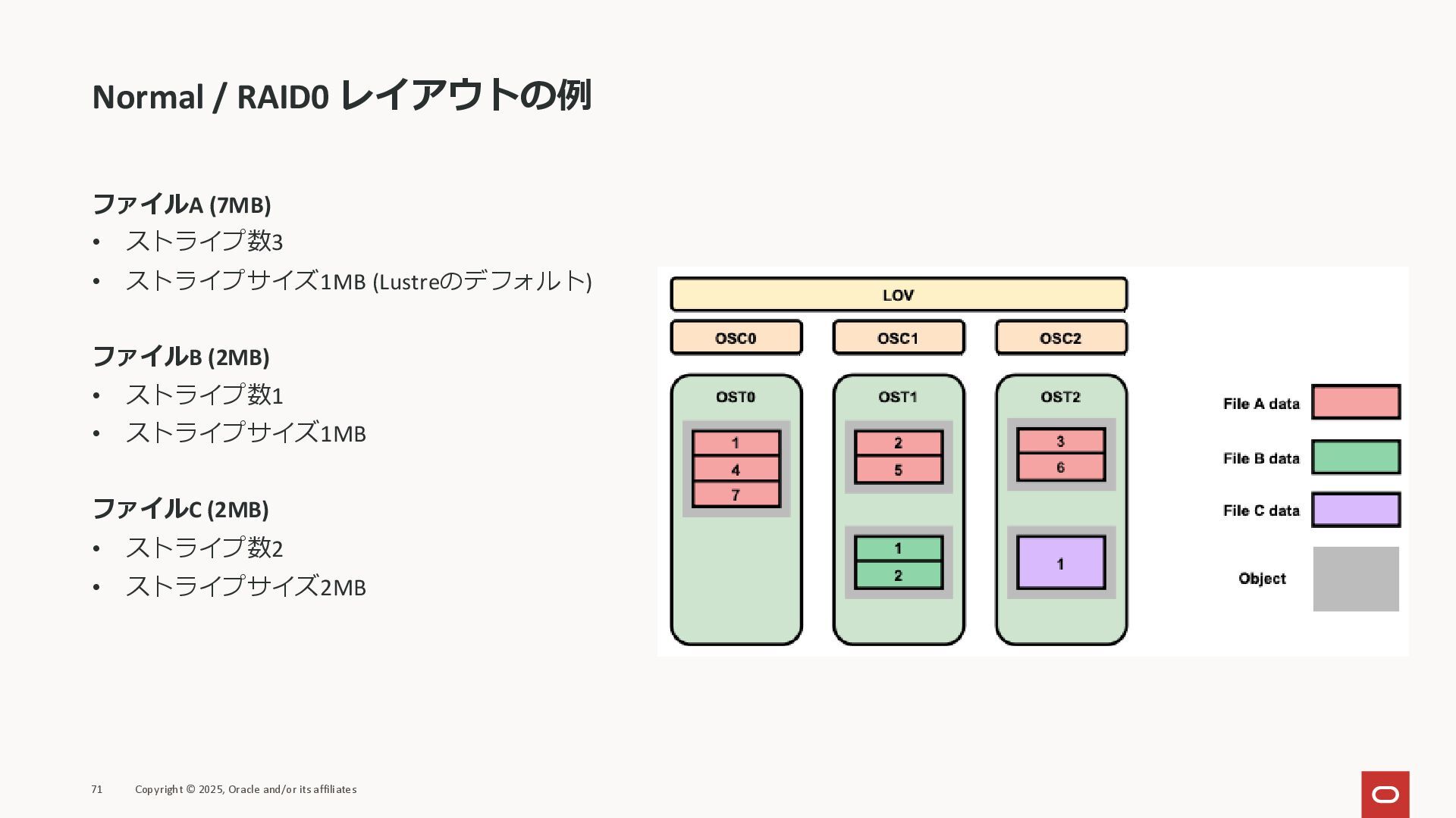 (Lustreのデフォルト) ファイルB (2MB) • ストライプ数1 • ストライプサイズ1MB ファイルC (2MB) • ストライプ数2 • ストライプサイズ2MB 71 Copyright © 2025, Oracle and/or its affiliates