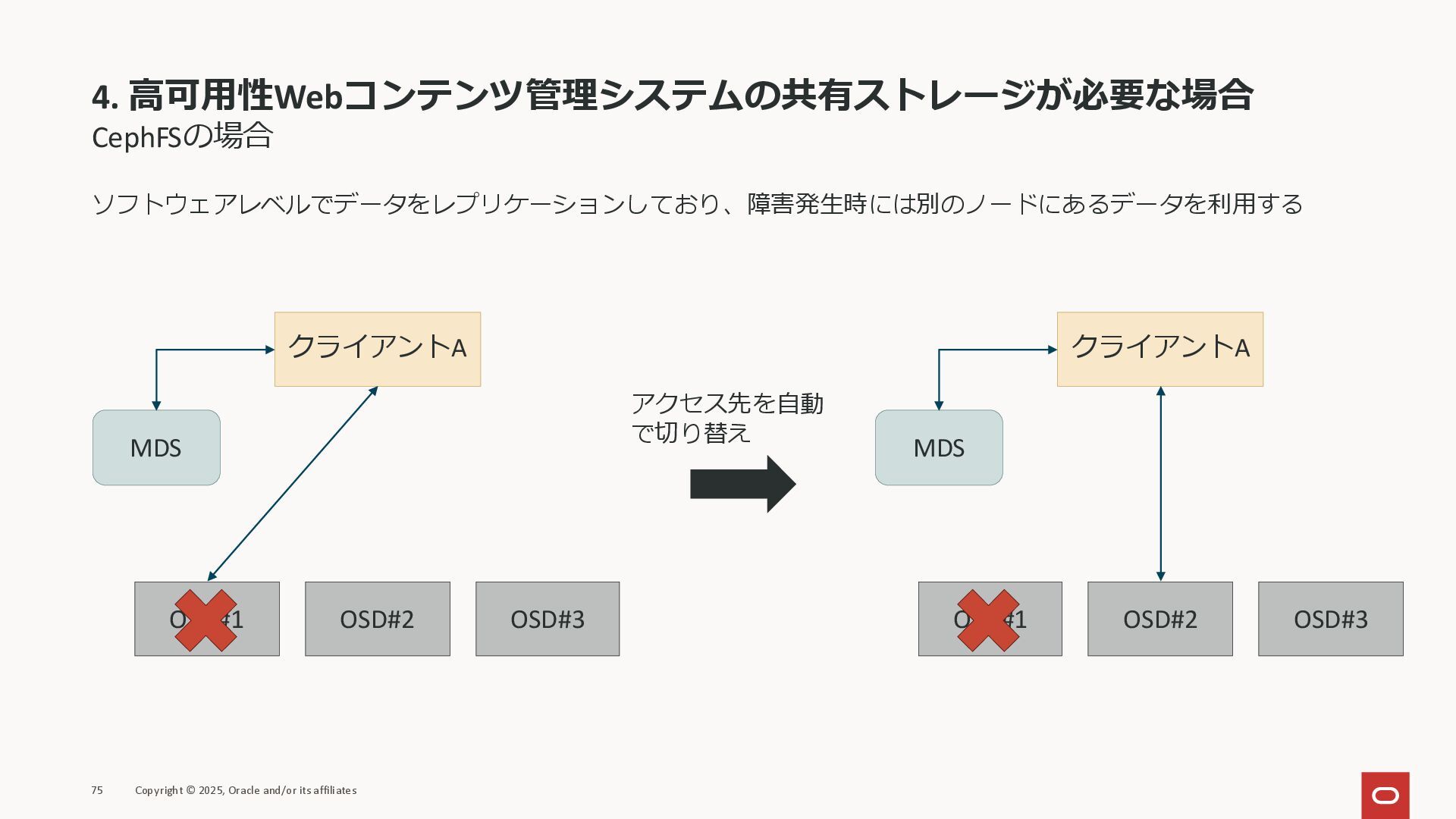 4. 高可用性Webコンテンツ管理システムの共有ストレージが必要な場合 CephFSの場合 ソフトウェアレベルでデータをレプリケーションしており、障害発生時には別のノードにあるデータを利用する 75 Copyright © 2025, Oracle and/or